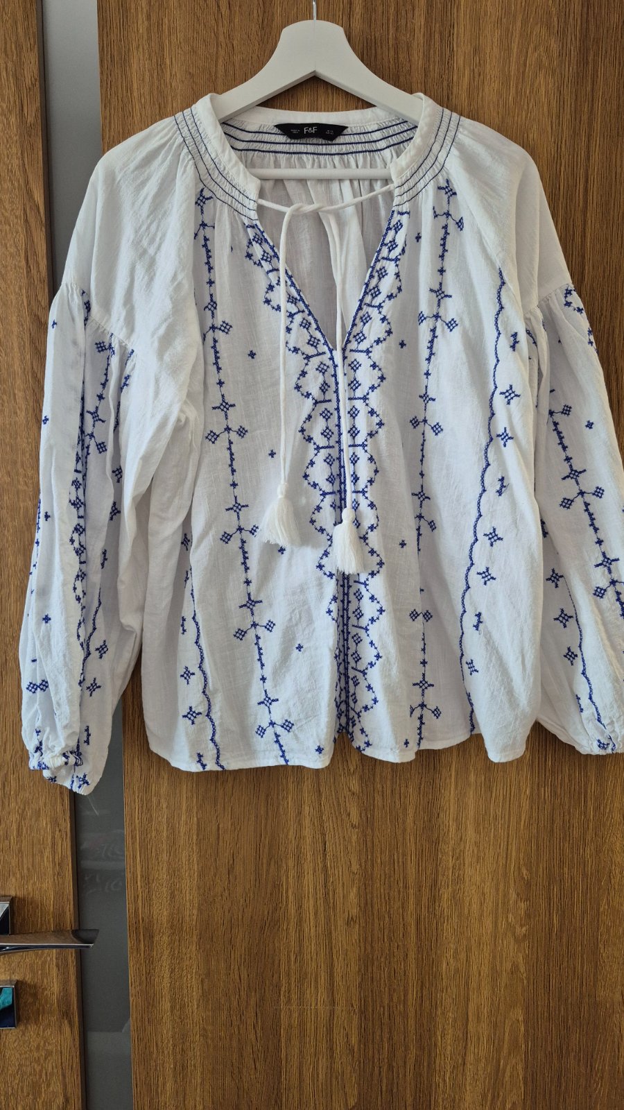Predam peknu bluzku znacky F&F,velkost 42 dlzka 57cm sirka 120cm rukav od pliec 47cm,ma peknu vysivku ,velmi dobre sedi na postave,na jar leto a jesen vyuzitelna,povodna cena 36 nova 15 vratane postovneho a balneho,platba vopred na ucet