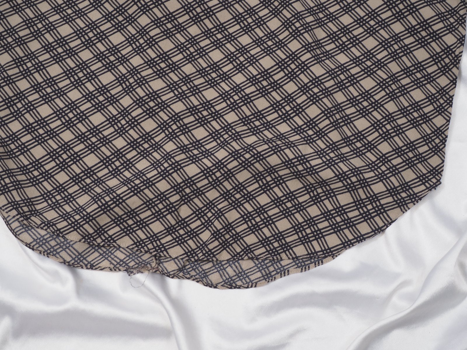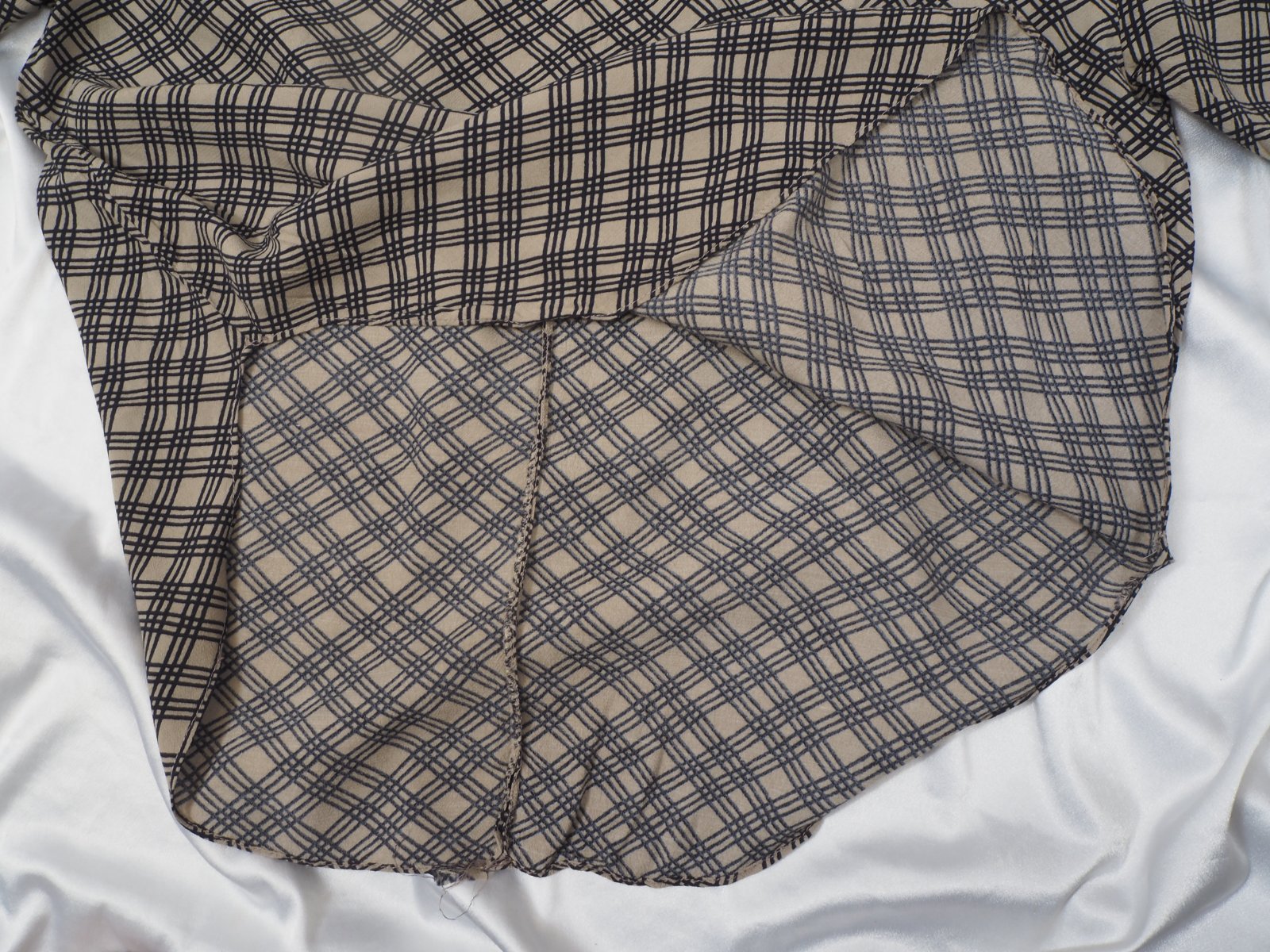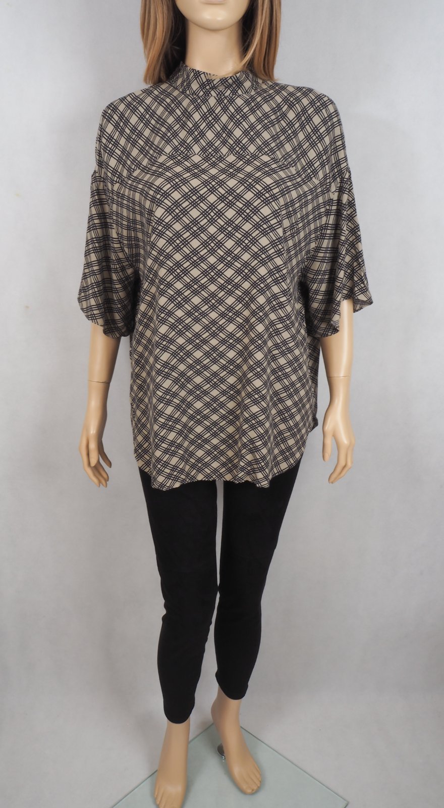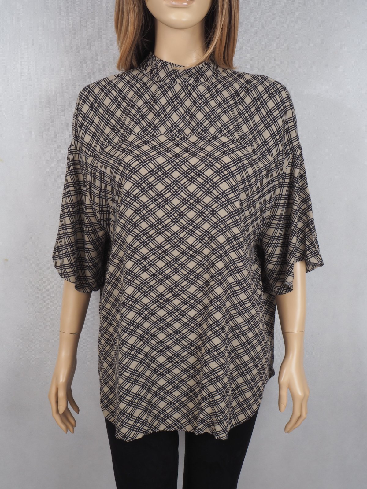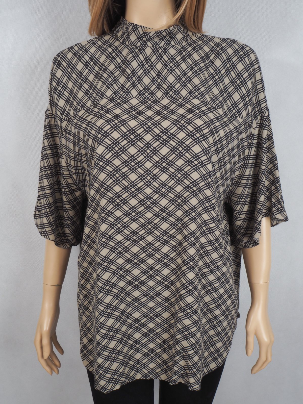 Kvalitná blúzka béžovej farby so vzorom, zapínanie vzadu na 2 malé gombíky, voľný strih, šitá do oblúčika, materiál 100% viskóza, super stav....veľ. píše S, sadné aj na M