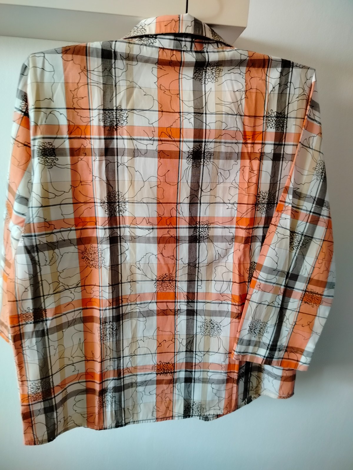 Predám veľmi pekne zachovalú, minimálne nosenú, takmer ako novú, dámsku blúzku/košeľu v atraktívnom retro vzore: veľké kvety (chryzantémy) + kocka/plaid v teplých odtieňoch oranžovej, broskyňovej, béžovej, hnedej a sivej.Klasický golier,