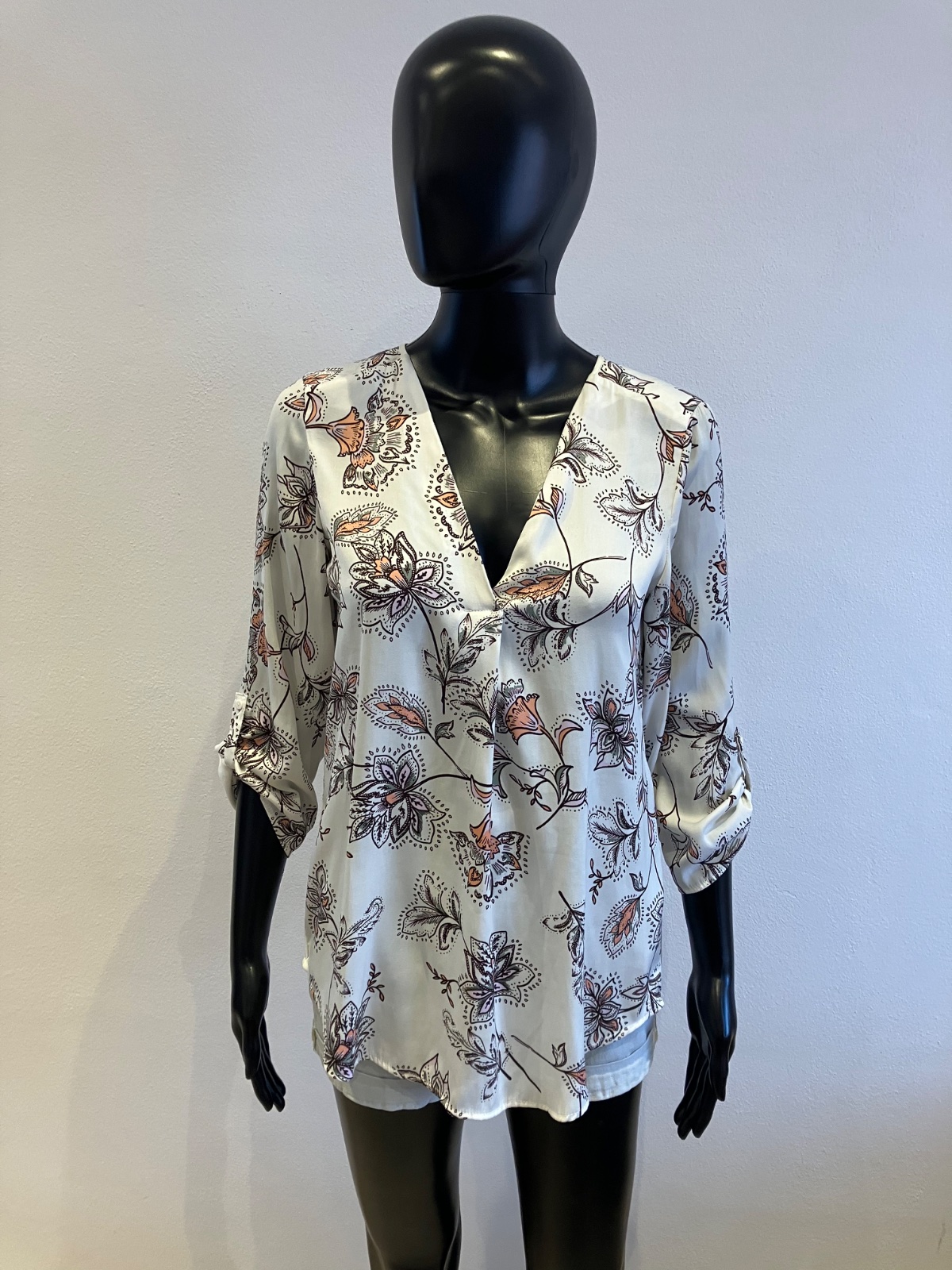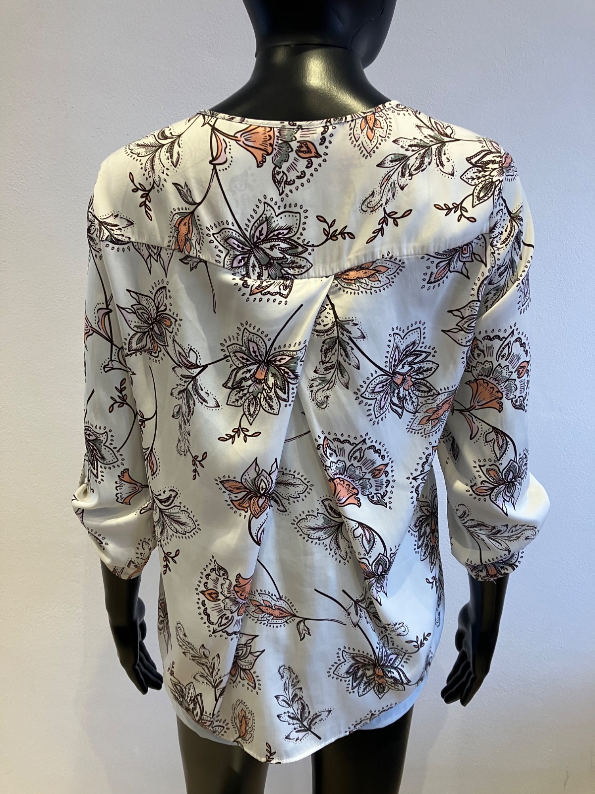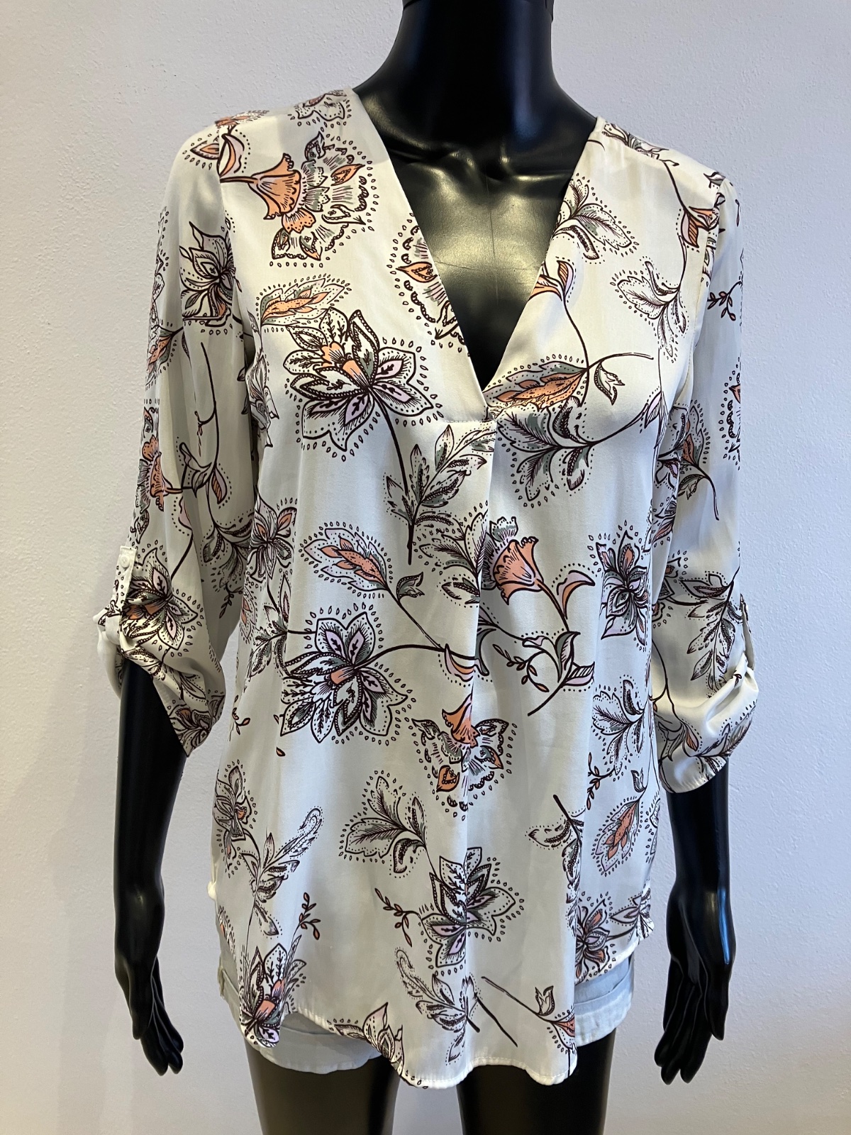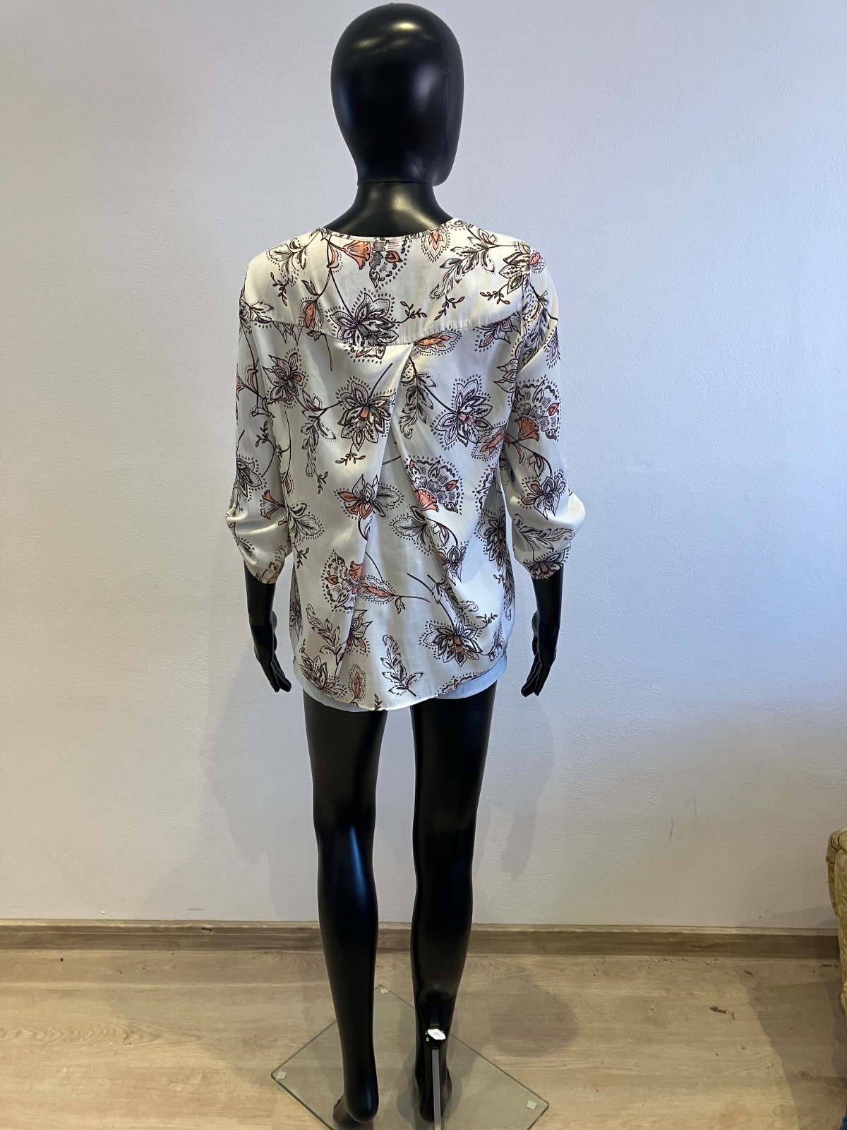Dámska blúzka s dlhým rukávom, roll up rukávy, tenká, nie je elastická, farba bielo-bordovo-sivo-ružová.