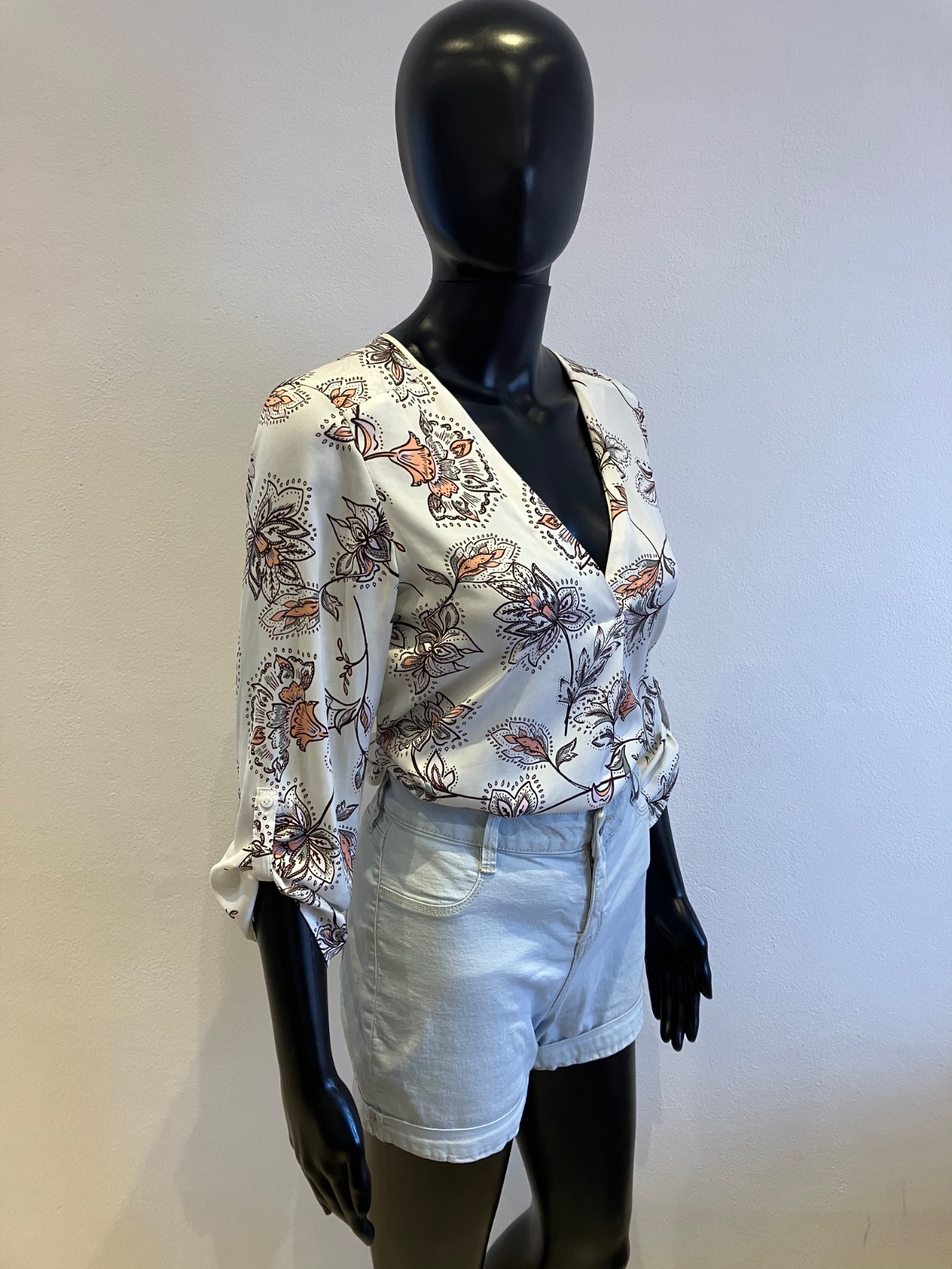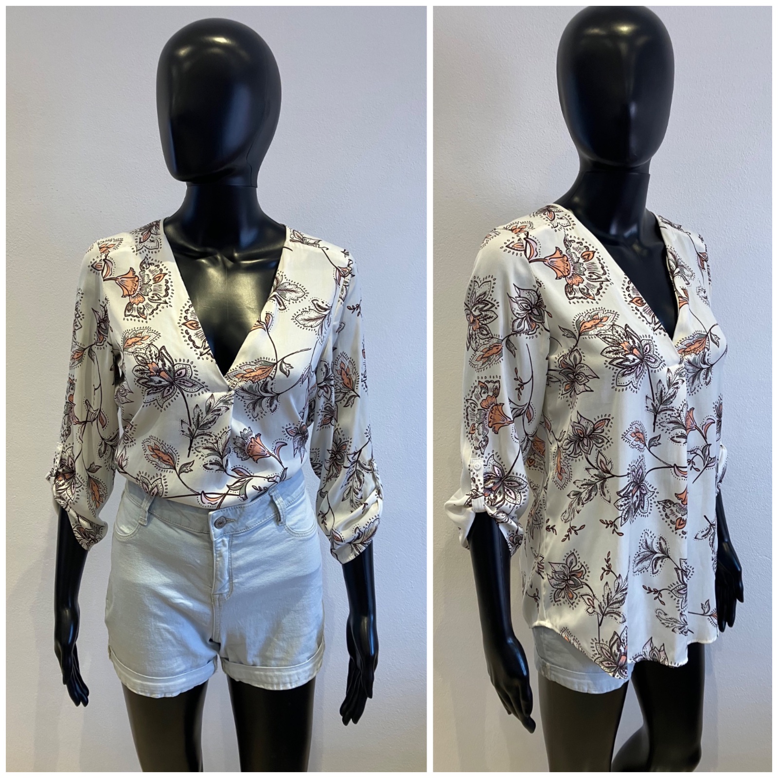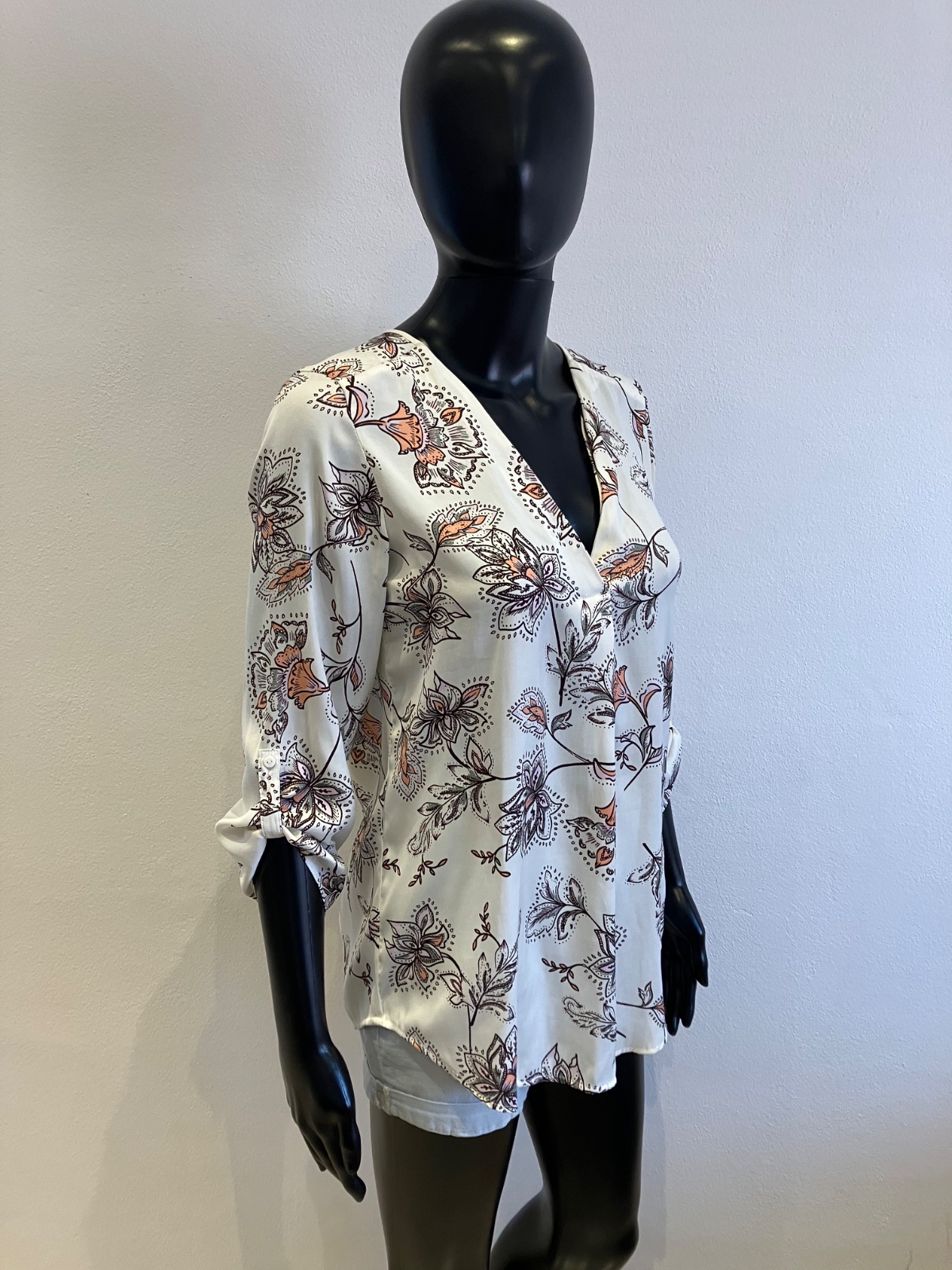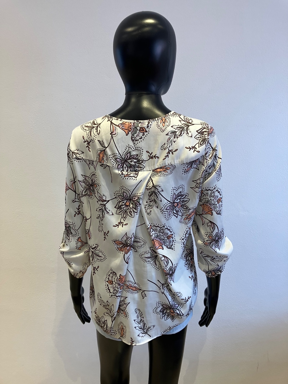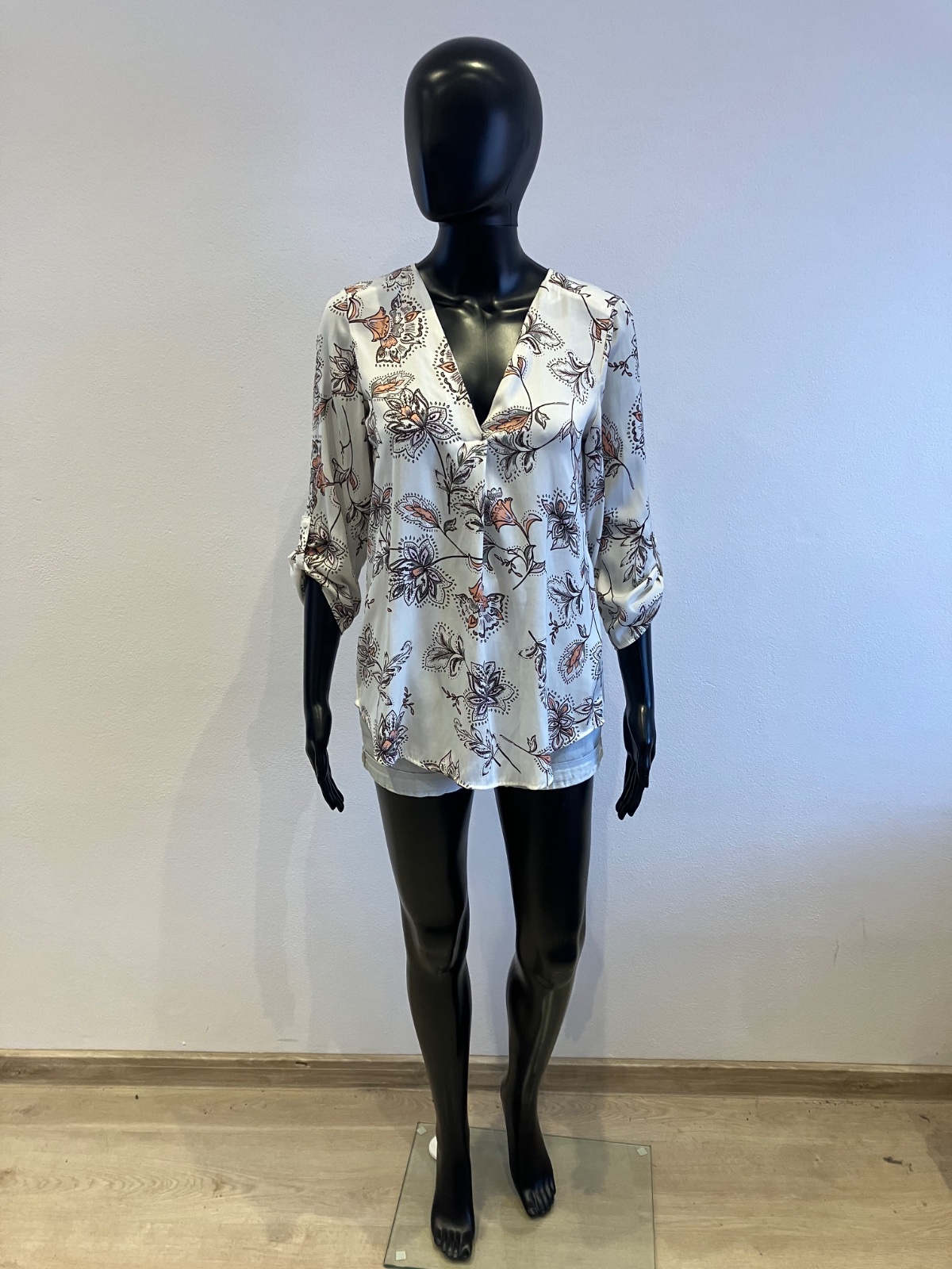 Dámska blúzka s dlhým rukávom, roll up rukávy, tenká, nie je elastická, farba bielo-bordovo-sivo-ružová.