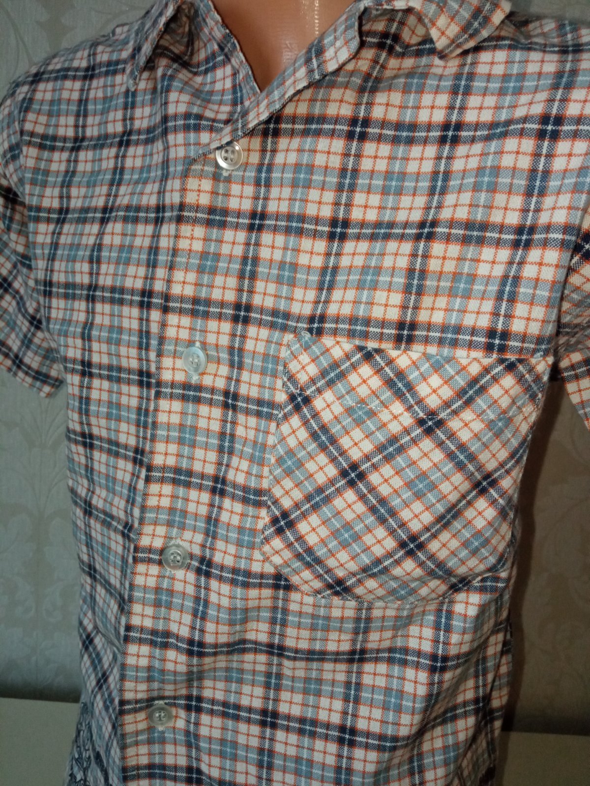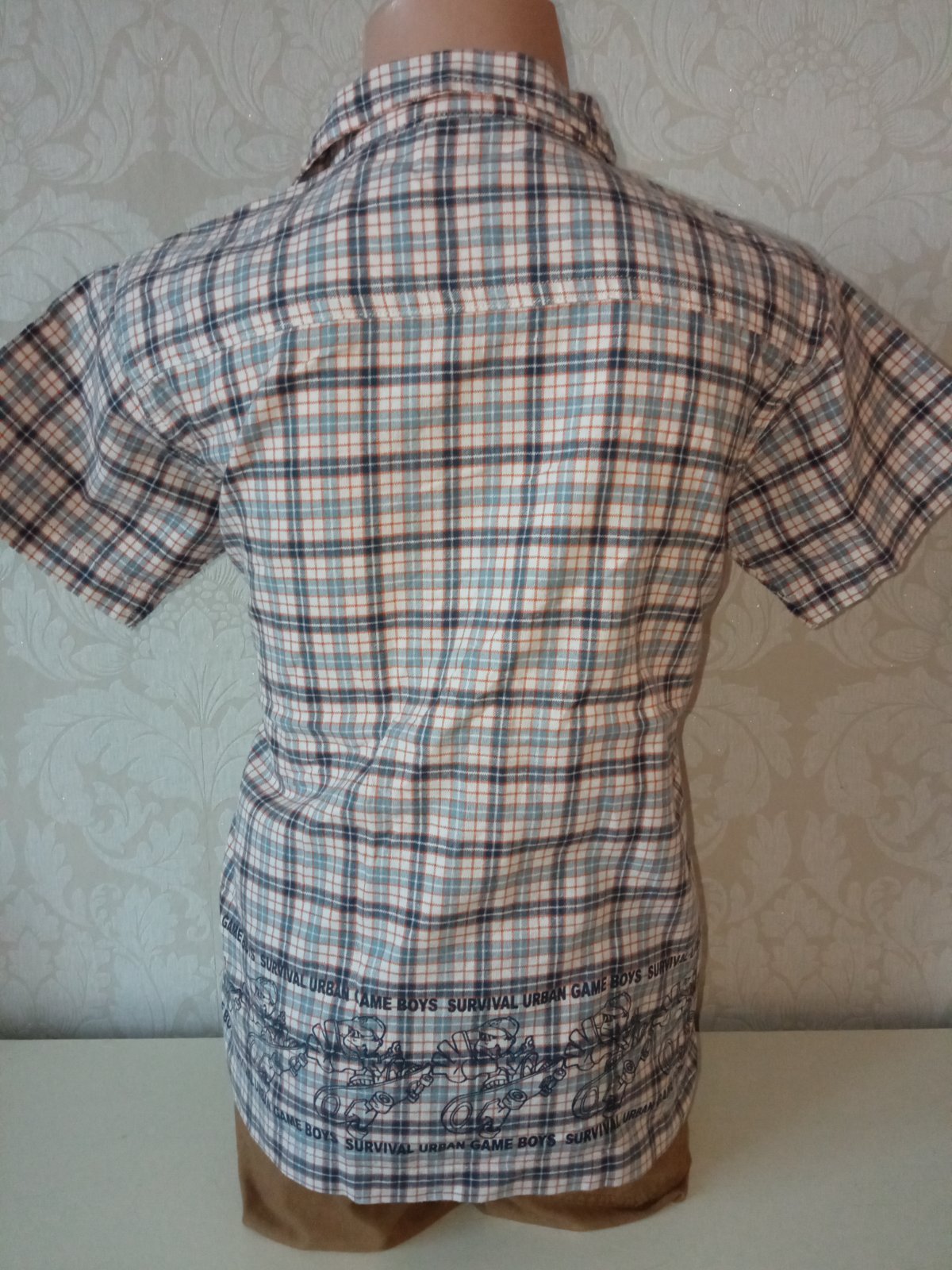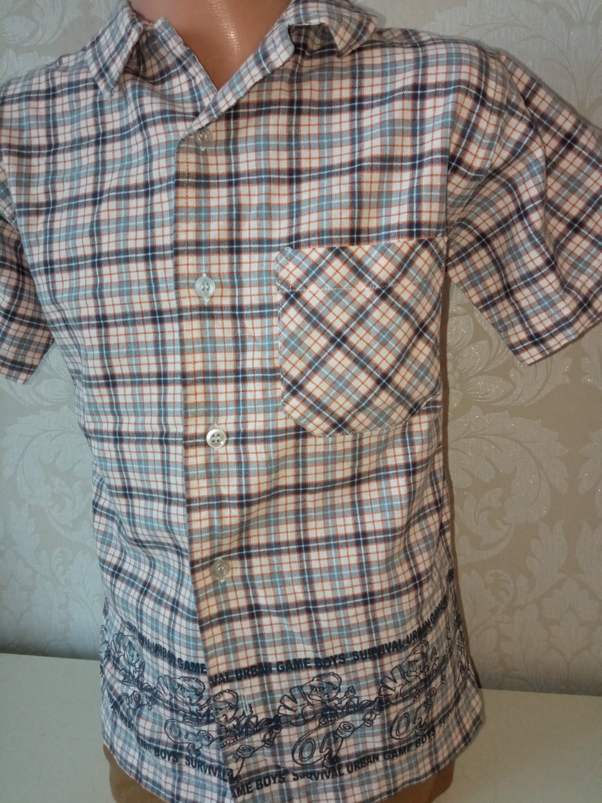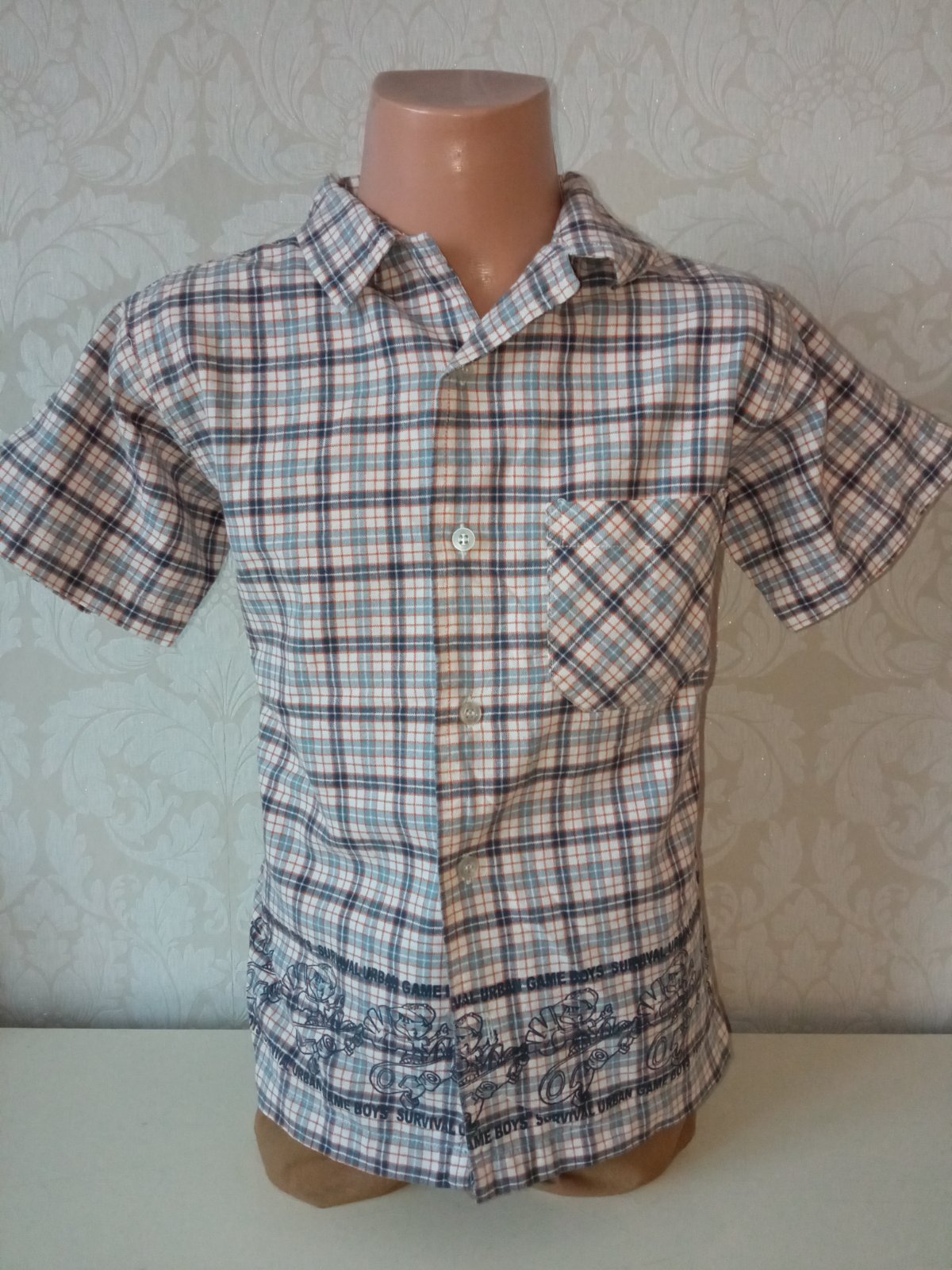 Chlapčenská košeľa s krátkym rukávom a golierom, potlač, zapínanie na gombíky, jedno vrecko na hrudi, materiál 100% bavlna.