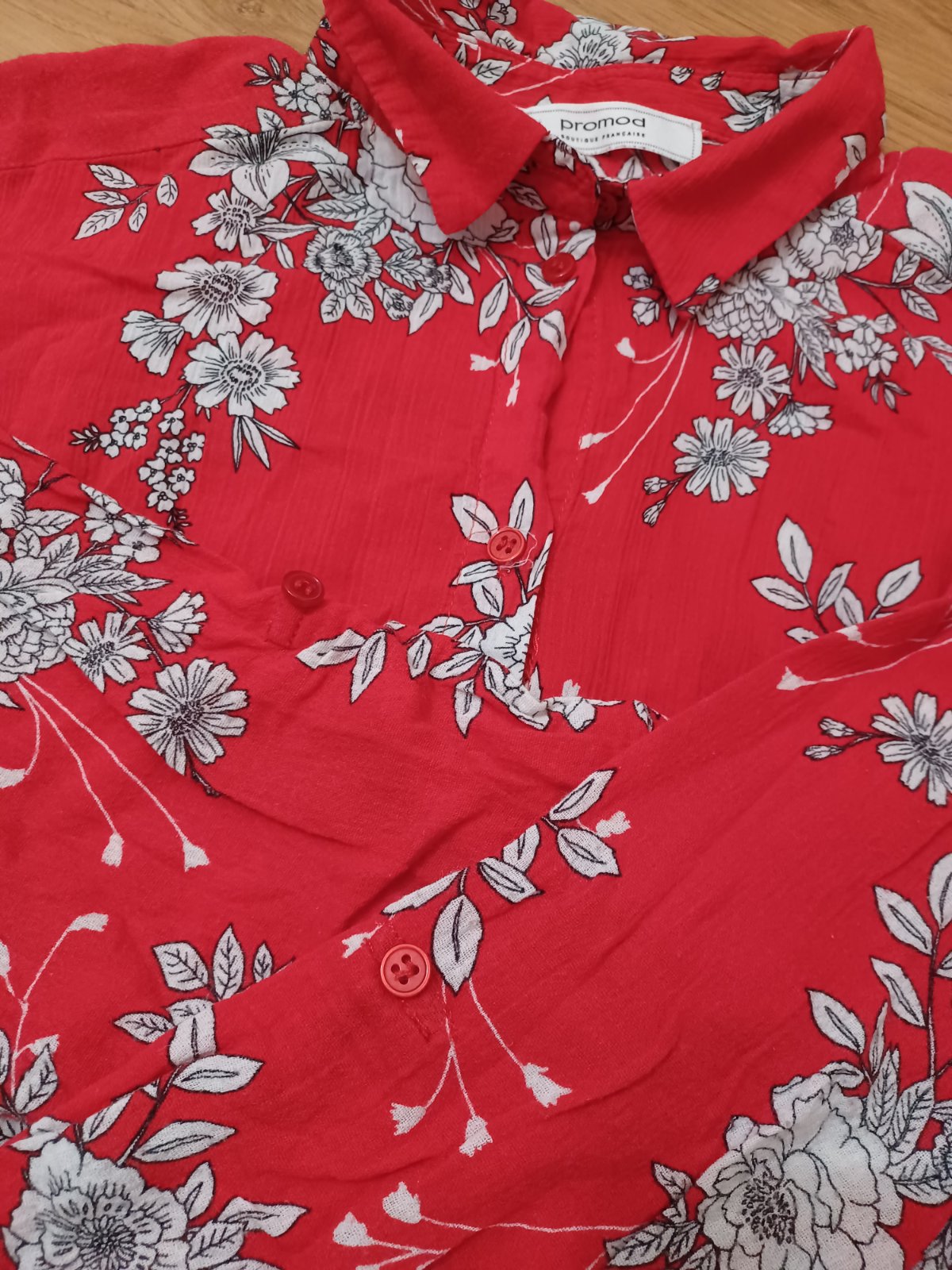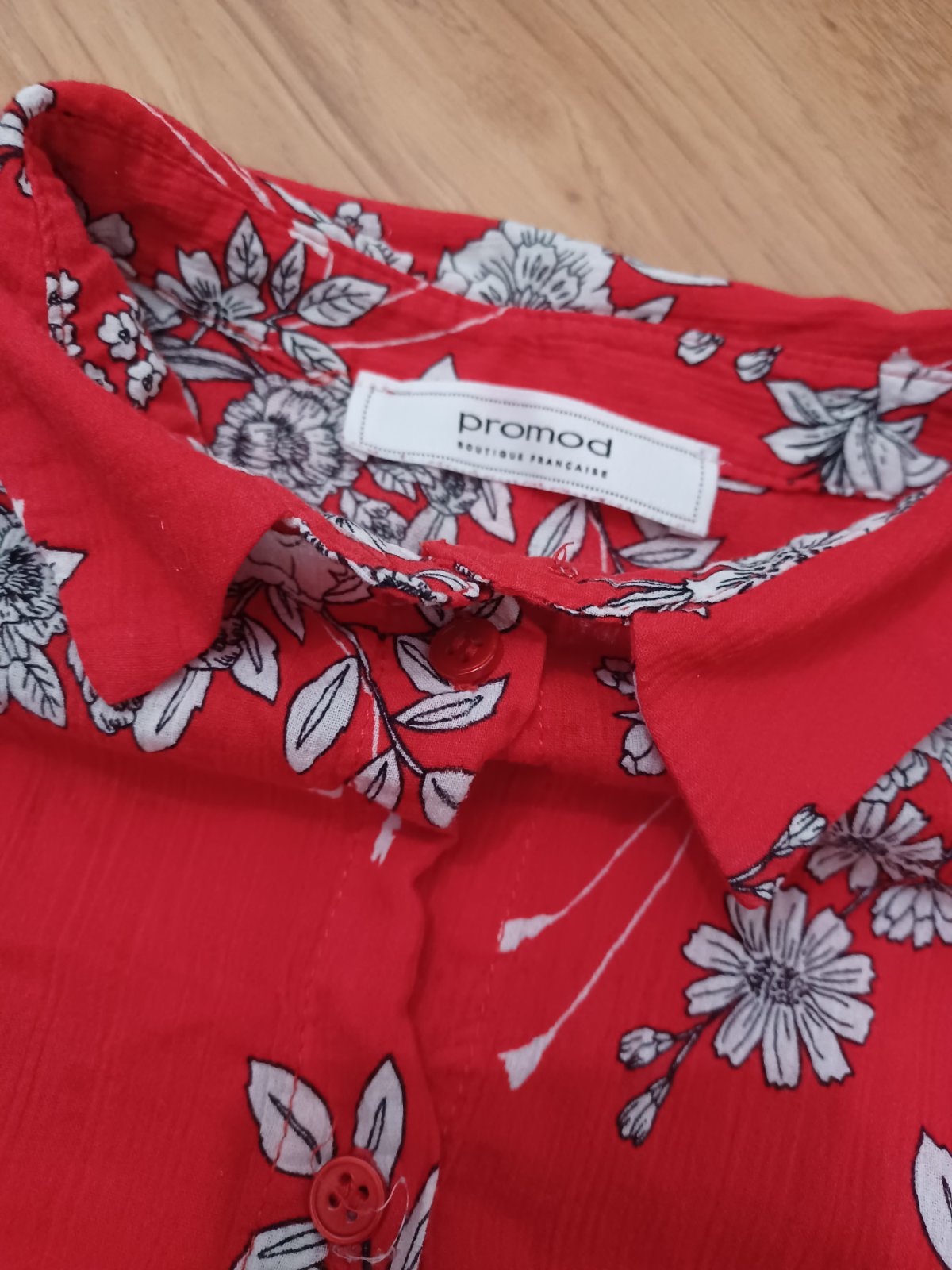 Blúzka/top, zn. promod, 3/4 rukáv ukončený gumičku, rovnako spodok do gumičky. Rozmery: obvod cez prsia 110cm, dĺžka 63 cm, ide o voľný strih, výstrih je okrúhly na viazanie. Materiál zmesový., p...