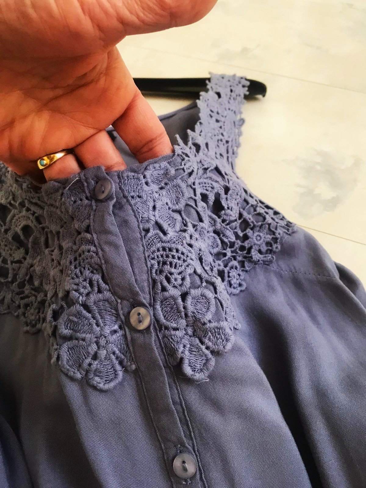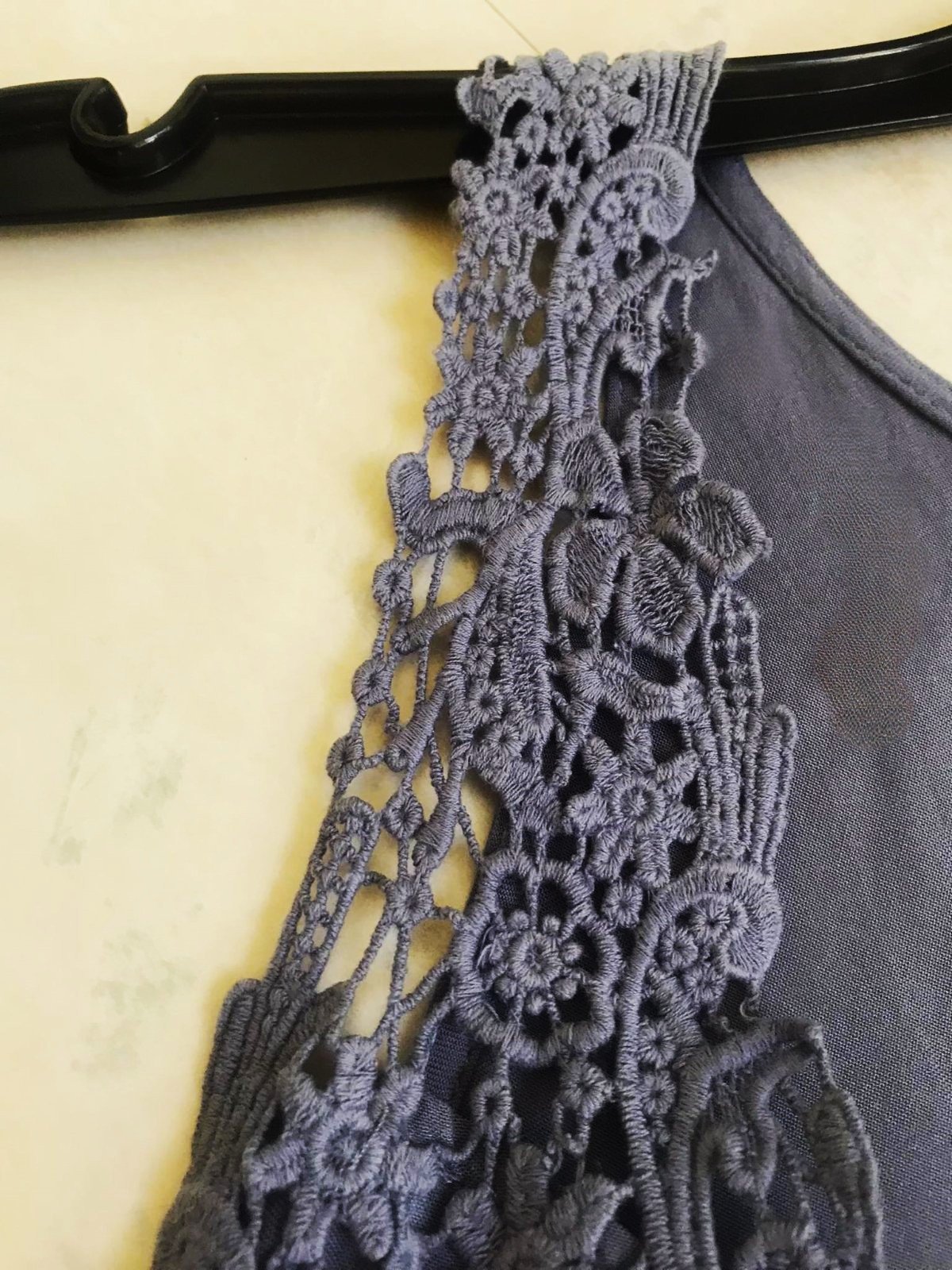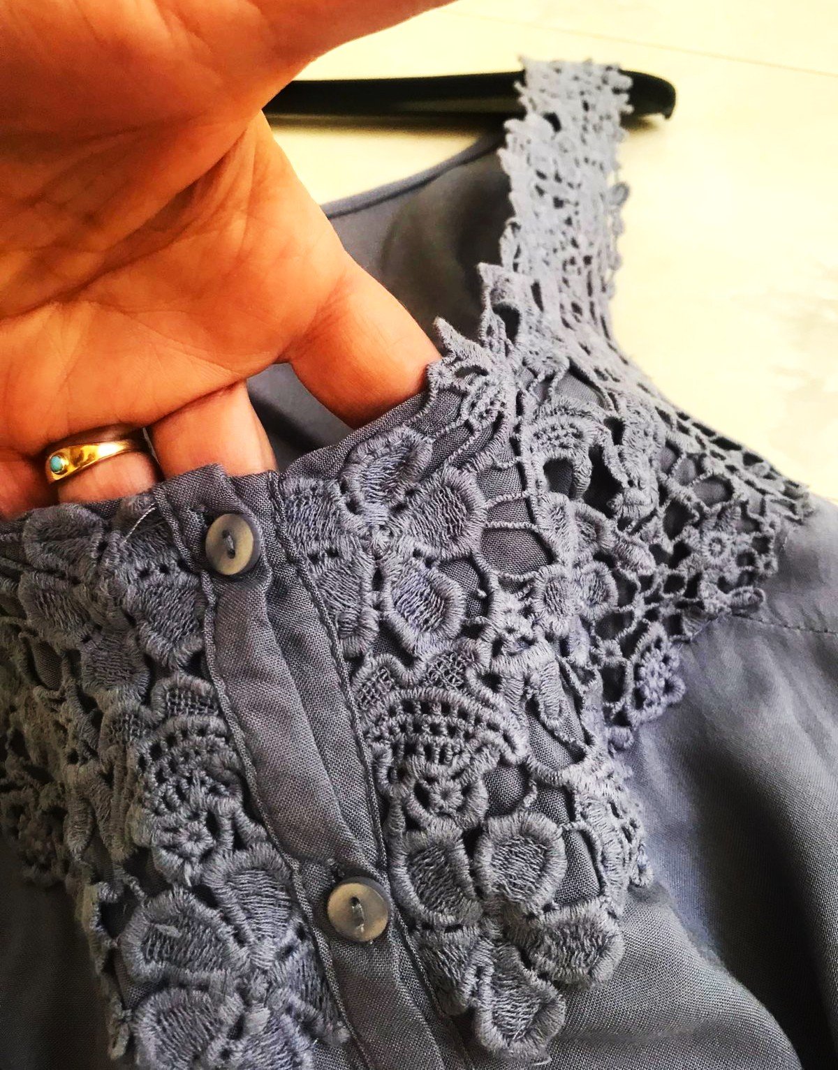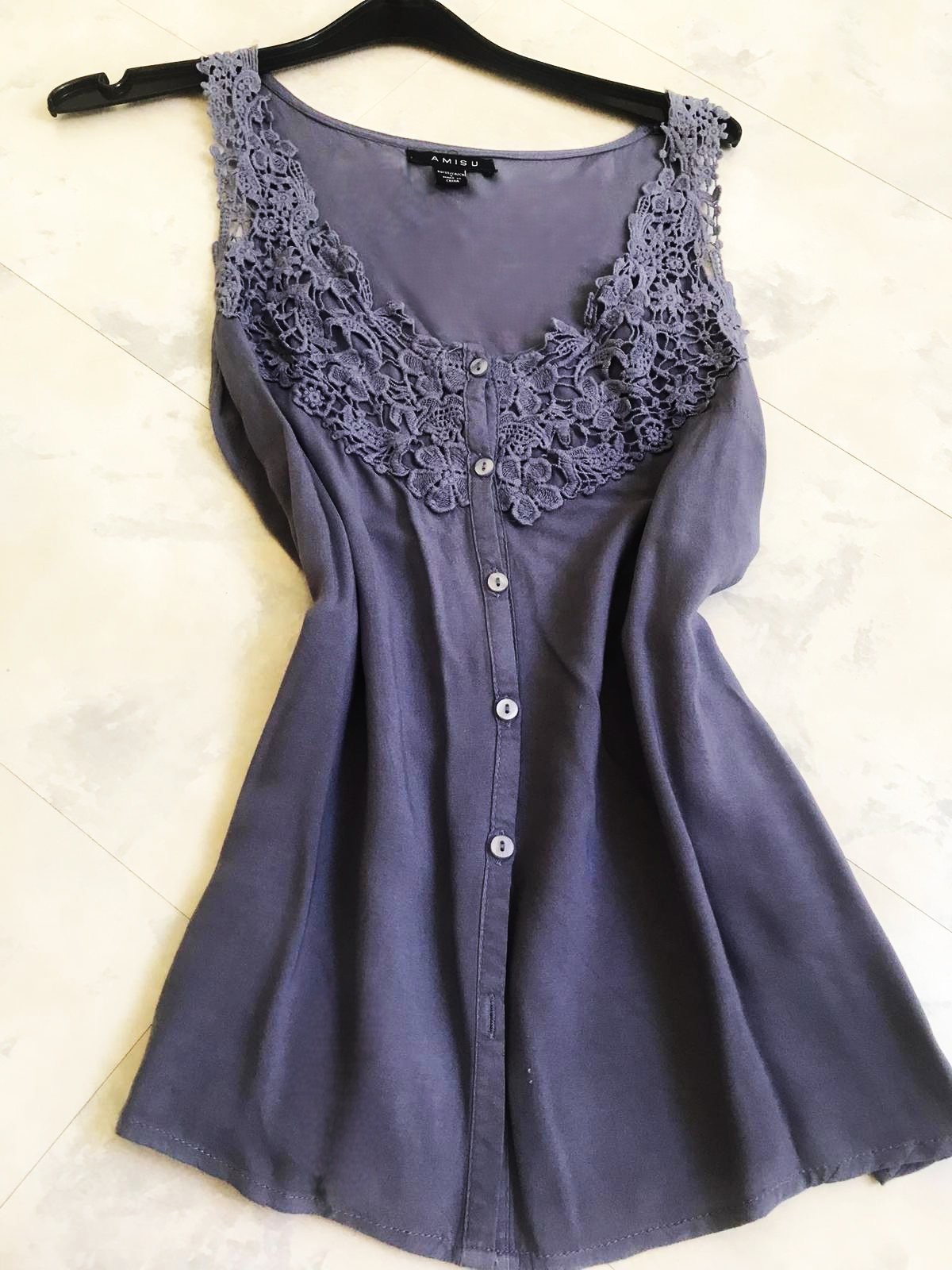 dámsky top značky Amisu s detailmi z makramé/ madeira vo výstrihu,voľnejší, áčkový strih, ideálny na leto - nosí sa voľné a široké, pekná oceľovomodrá farba,v top stave,materiál - naturálna padavá viskóza,dlžka celkom = 62 cm, dlžka meraná na bokoch od pazuchy smerom dolu = 37 cm, šírka meraná pod pazuchou = 43 x 2 cm &