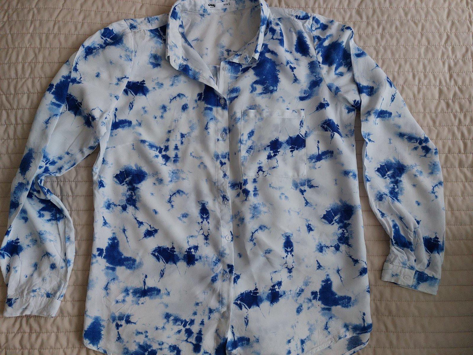 Bielomodra batikovana košeľa, viskóza, stav výborný, asi len raz oblečená, šírka 50, dĺžka 60, rukav od krku 66