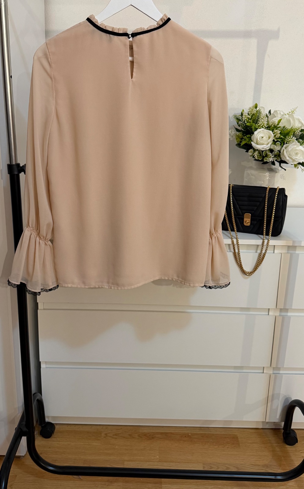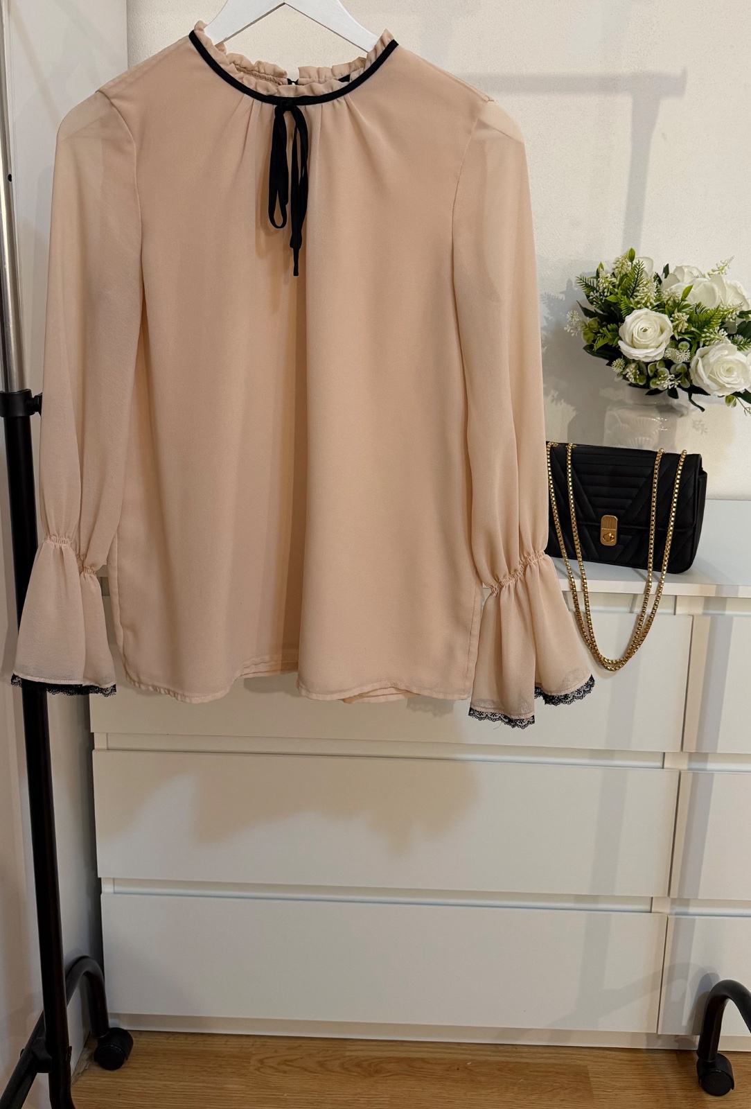 Romantický volánový golier s viazaním a rukávy zakončené jemnou čipkou dodávajú kúsku veľmi sofistikovaný a ženský vzhľad 🤍