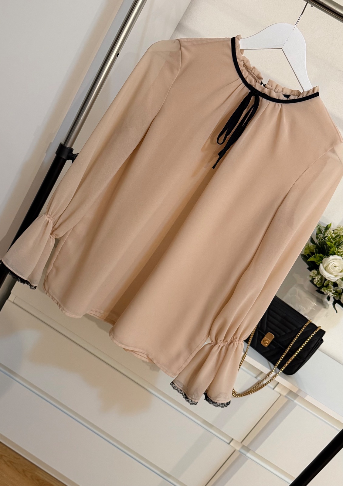 Luxusná elegantná blúzka značky KARL LAGERFELD Paris v jemnom nude odtieni s kontrastnými čiernymi detailmi ✨