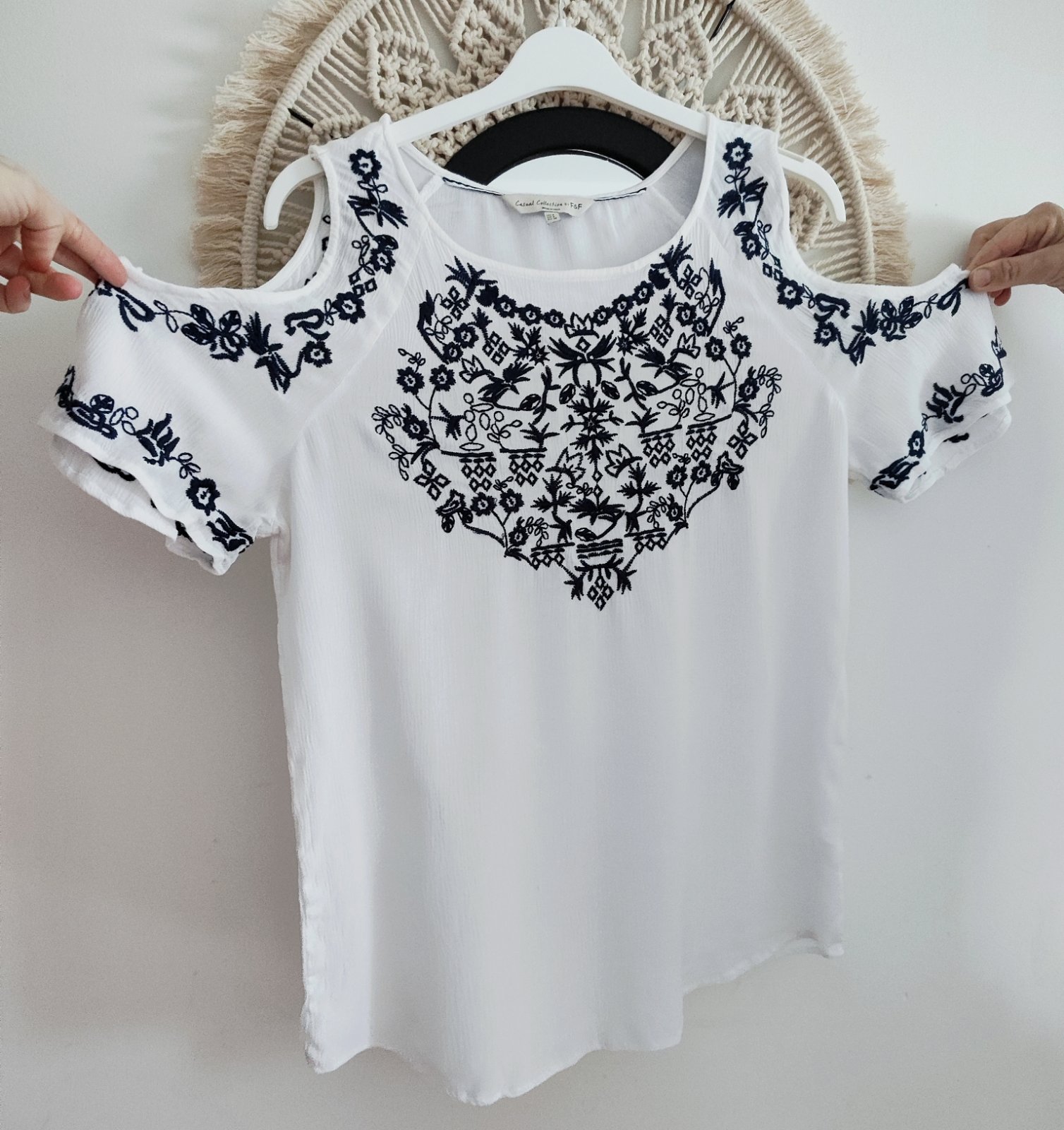 Predám túto zaujímavú blúzku vo vidieckom štýle s krásnou výšivkou,veľk. 38 ale sedí skôr na S , bavlnená , vrch sa dá nosiť spustená na ramenách, drží na gumičke, dĺžka 59cm, prsia 45cm, cena 8€ p...