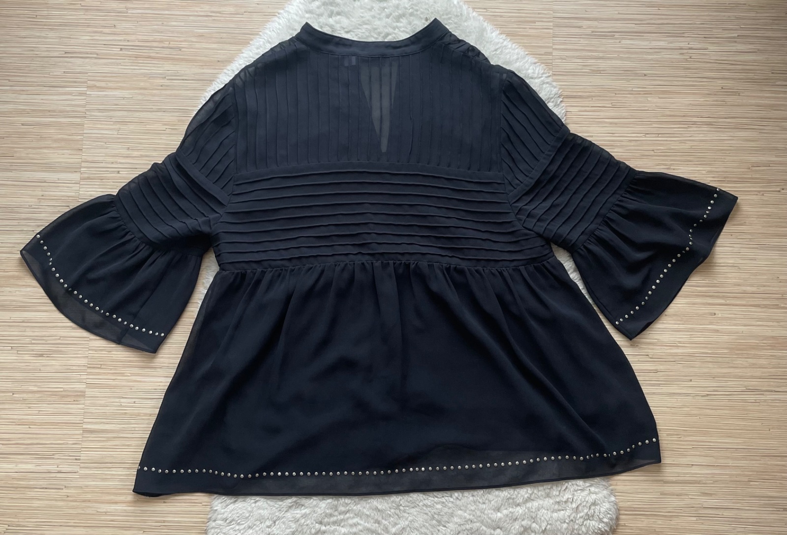 Cierna lahulinka bluzka volneho strihu s vybijanymi detailami, V vystrih, obzvlastnena o volankove rukavy, horna cast ma presivane detaily, je podsita, priesvitne su len rukavy