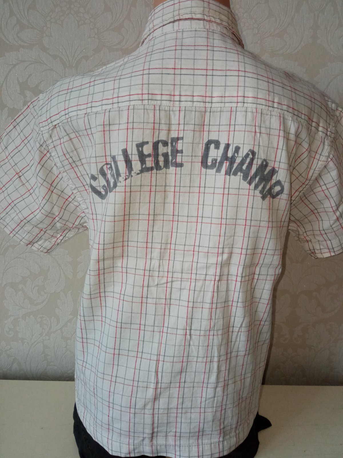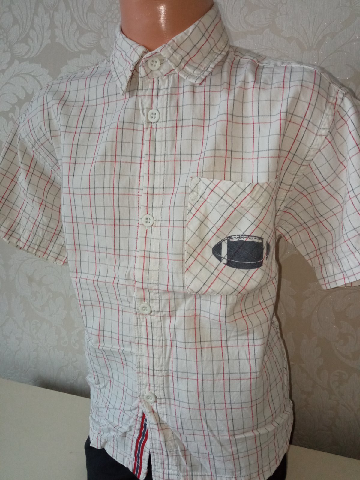 Chlapčenská košeľa s krátkym rukávom, s potlačou vpredu aj vzadu, zapínanie na gombíky, vrecko na hrudi, nie je elastická. Materiál:100%bavlna. Farba: bielo-červeno-sivá ,