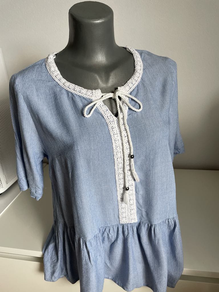 Je to ľahká blúzka s dlhšou zadnou časťou. Je to priesvitný materiál, je pod ňu potrebné tielko. Je bez poškodení;)