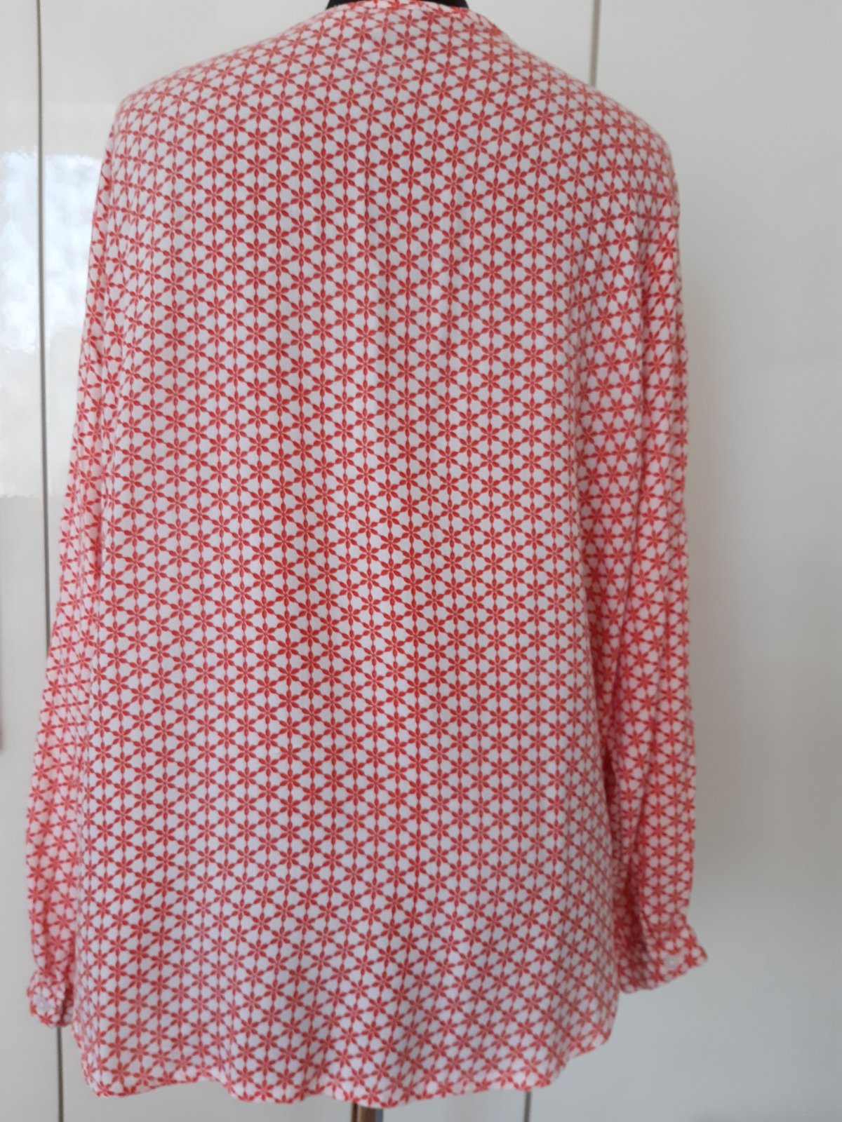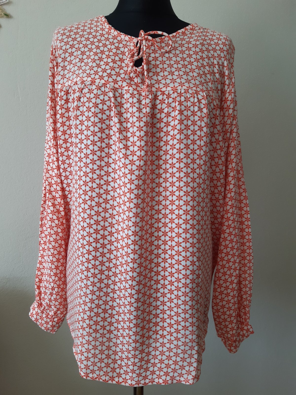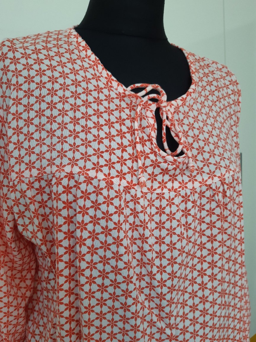 Farba je koralovo-ružova. Je to 100% viskóza. Dl.66 cm, dl. rukáva 60 cm, šírka cez prsia 62x2 cm, značenie je L, ale podľa mňa zodpovedá veľkosti 46. Blúzka je v dobrom stave, bez poškodenia.