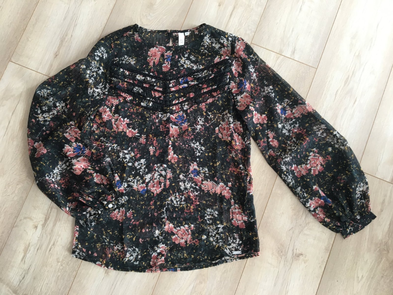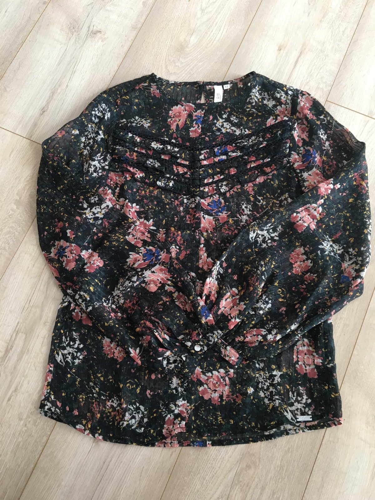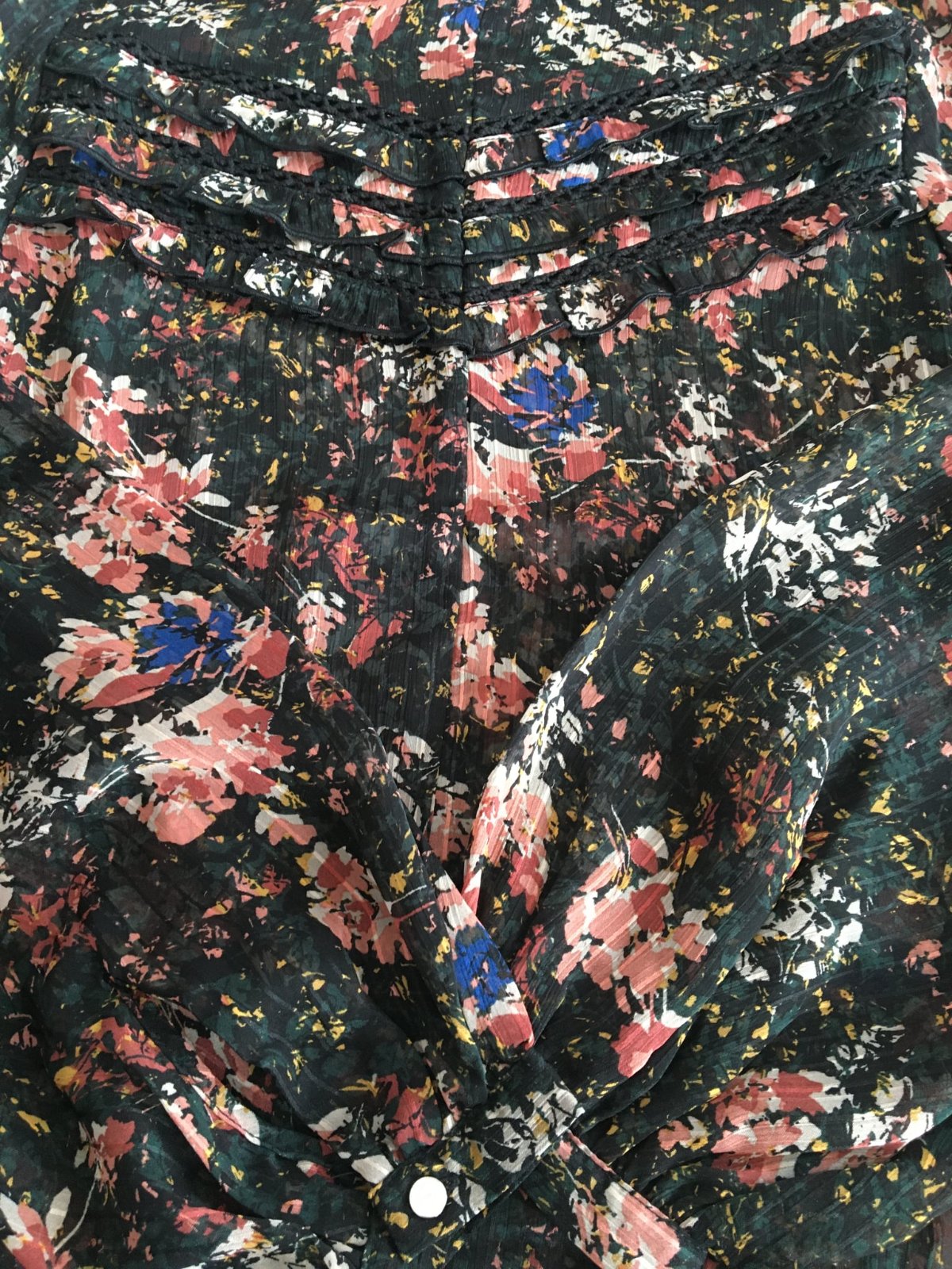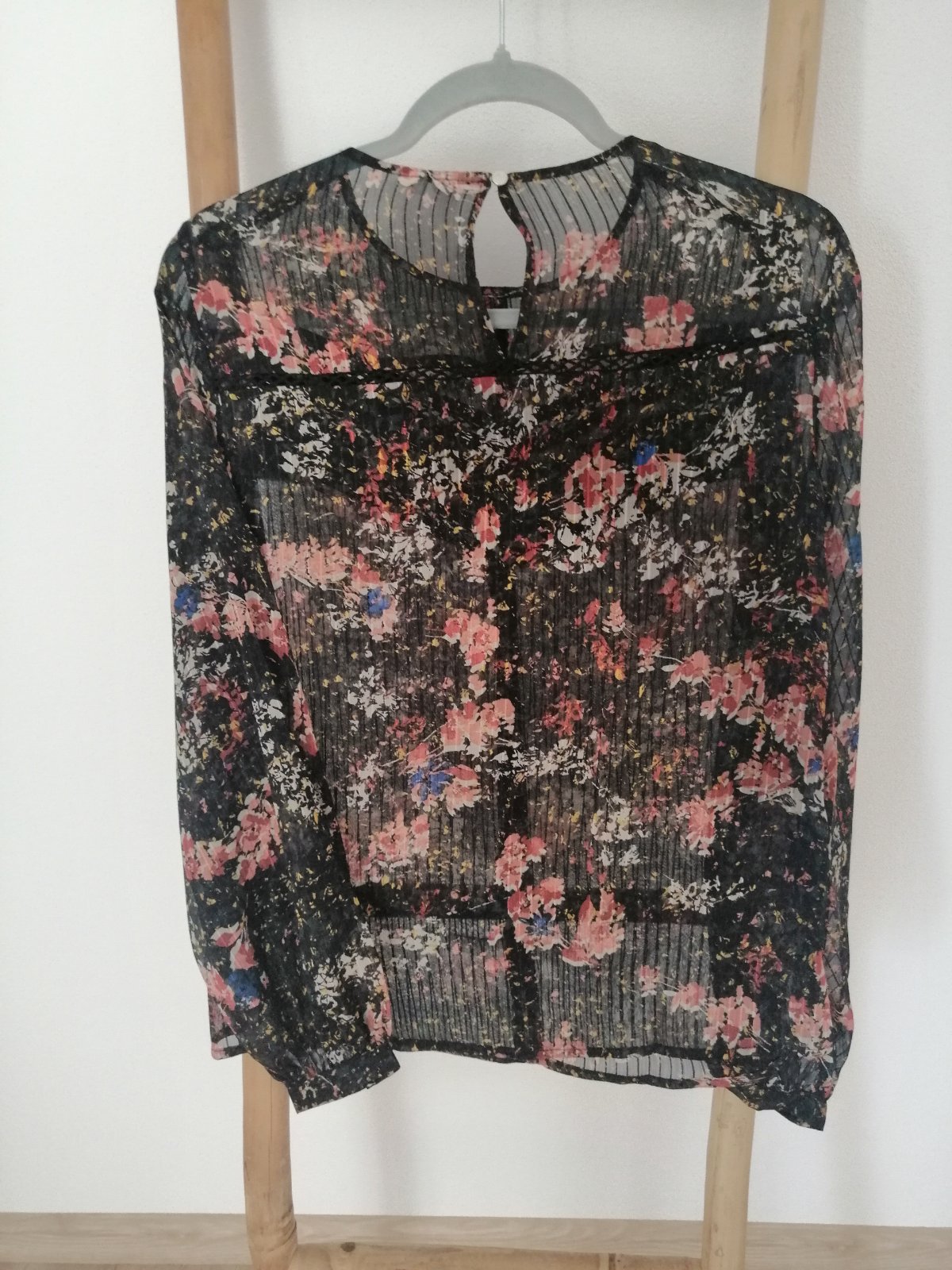 Dámska blúzka s kvetinovou potlačou. V oblasti pŕs je riasenie striedané s čipkou. Rukáv je na gombík. V zadnej časti je tiež gombík.