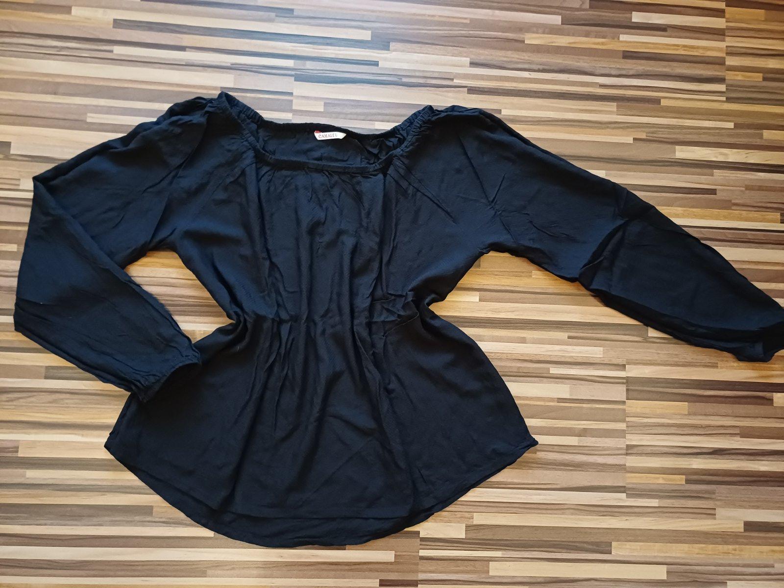 Ľahká, letná, čierna blúzka s dlhým rukávom, veľ. 38. Čierna farba, materiál 100% viskóza. Dĺžka od ramena po spodný okraj 62 cm.