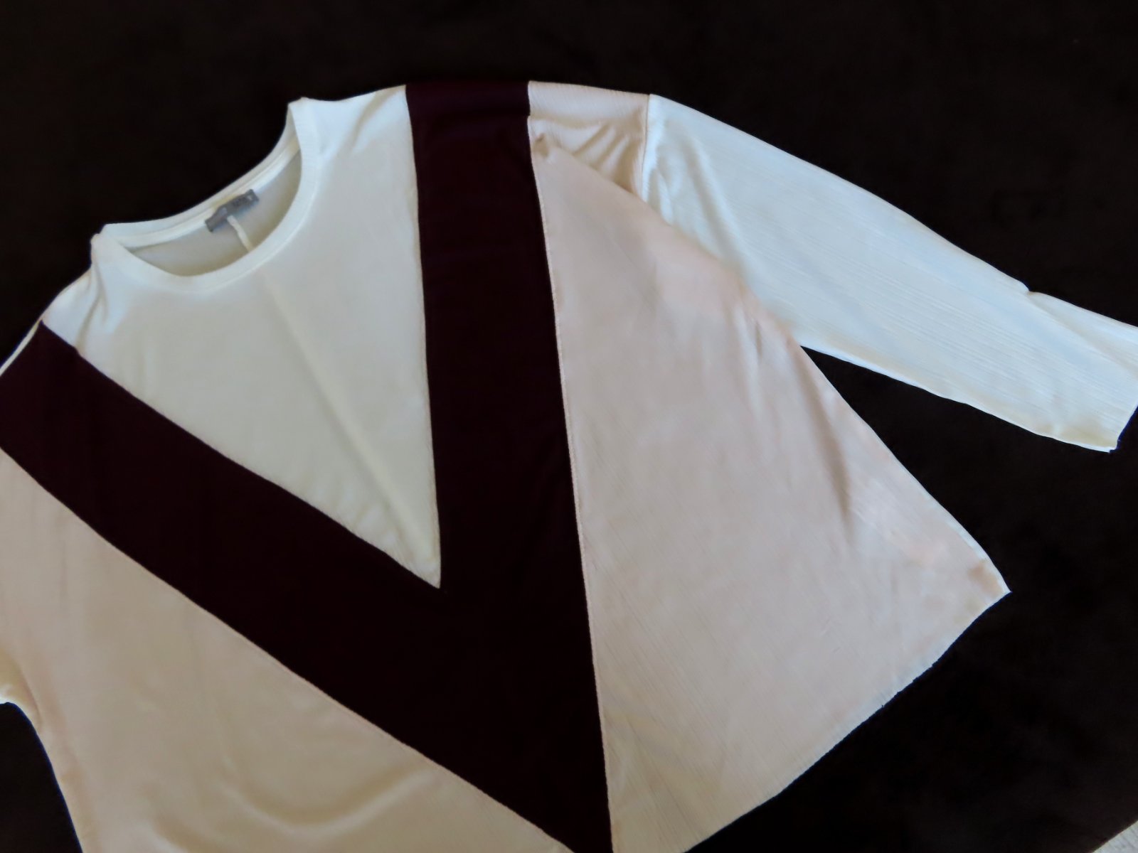 Blúzka je vo výbornom používanom stave, s padnutým ramenom a pútavými farebnými detailmi. Kombinácia svetlučkej šedej, béžovej a bordovej je nádherná!