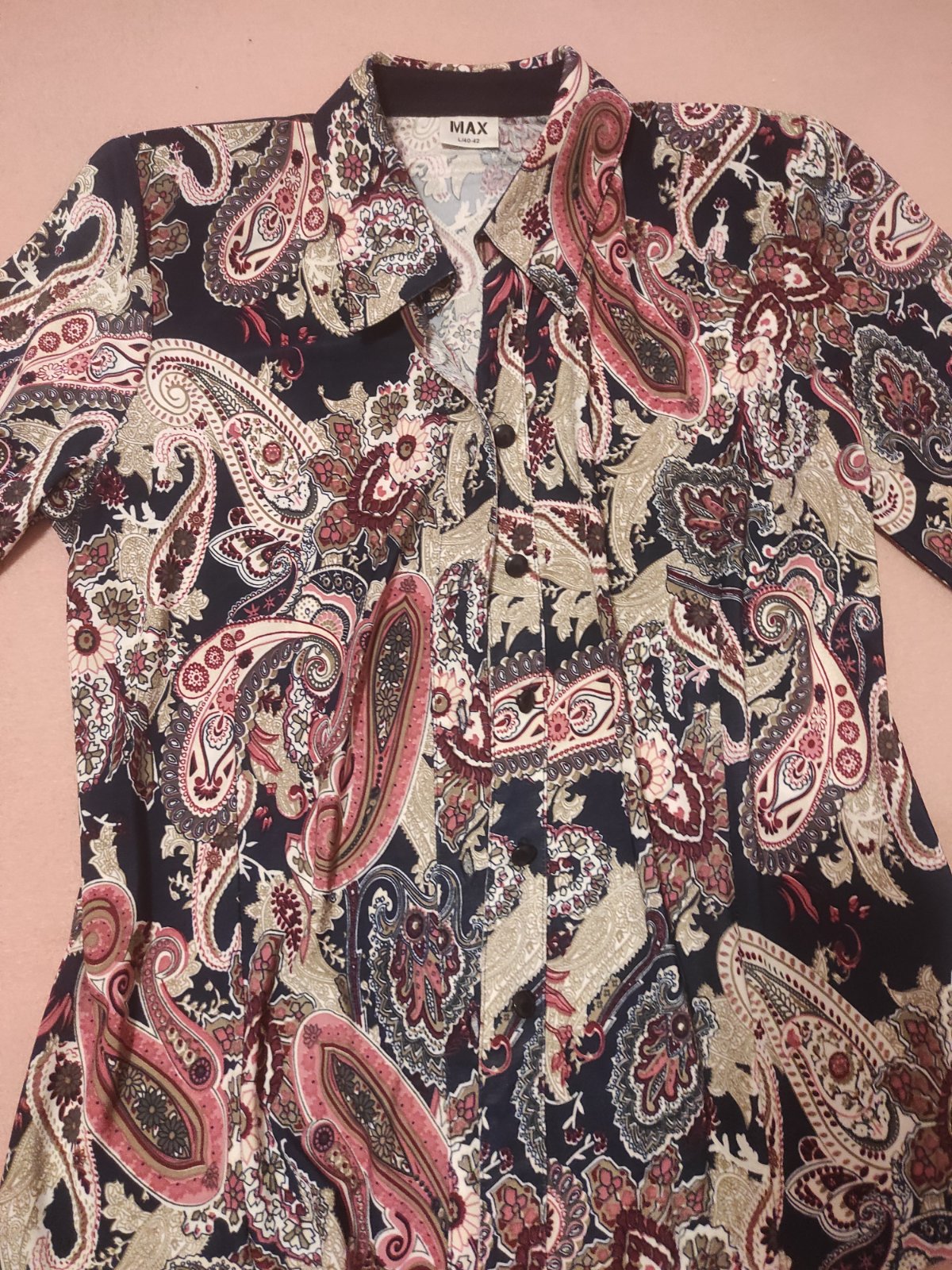 Nová bez visačky, kvalitný, nekrčivý jemný materiál.Šírka pod prsiami 130cm, dľžka predného dielu 63 cm, zadného 73 cm.Rukávy po lakte.