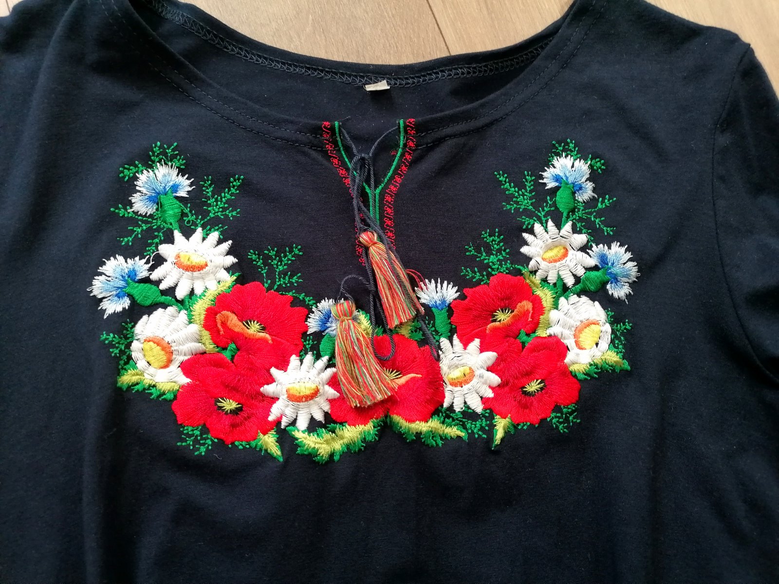 Krásna tmavomodrá tunika/dlhé tričko, iba oprata, nenosená. Na rukávoch a vpredu sú krásne farebné výšivky kvetov. Spodok ma stíhaný tak nepravidelne, dĺžka tej najkratšej časti je 72 cm, najdlhšej 79 cm. Šírka v prsiach 41 cm. Veľkosť uvedená L, ale sadnú určite aj na M.
