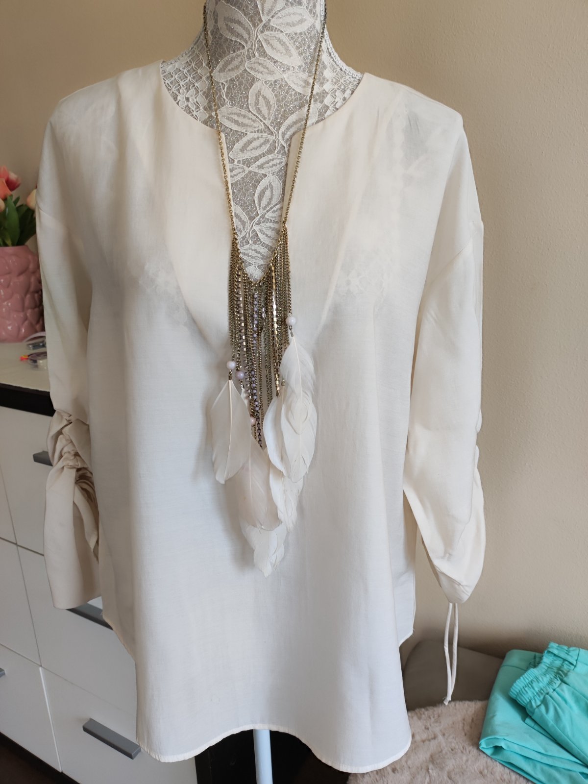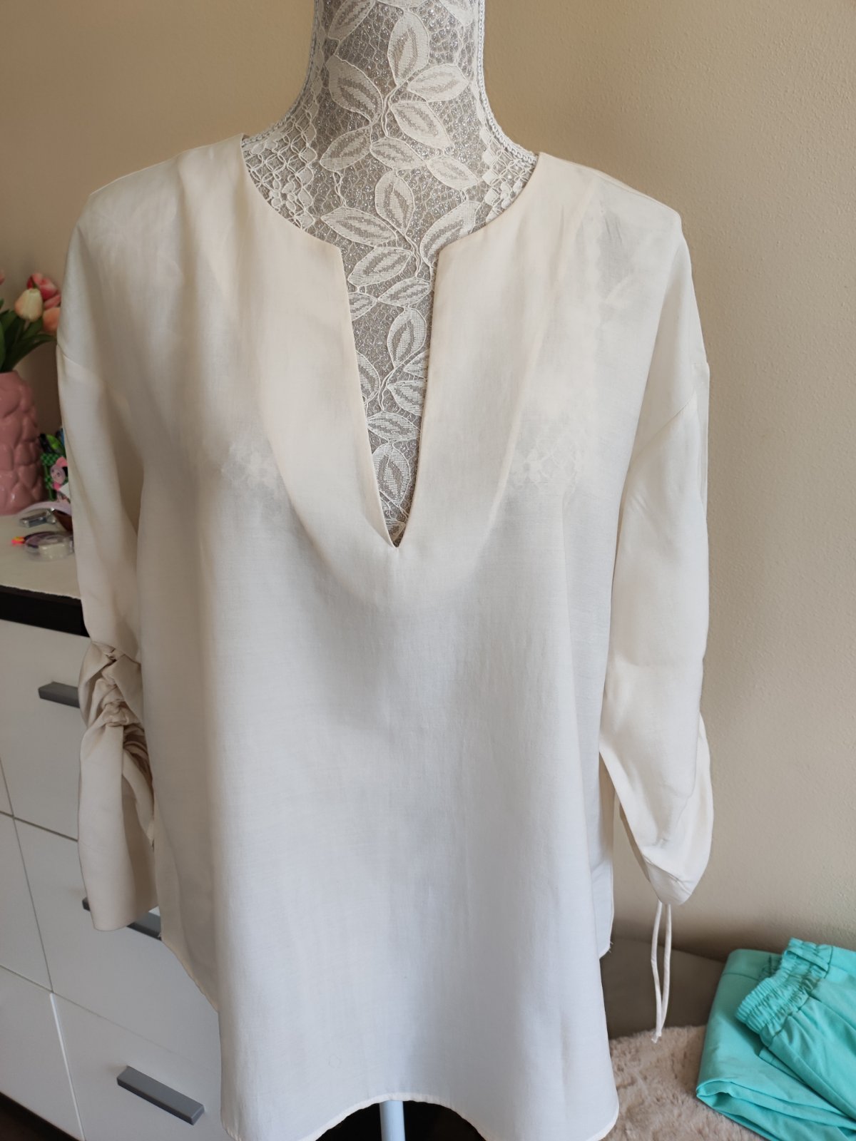 Pekná blúzka v bezchybnom stave, presvitá! Veľk. 42, ale skôr 44. Dĺžka - 65/70 cm, šírka - 2x 55 cm, rukáv od krku - 70 cm (dá sa vyhnúť a pripnúť).