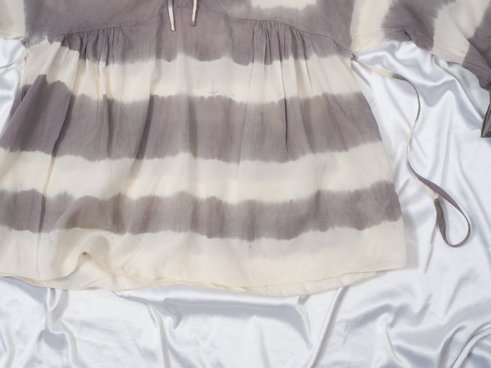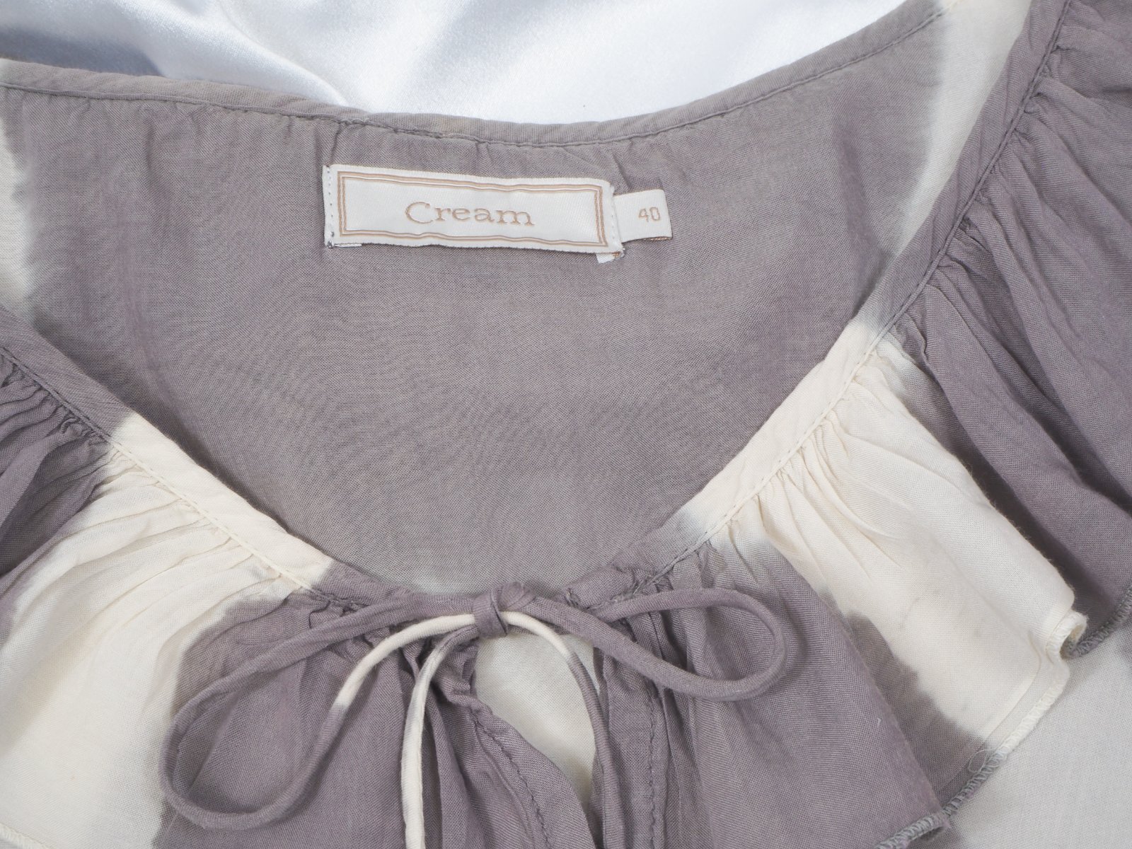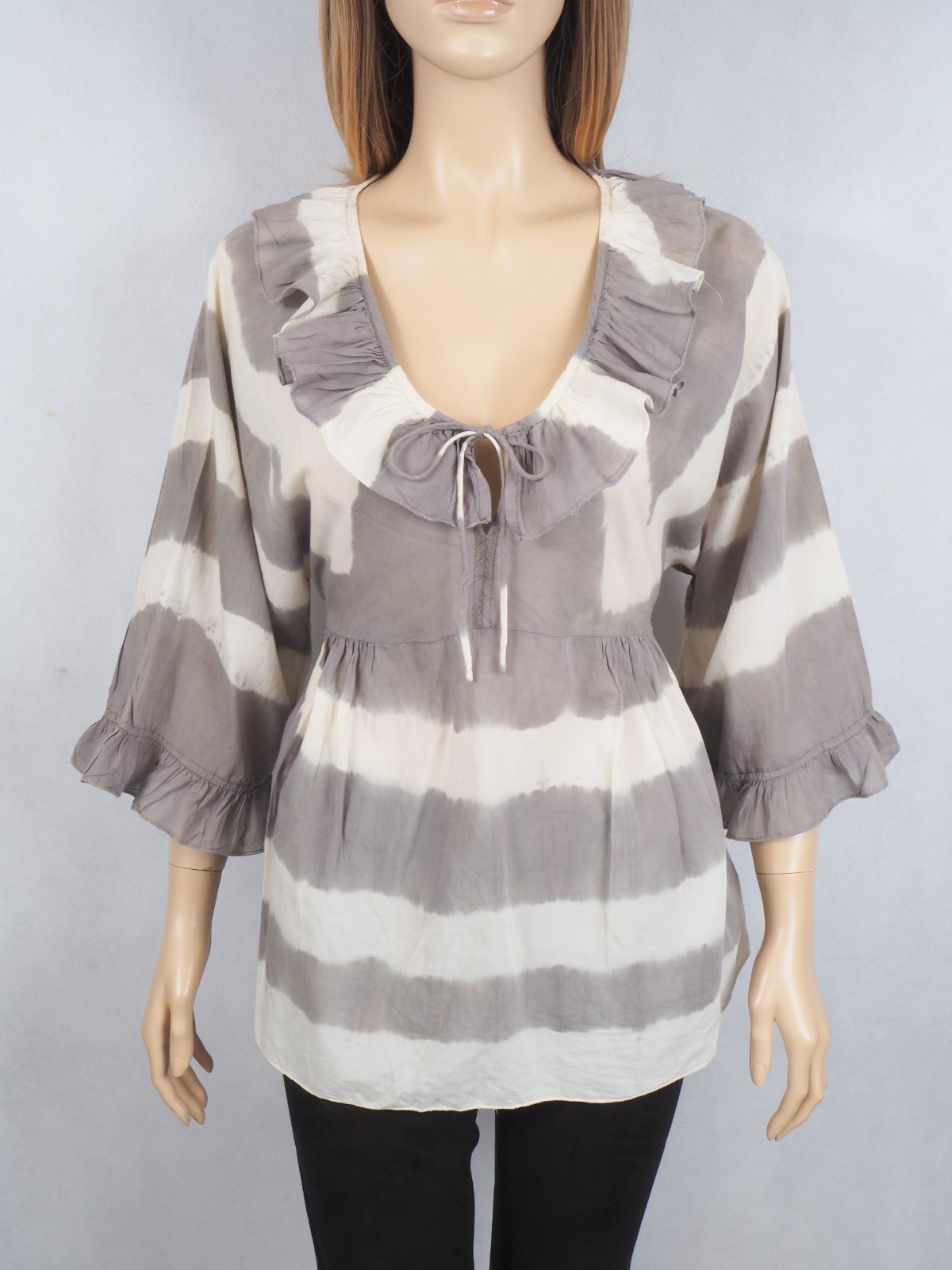 Kvalitná volánová blúzka béžovo-hnedej farby, batikovaná, v páse uväzovanie vzadu, netopieri strih rukávov, materiál 50% viskóza, 50% bavlna, super stav.