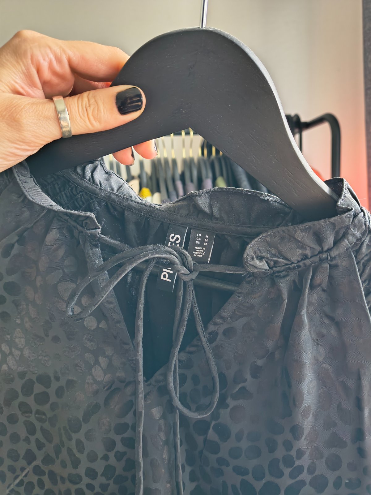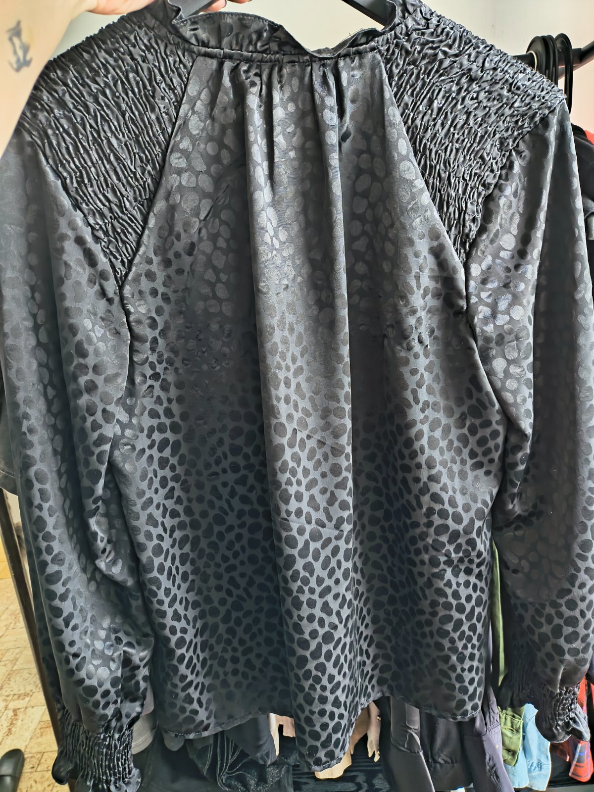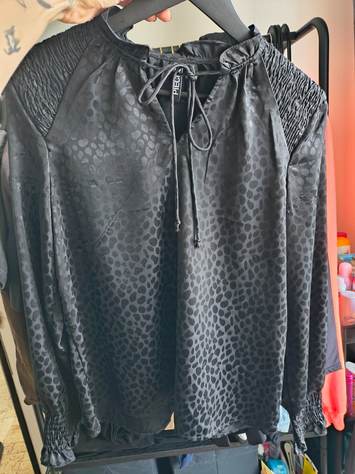 Predám blúzku, čiernu saténovú s leopardím vzorom. Bola raz použitá, bohužiaľ je mi tesná. Príjemný hladký materiál. Značka pieces. Posielam cez packetu alebo poštu za 3,50€.
