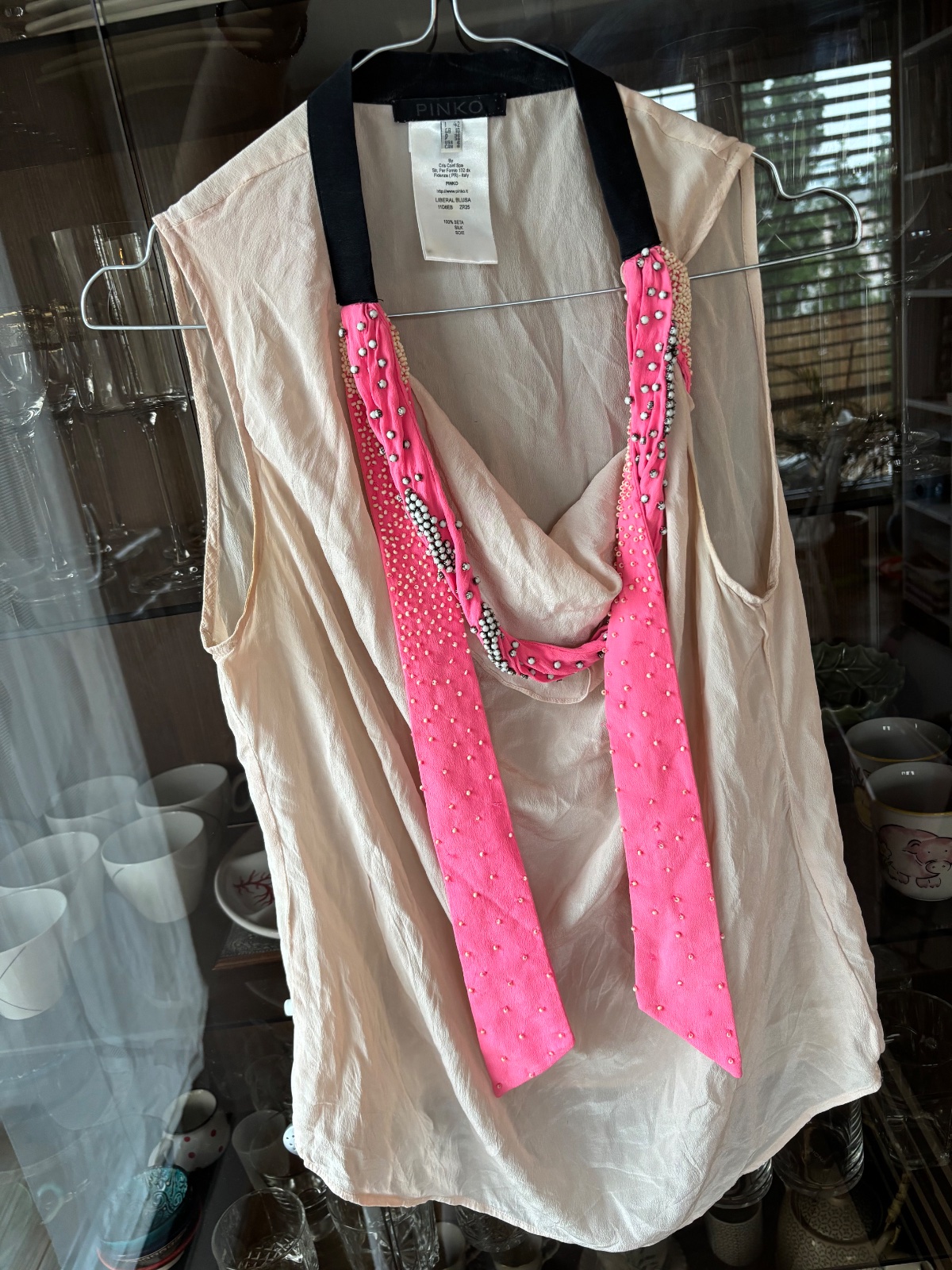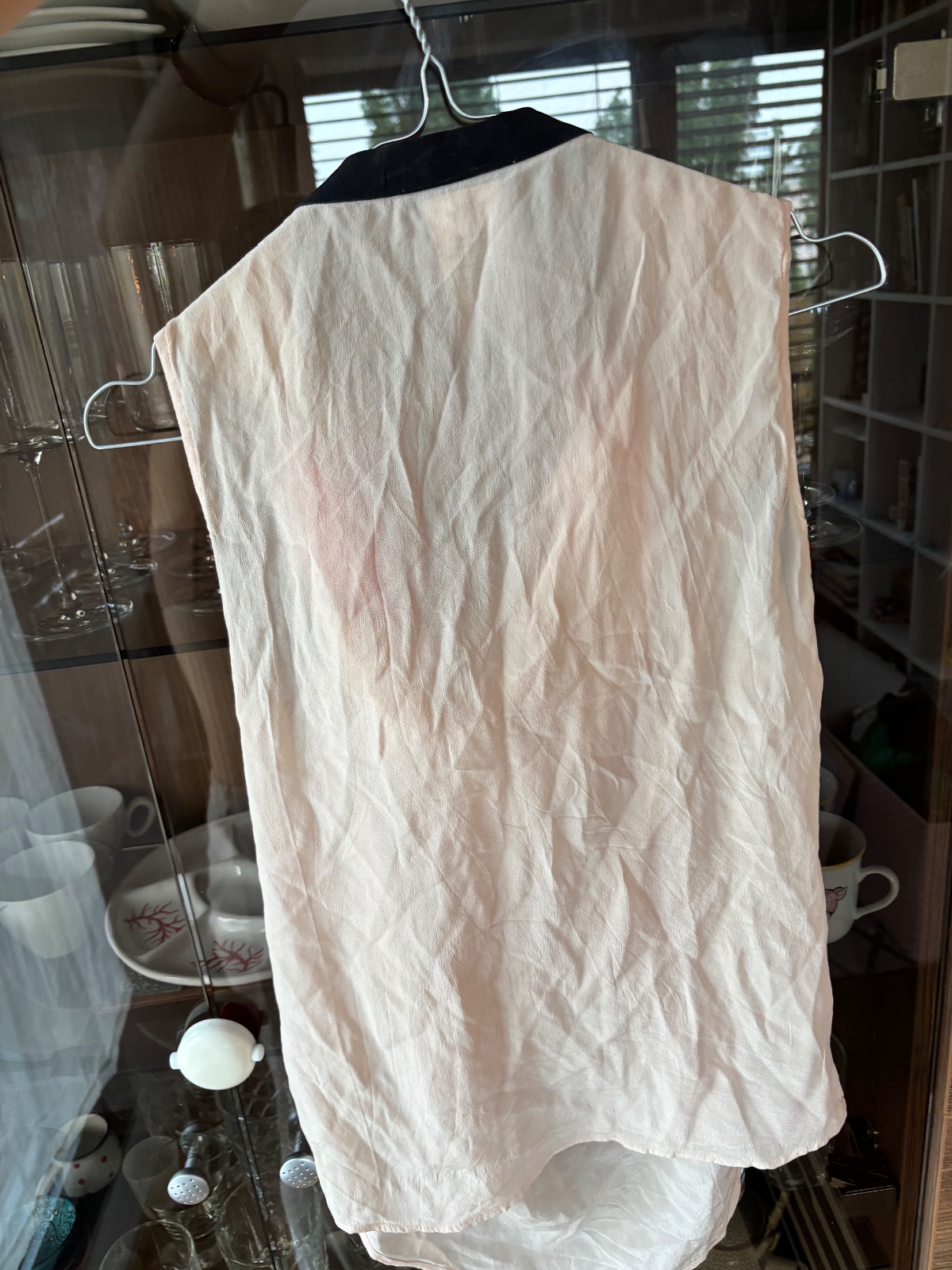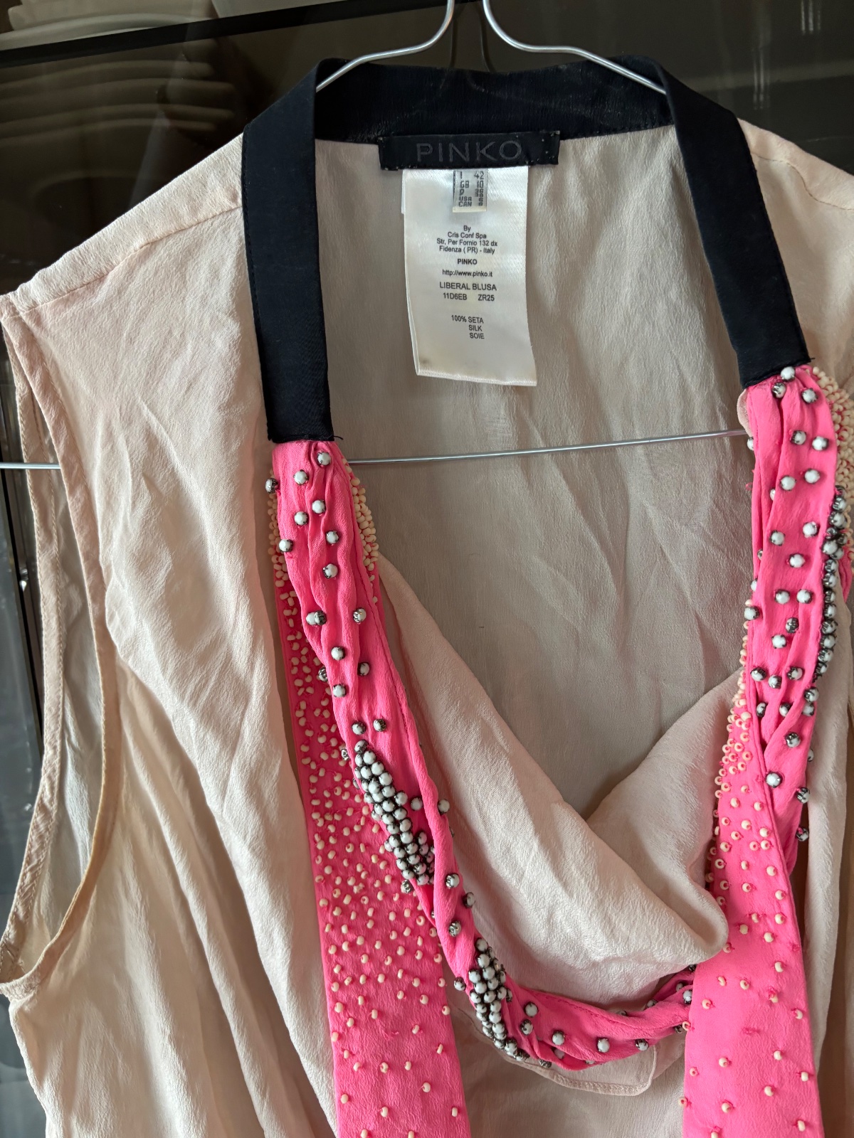 Jemna bluzka zo 100% hodvabu, bezova s akoby ruzovym nahrdelnikom.