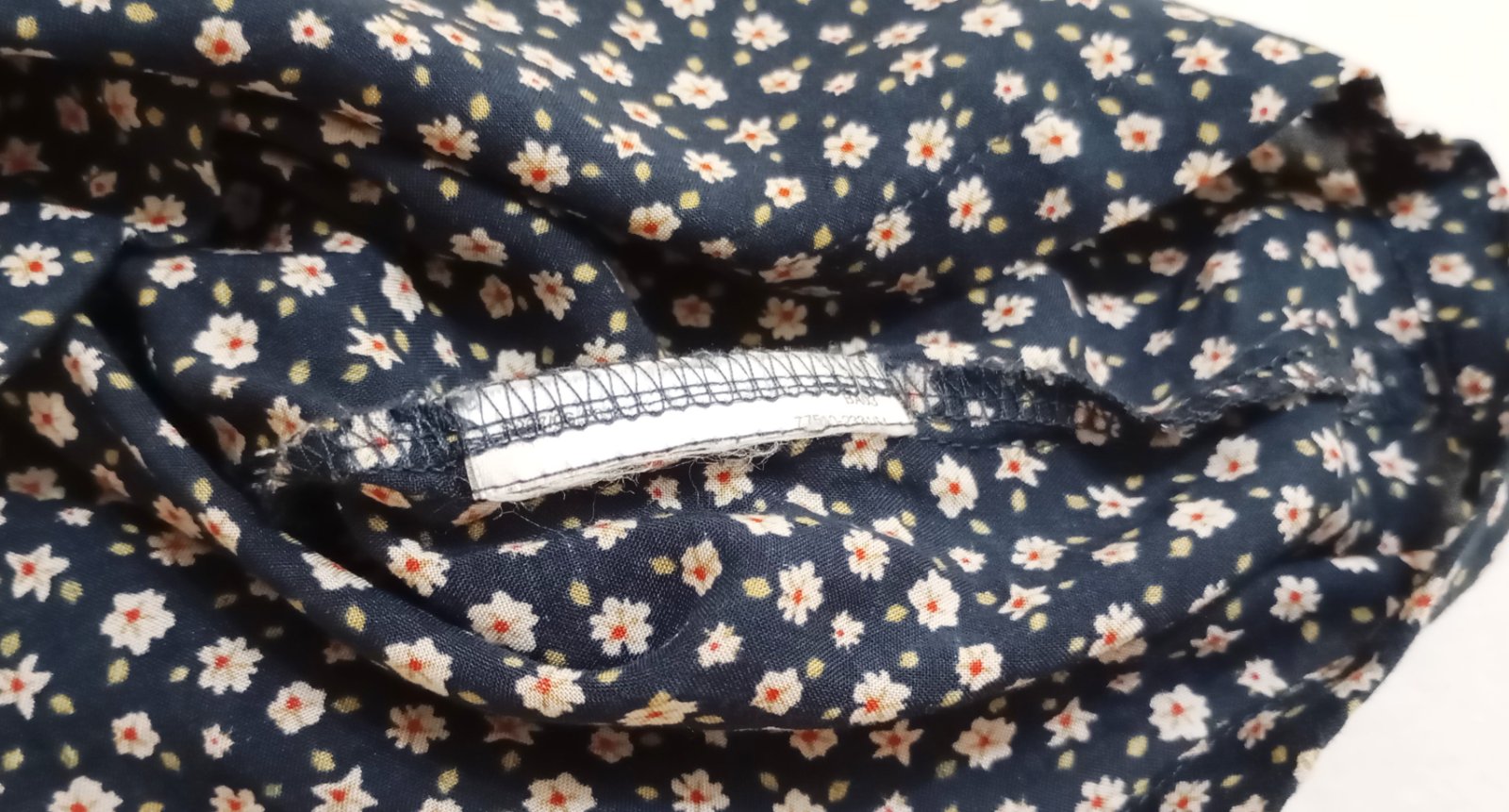 Štítok z vnútornej strany bol odstrihnutý (viď. fotografie), bohužiaľ nemám informácie o materiálovom zložení. Látka však svojou textúrou pripomína viskózu, je veľmi ľahká, tenká a jemná.