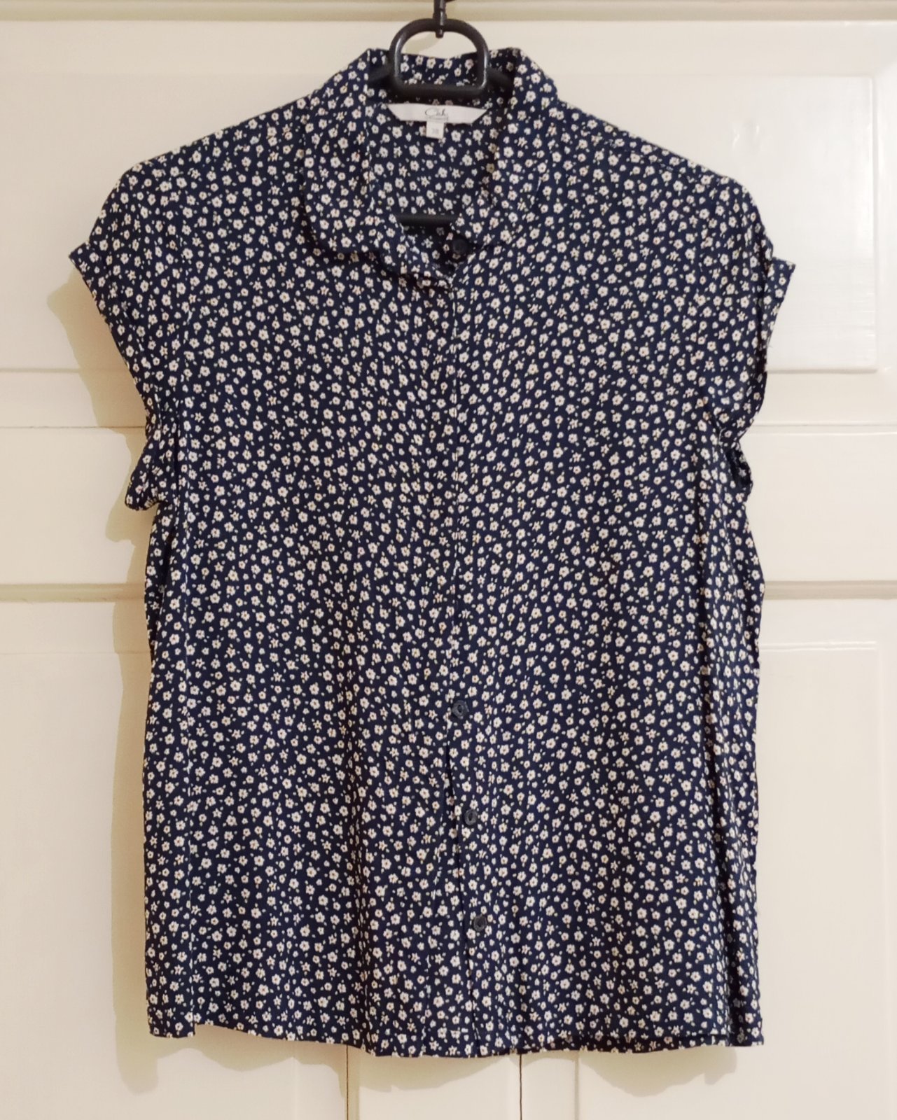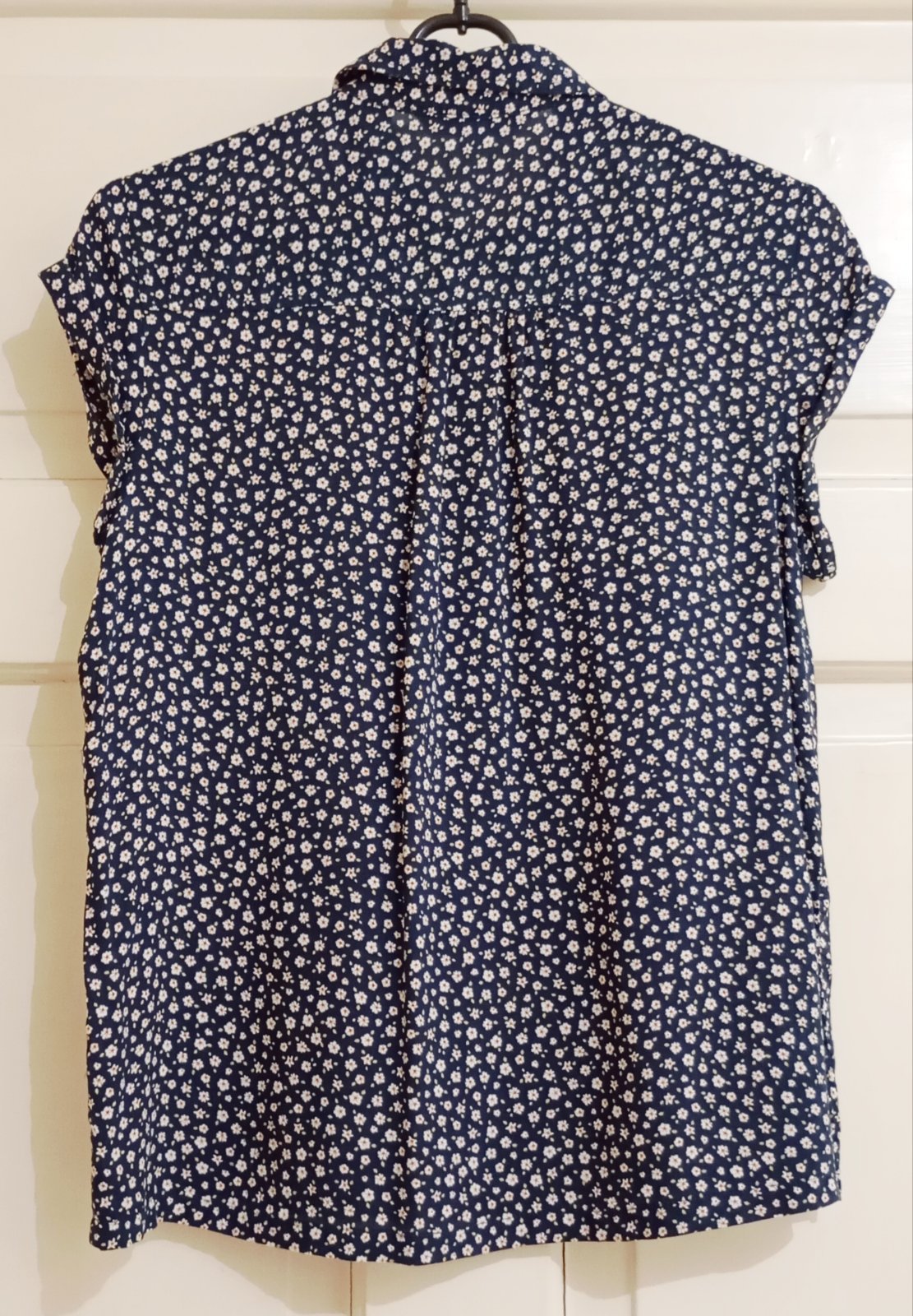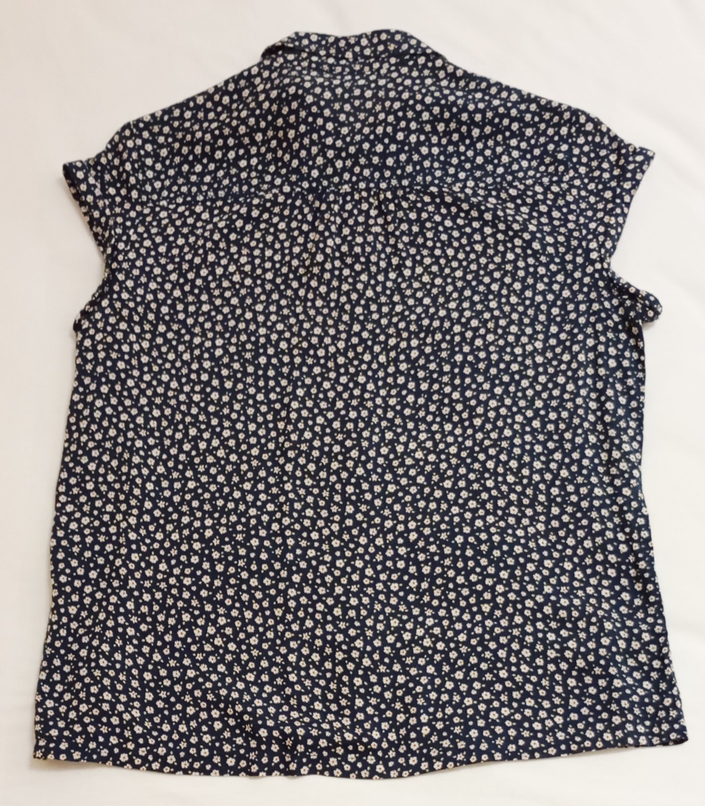 Ľahká blúzka s krátkym rukávom na gombíky v tmavomodrej resp. indigovej farbe s hustým vzorom drobných bielych kvietkov.