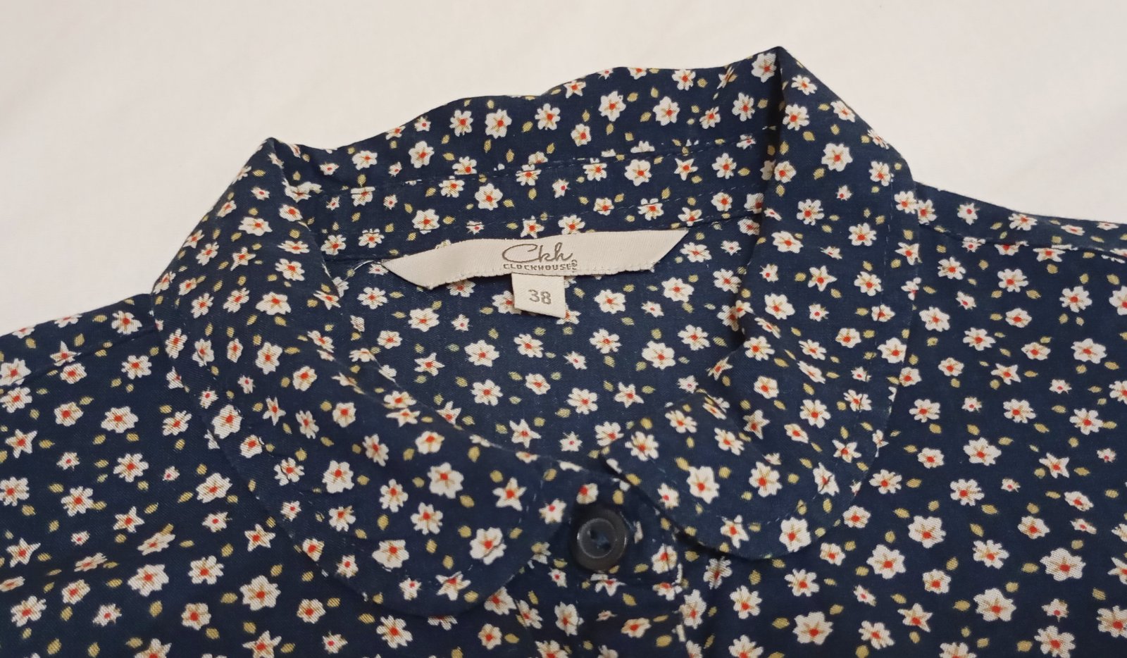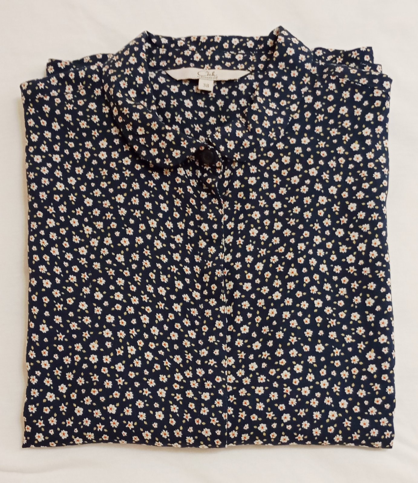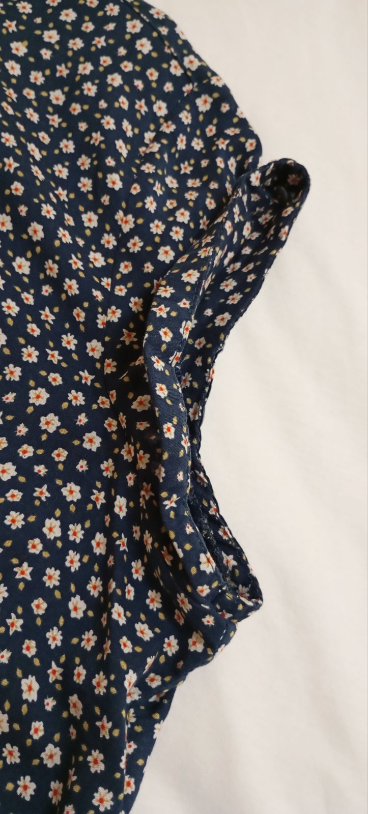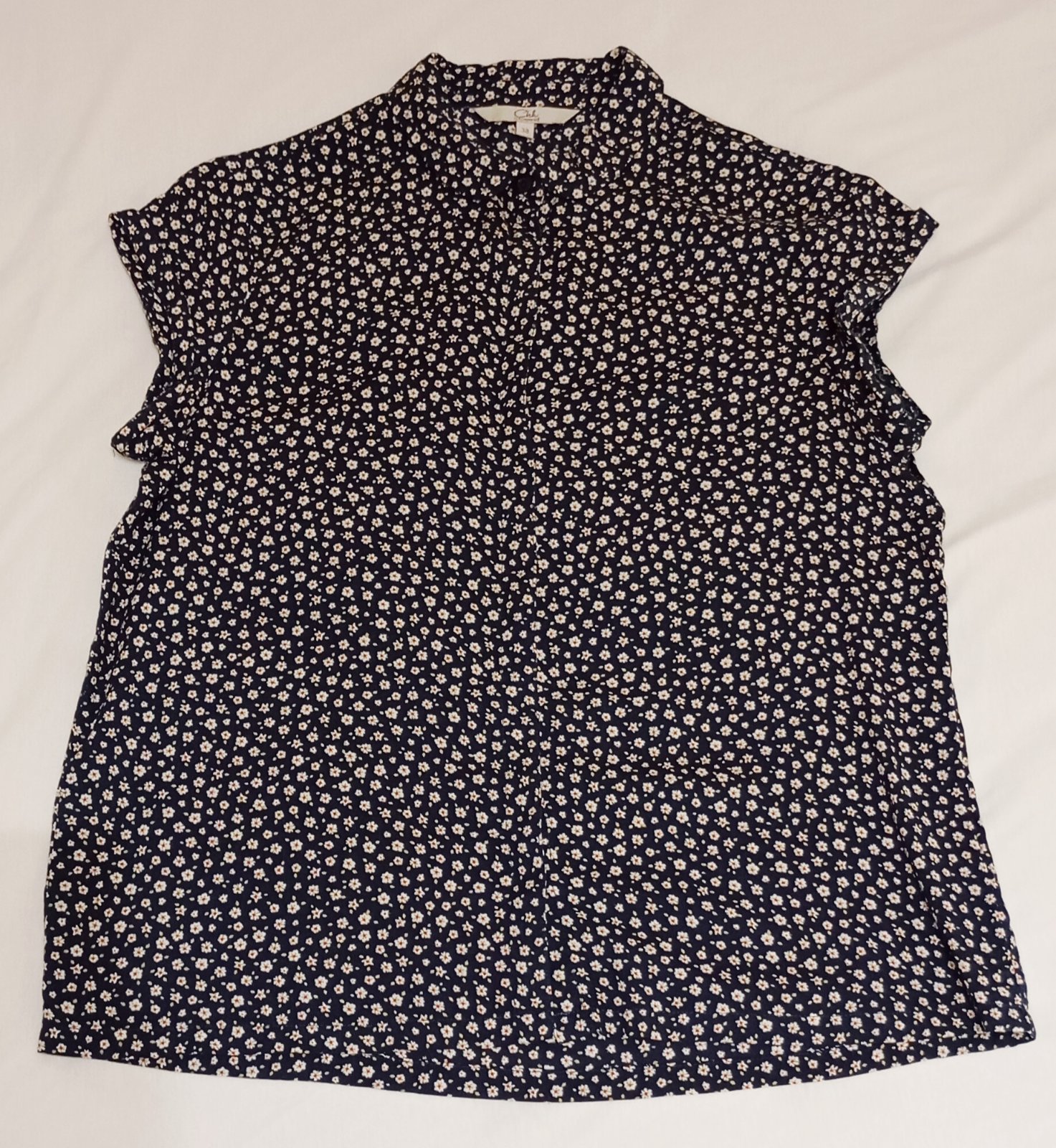 Ľahká blúzka s krátkym rukávom na gombíky v tmavomodrej resp. indigovej farbe s hustým vzorom drobných bielych kvietkov.