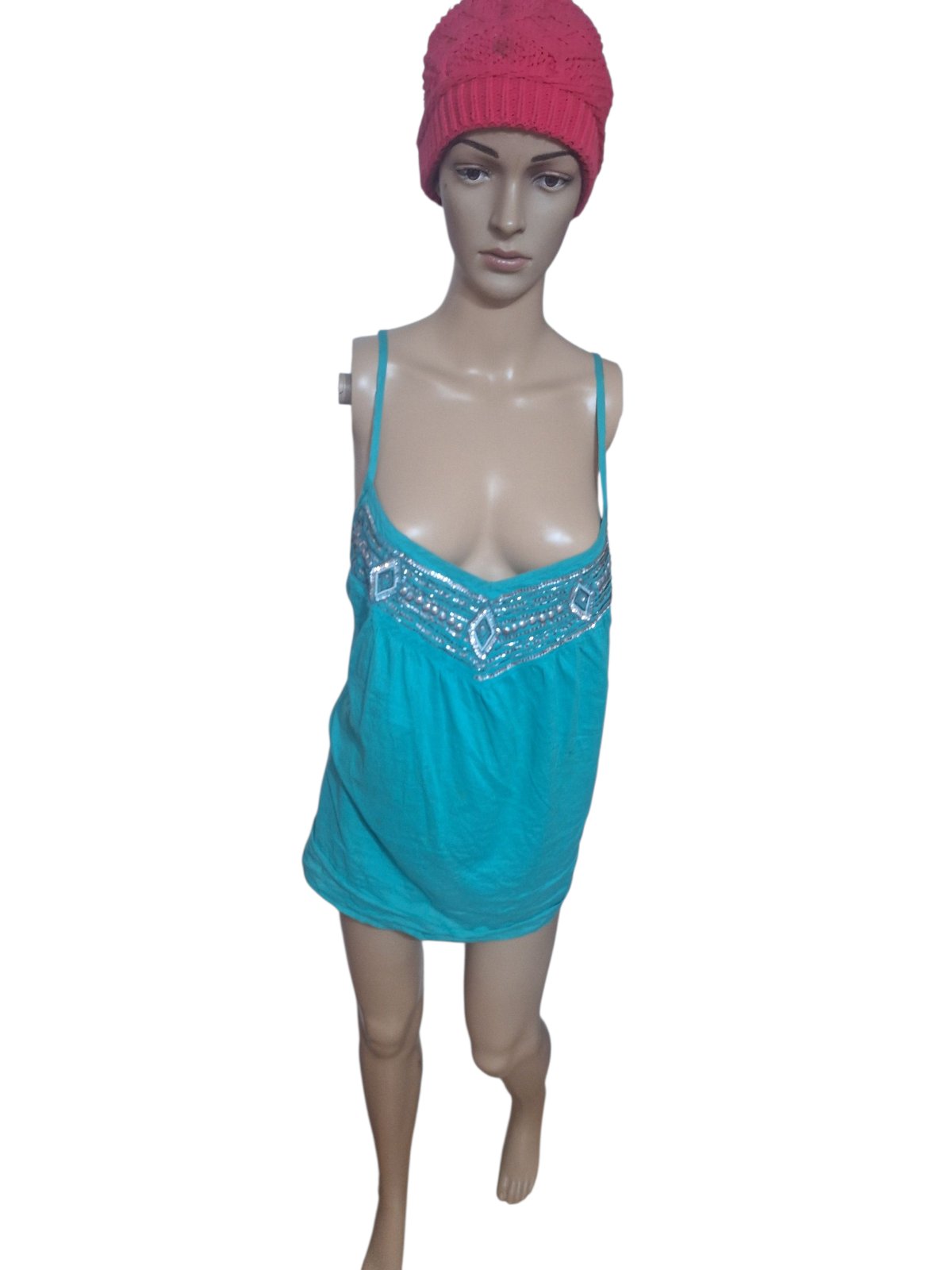Dámska ľahučká blúzka so šnúrkou. Sú na nej flitre a pliešky. Dĺžka je 70cm,obvod hrudníka je 116cm a obvod pása je 120cm. kód 430