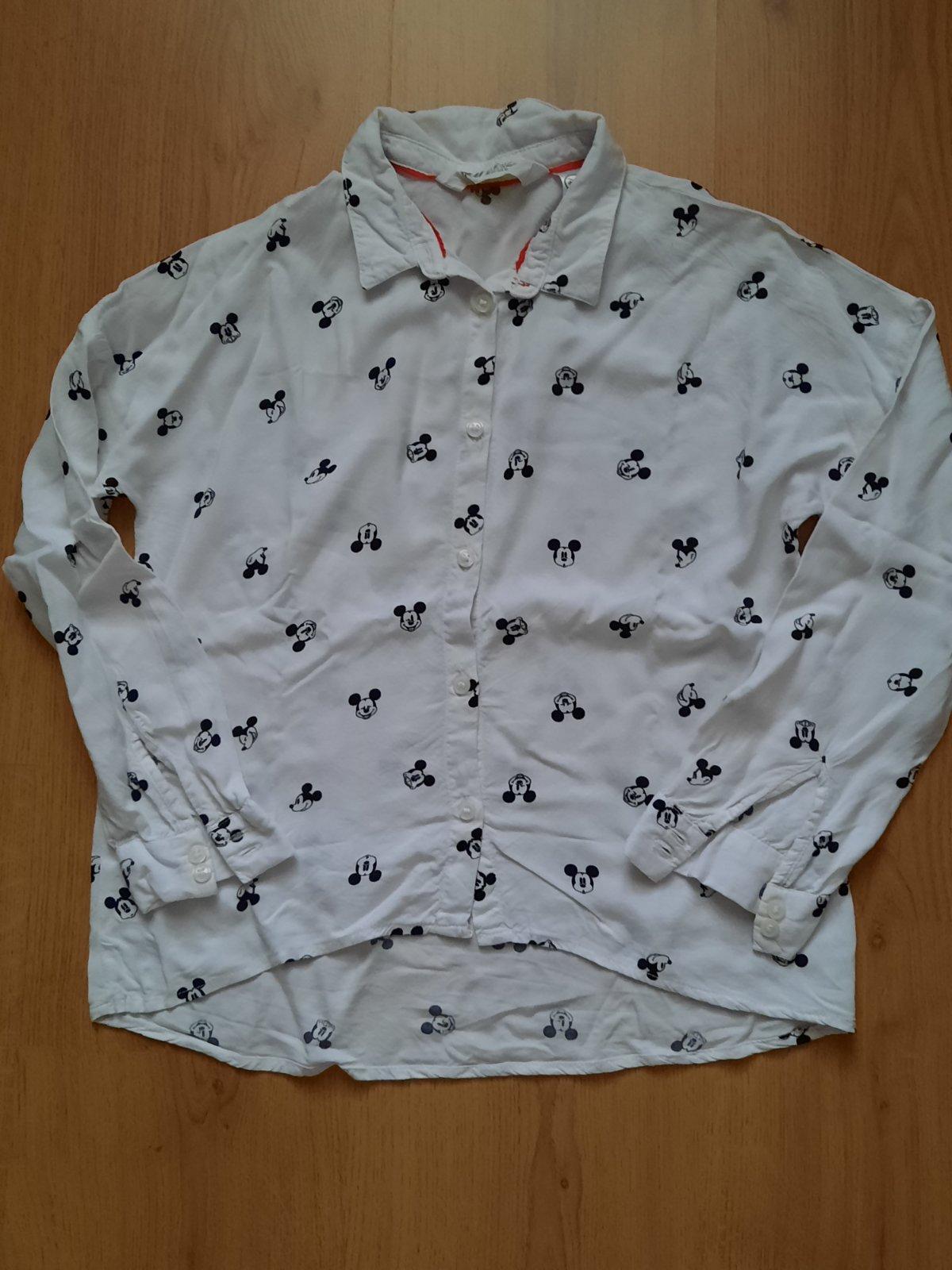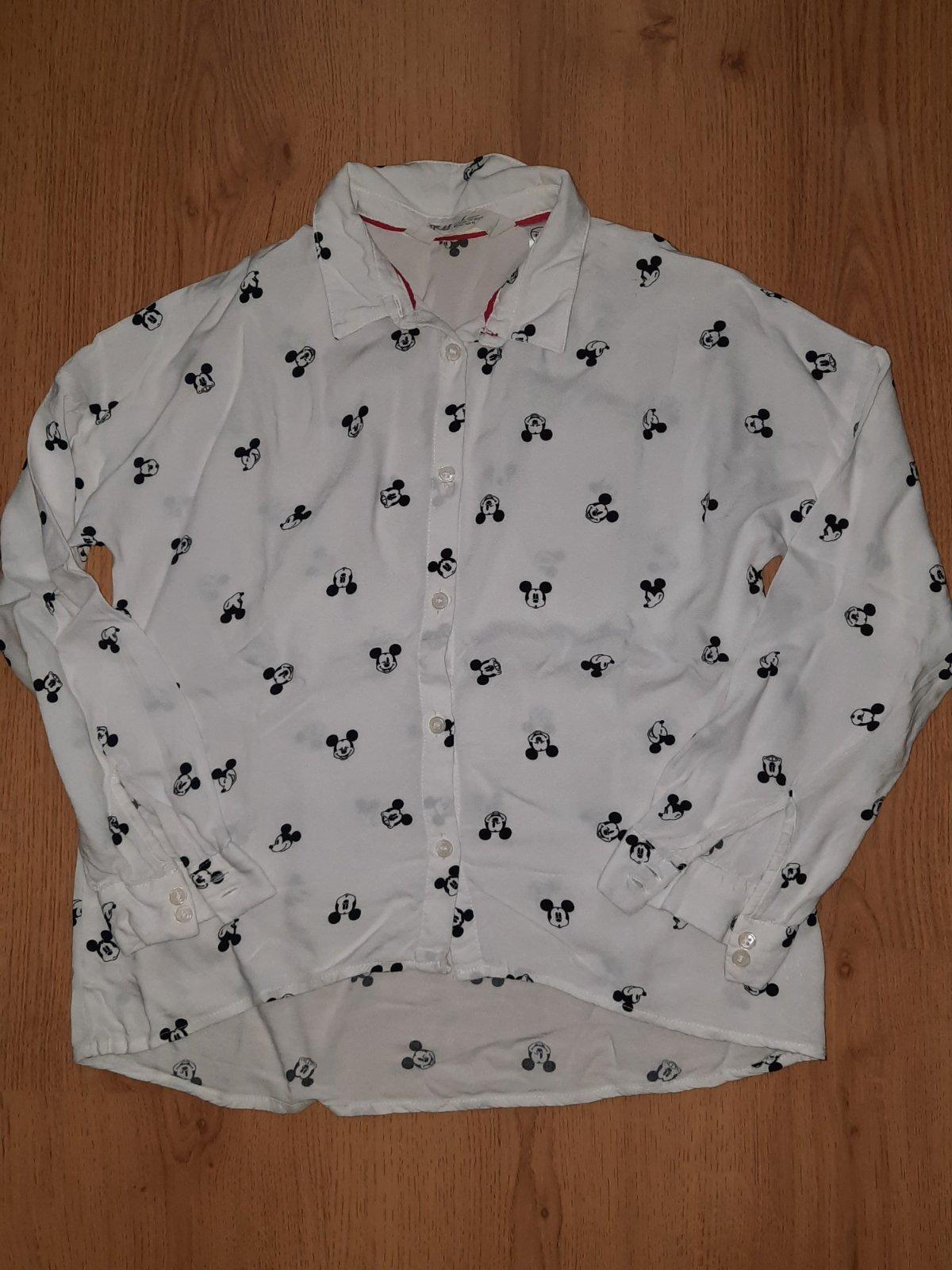 Košeľa blúzka z jemnej látky s potlačou obľúbeného Mickeyho pekný nosený stav.Nosili sme spolu so sivými šatami v našich inzerátoch