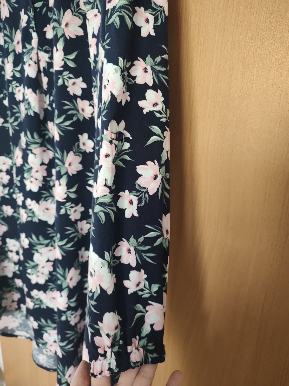 Predĺžená tmavomodrá košeľa z ľahkého pohodlného materiálu. Vzadu predĺžená. Rukávy sú ukončené gumičkou, sú dlhé a dajú sa skrátit na 3/4, je tam zapínanie na gombík. Košeľa je na zapínanie na pár gombíkov len hore, nie po celej dĺžke. Je vzdušná. U mňa už nemá využitie. Je v top stave. Farba je svieža, nie je vyblednuta. Kvietky sú slabo ružové. Sedí na veľkosť XL. Ja som mala oblečené párkrát stiahnuté s tenkým opaskom (nie je k tomu)