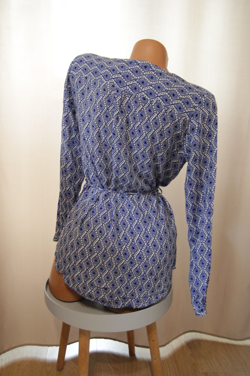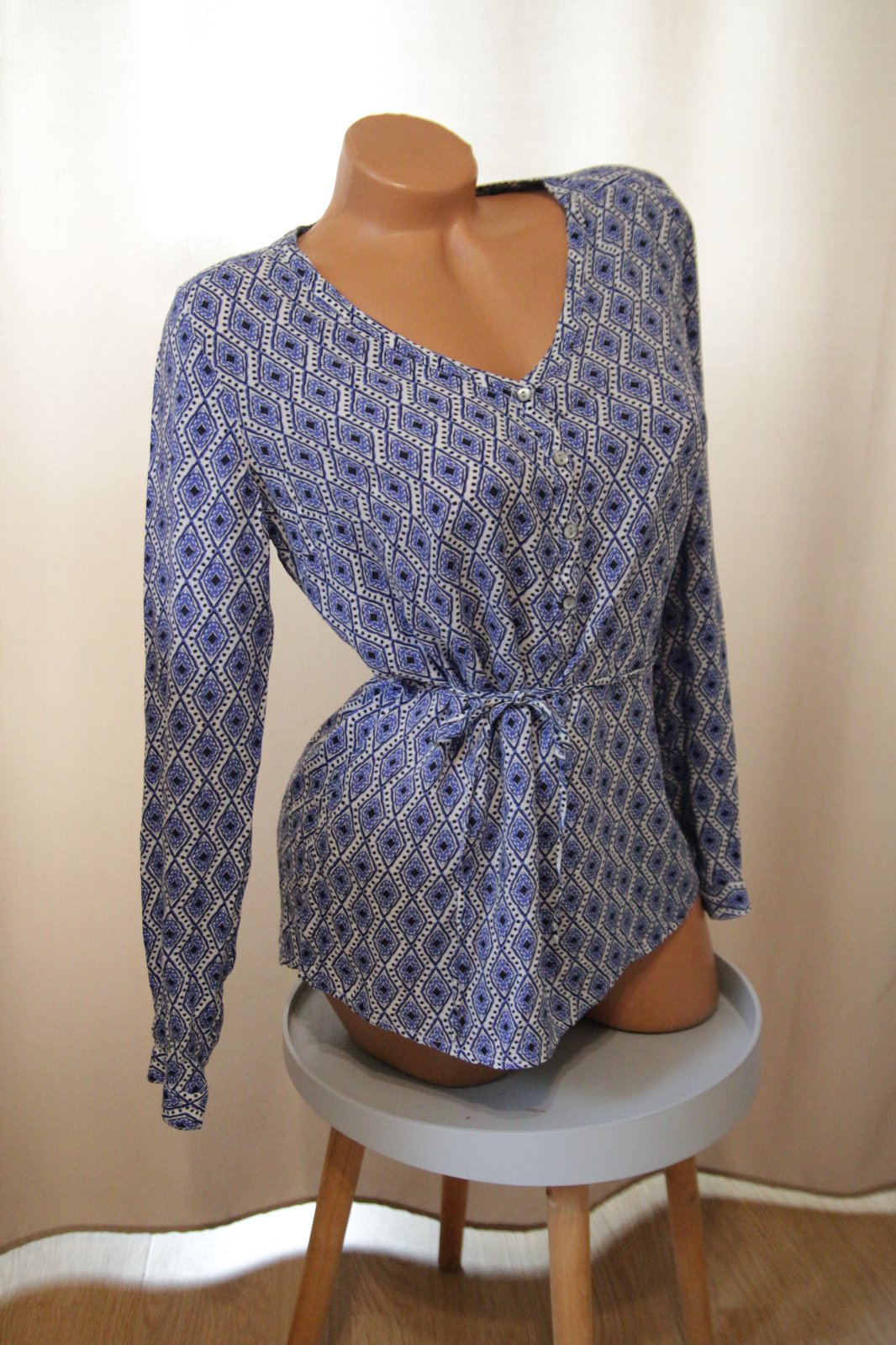 Bielo modrá vzorovaná tunika s viazaním v páse. Veľkosť S/M.