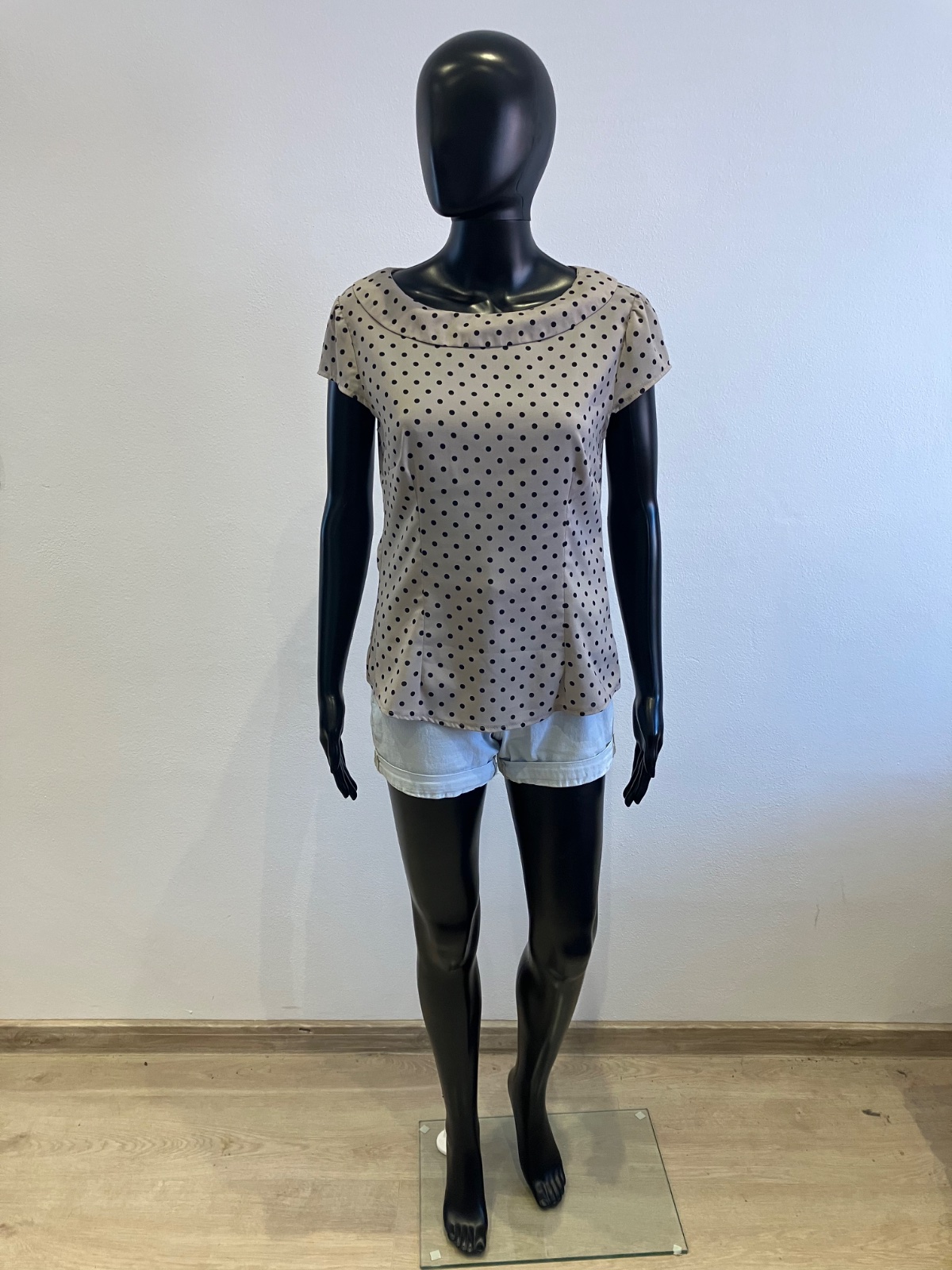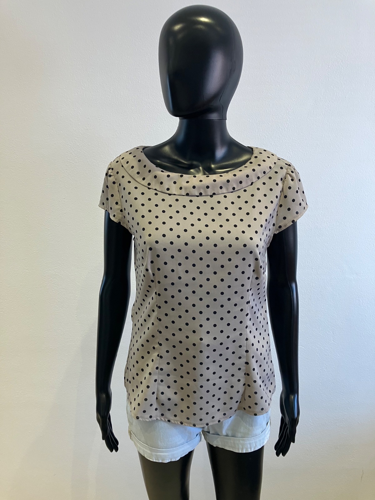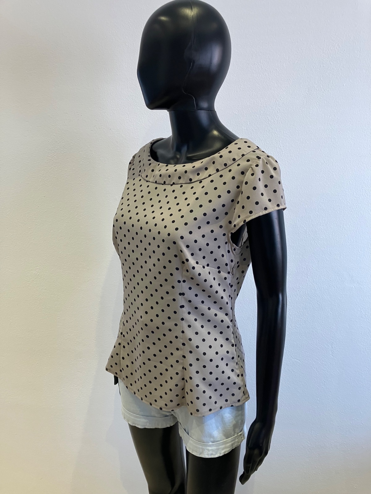 Dámska bodkovaná blúzka s krátkym rukávom, sivá s čiernymi bodkami, jemne elastická, tenká, zapínanie na boku na zips, materiál 97%polyester 3%elastan.