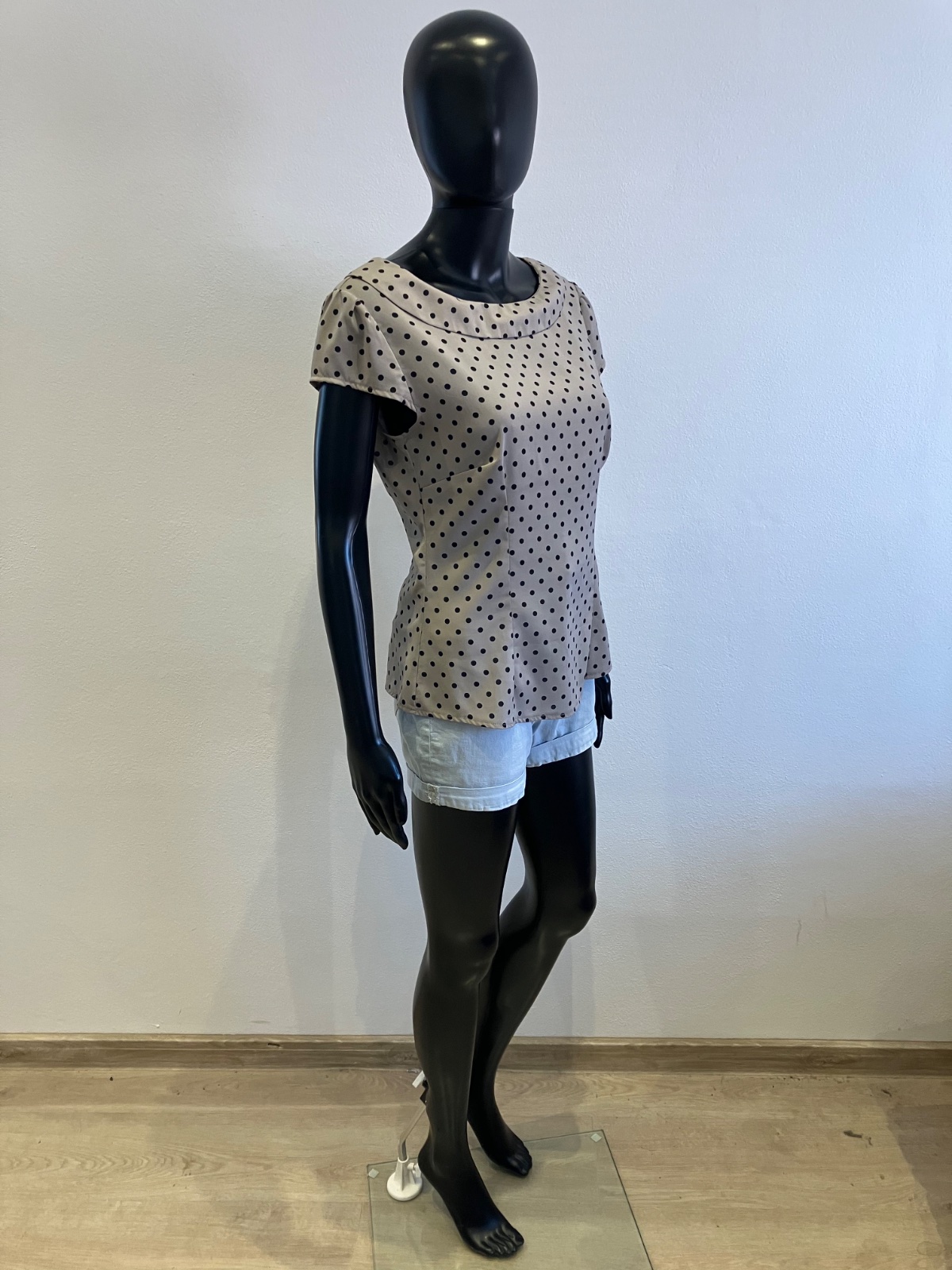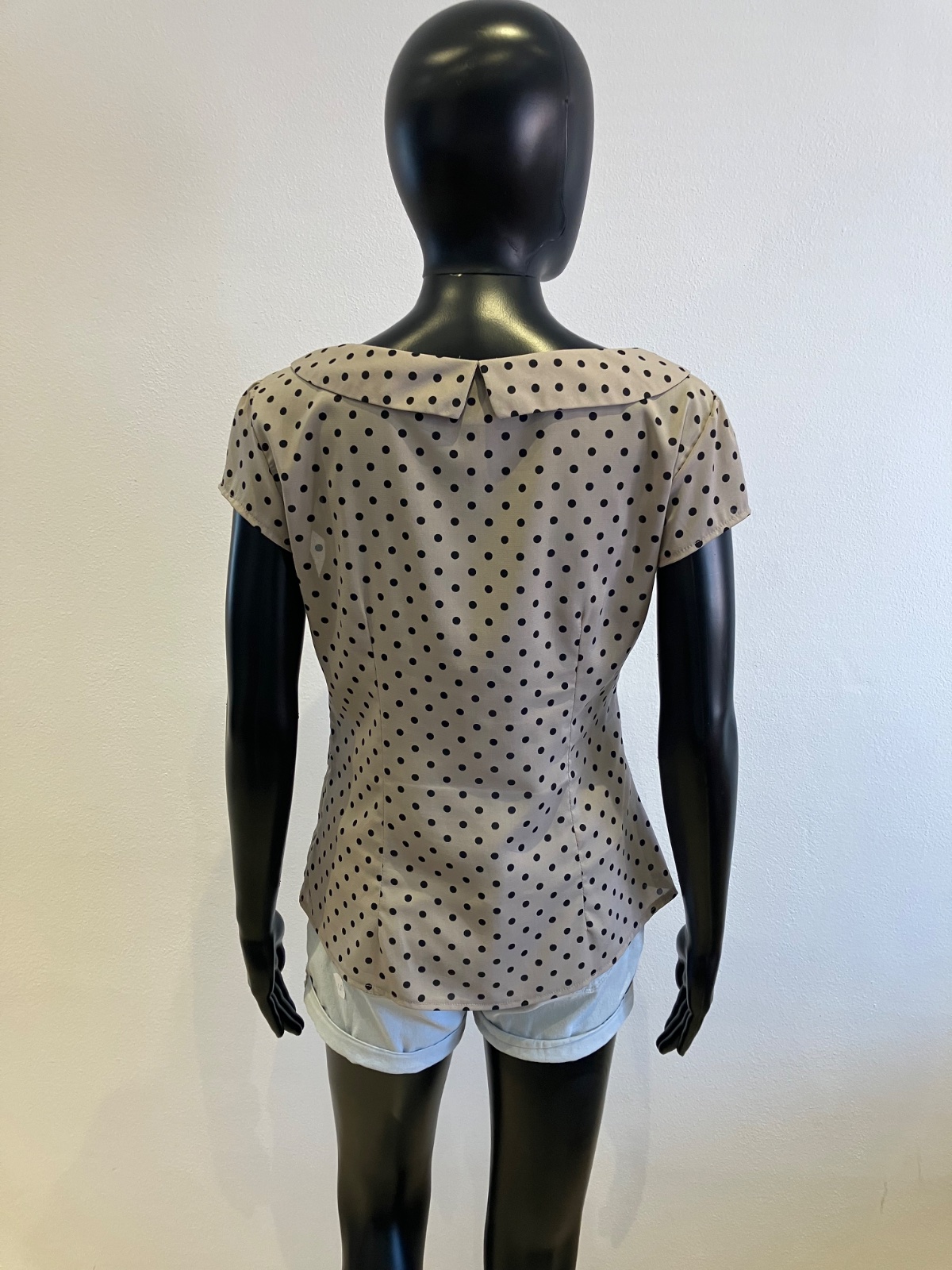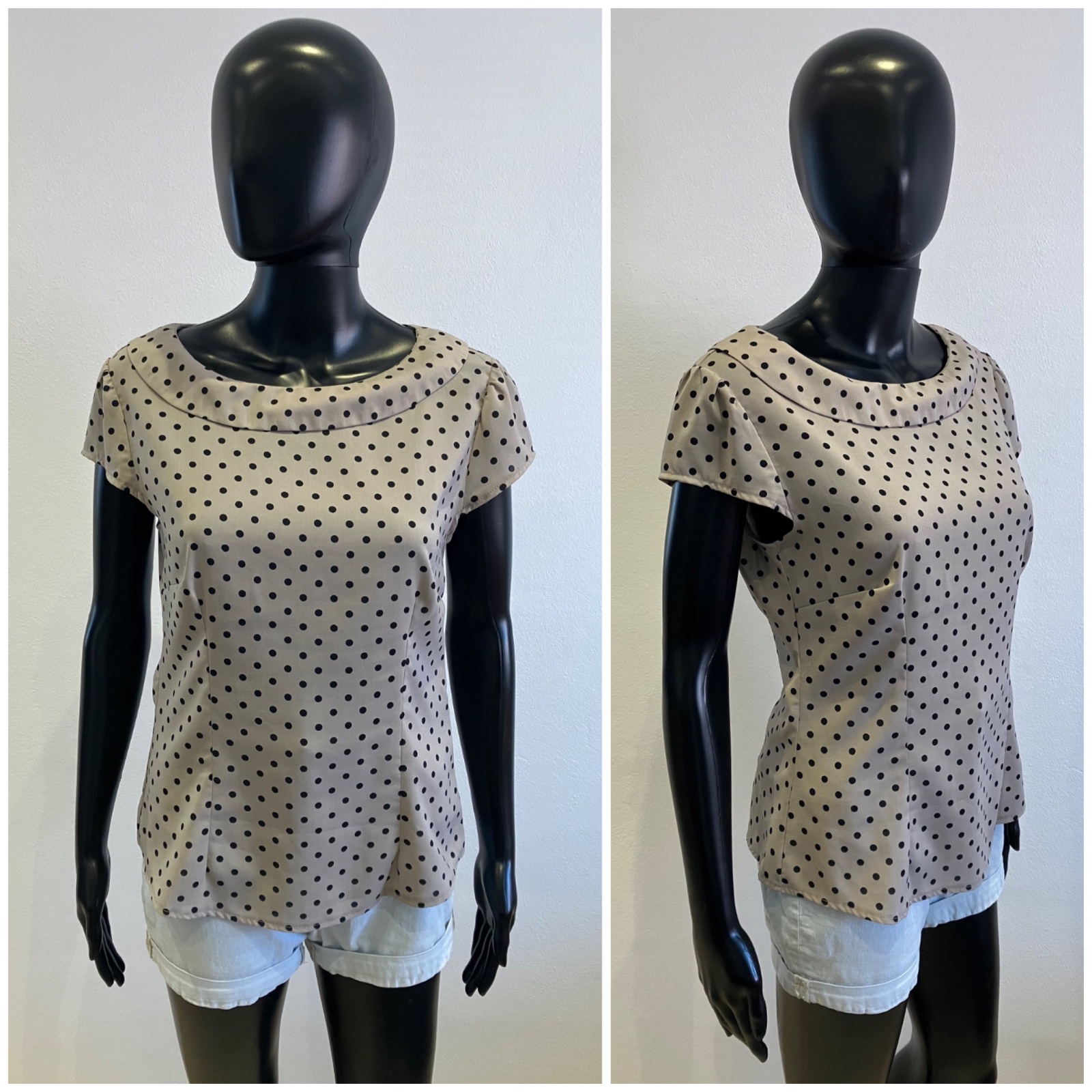 Dámska bodkovaná blúzka s krátkym rukávom, sivá s čiernymi bodkami, jemne elastická, tenká, zapínanie na boku na zips, materiál 97%polyester 3%elastan.