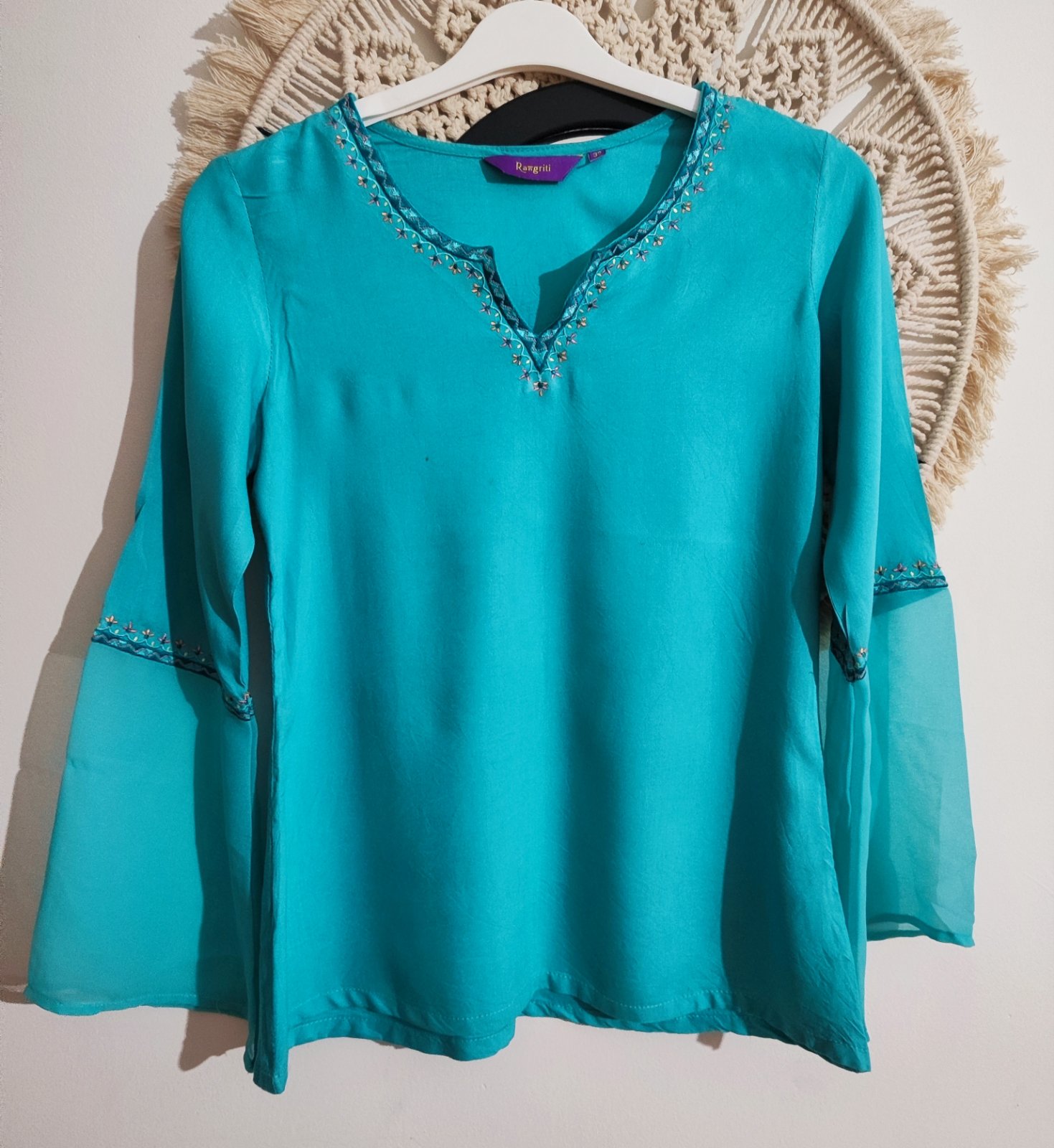 100% stav, 2-3 x vzatý. Jemný smaragovozelený top Orsay. Okolo výstrihu a rukávov jemne trblietky. Na bezne nosenie i na prilezitost. Velkost 34, je to volnejsi strih, takze sadne na xs-s