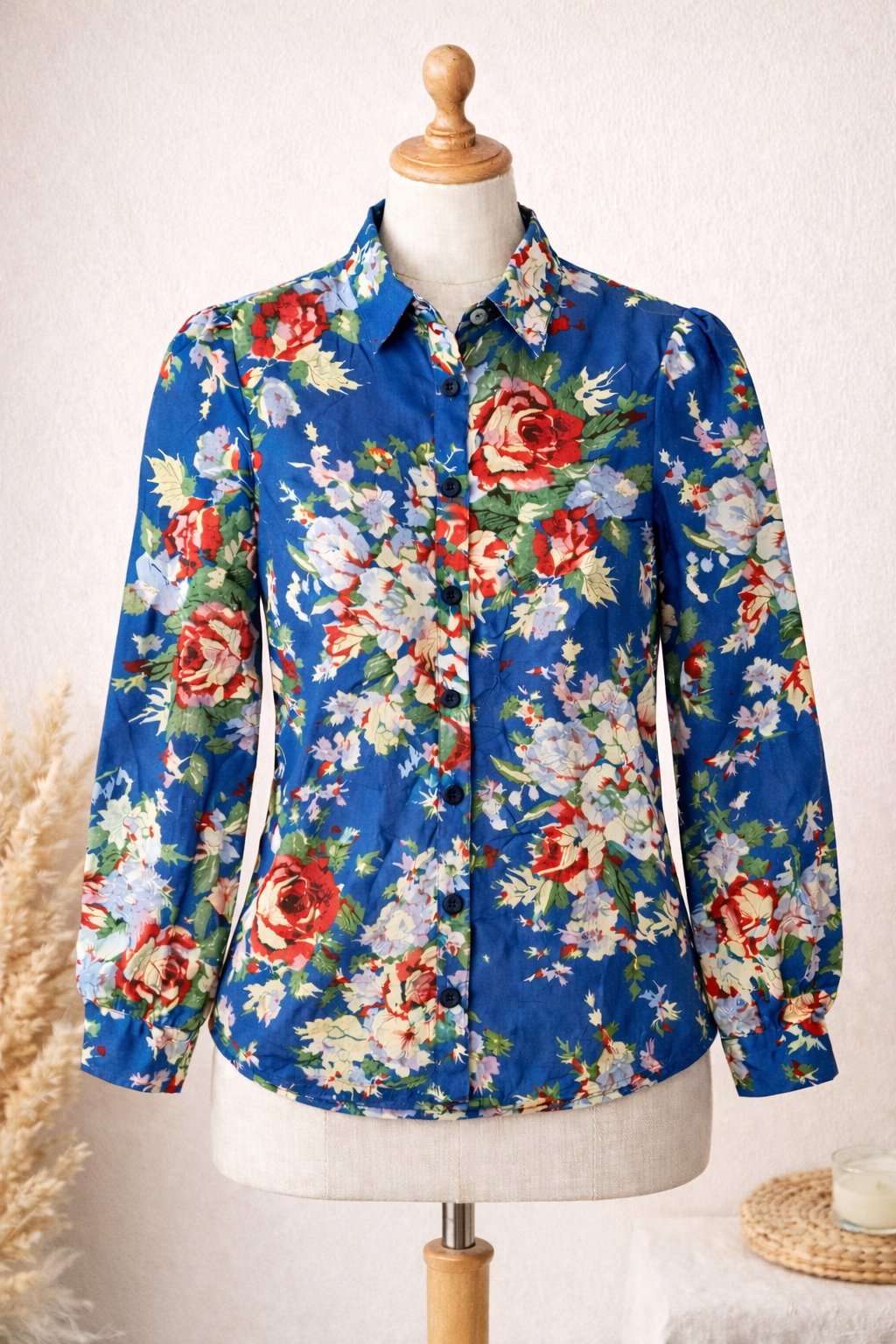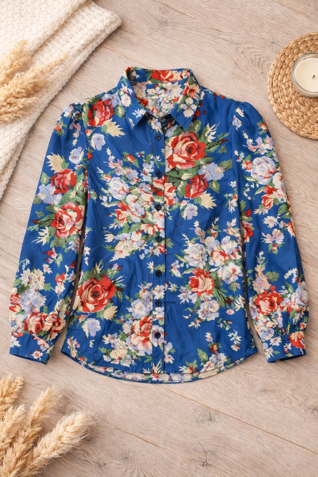 Elegantná dámska košeľa s výrazným kvetovaným vzorom na sýtom modrom podklade.