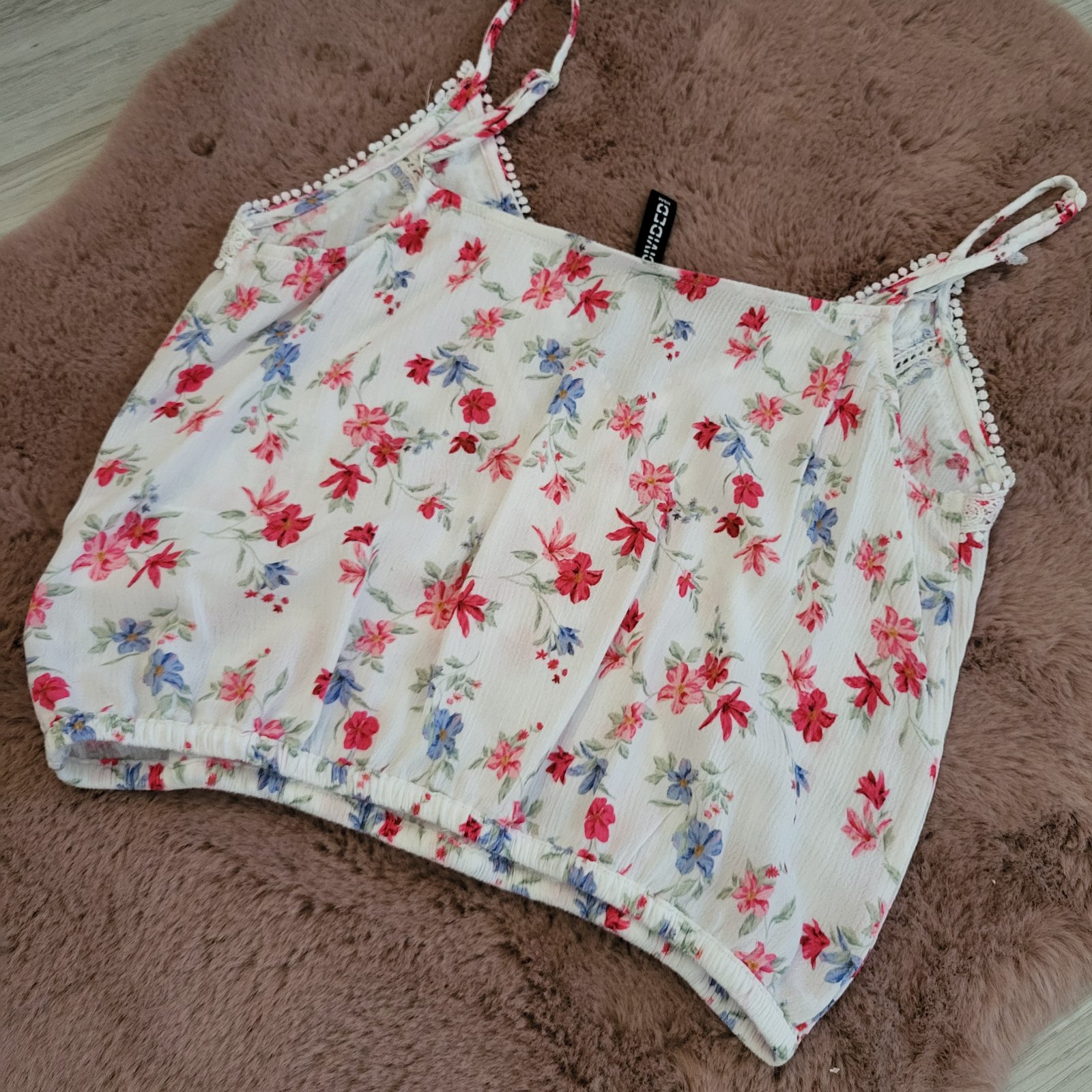 Krasna crop top bluzka. Kvetinový motív, jemný a romantický. Bluzka je lemovaná cipkou.