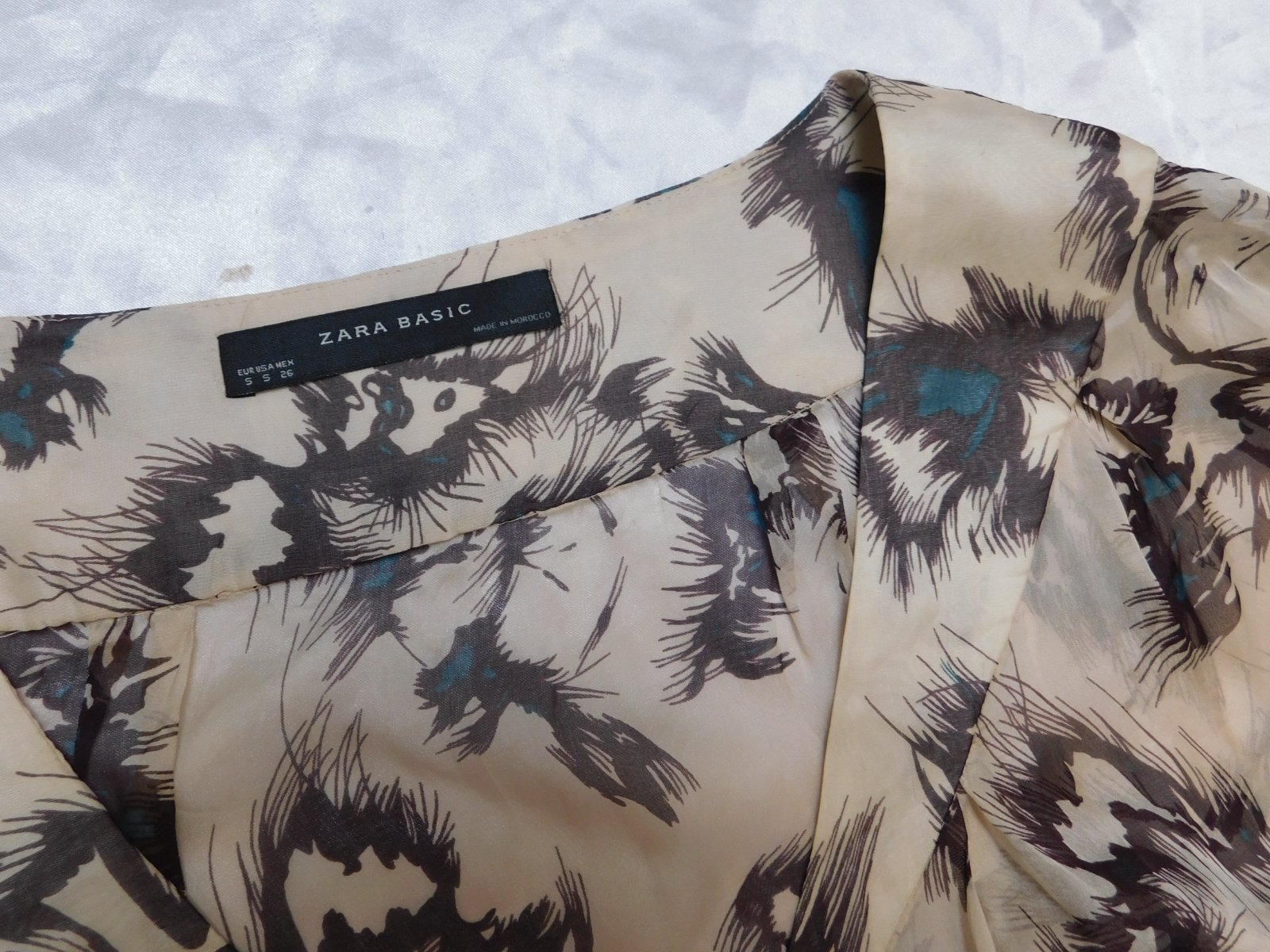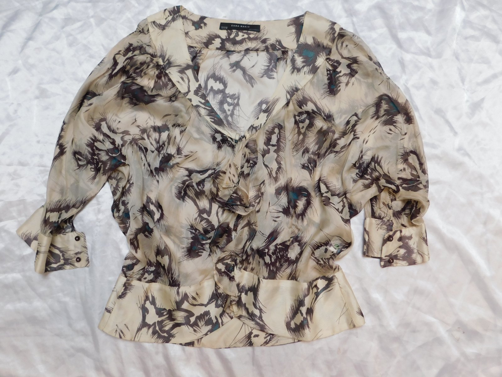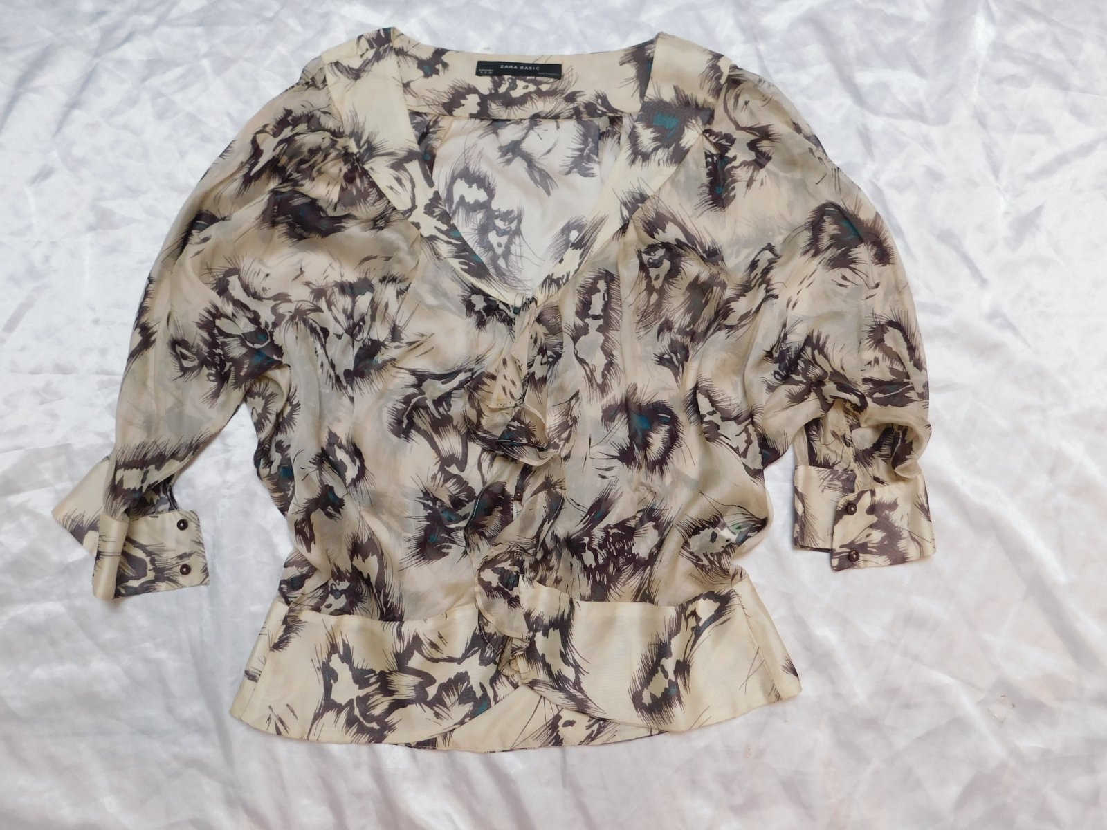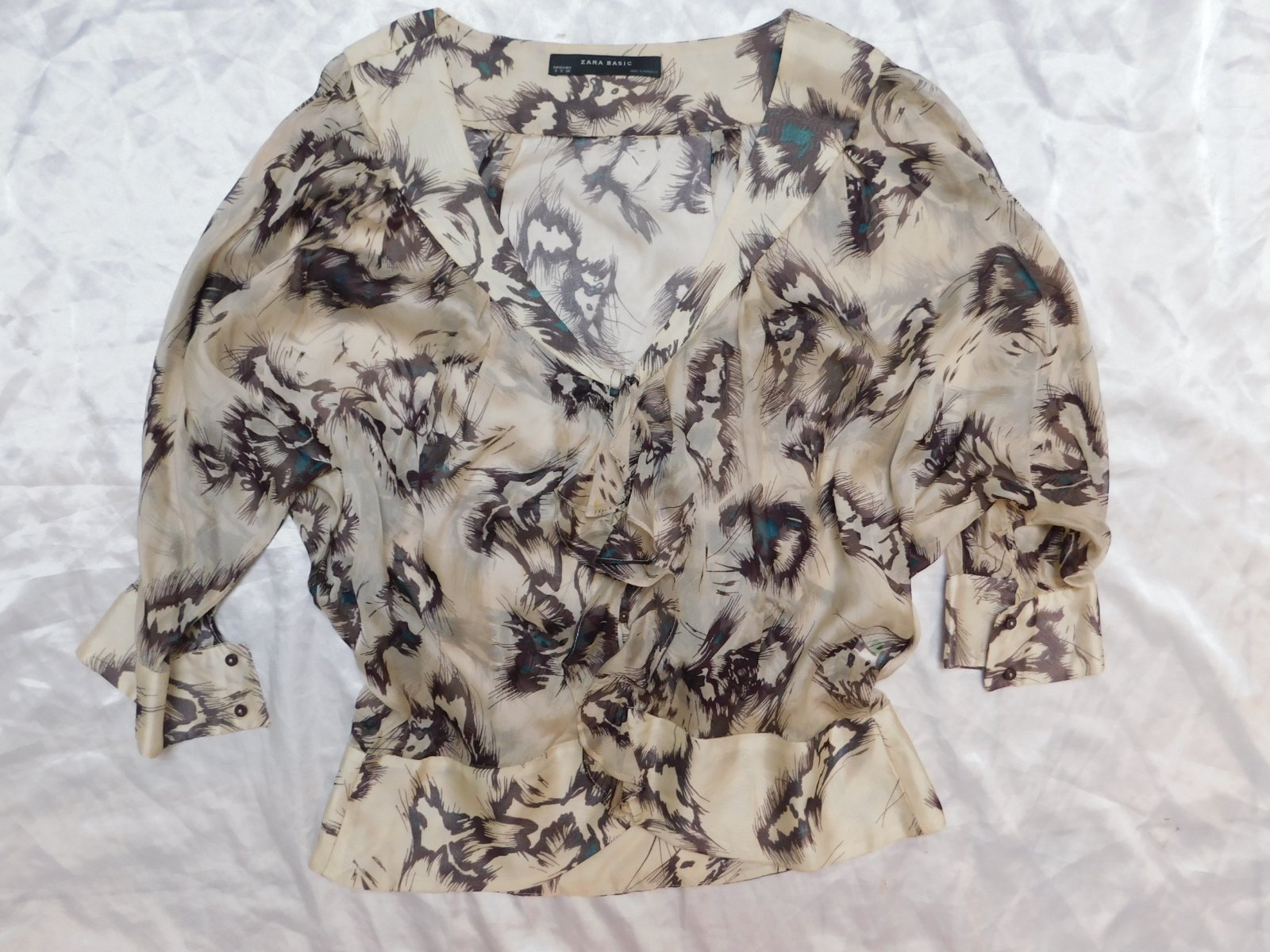 ZARA BASIC Trendy elegantna hodvabna bluzka kremovej farby so vzorom,z mierne priesvitneho materilau.100%hodvab.ako nova. m