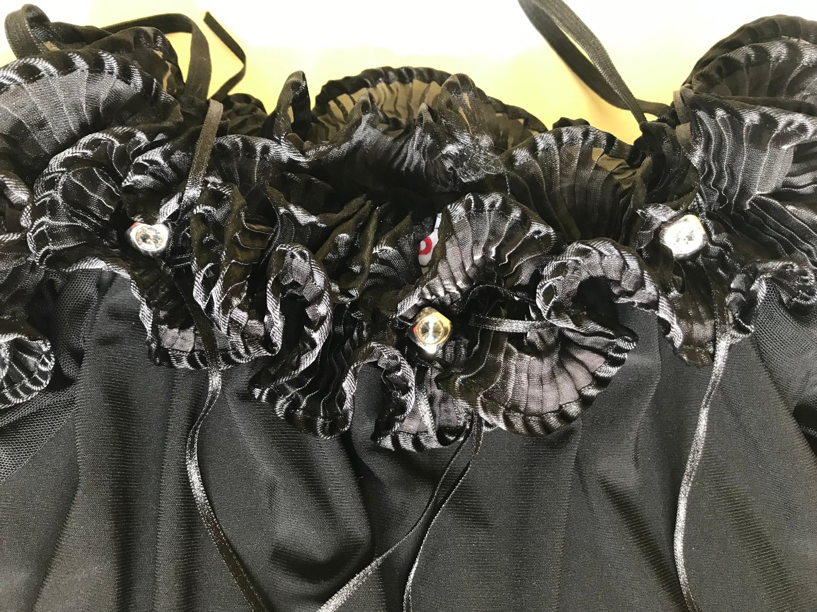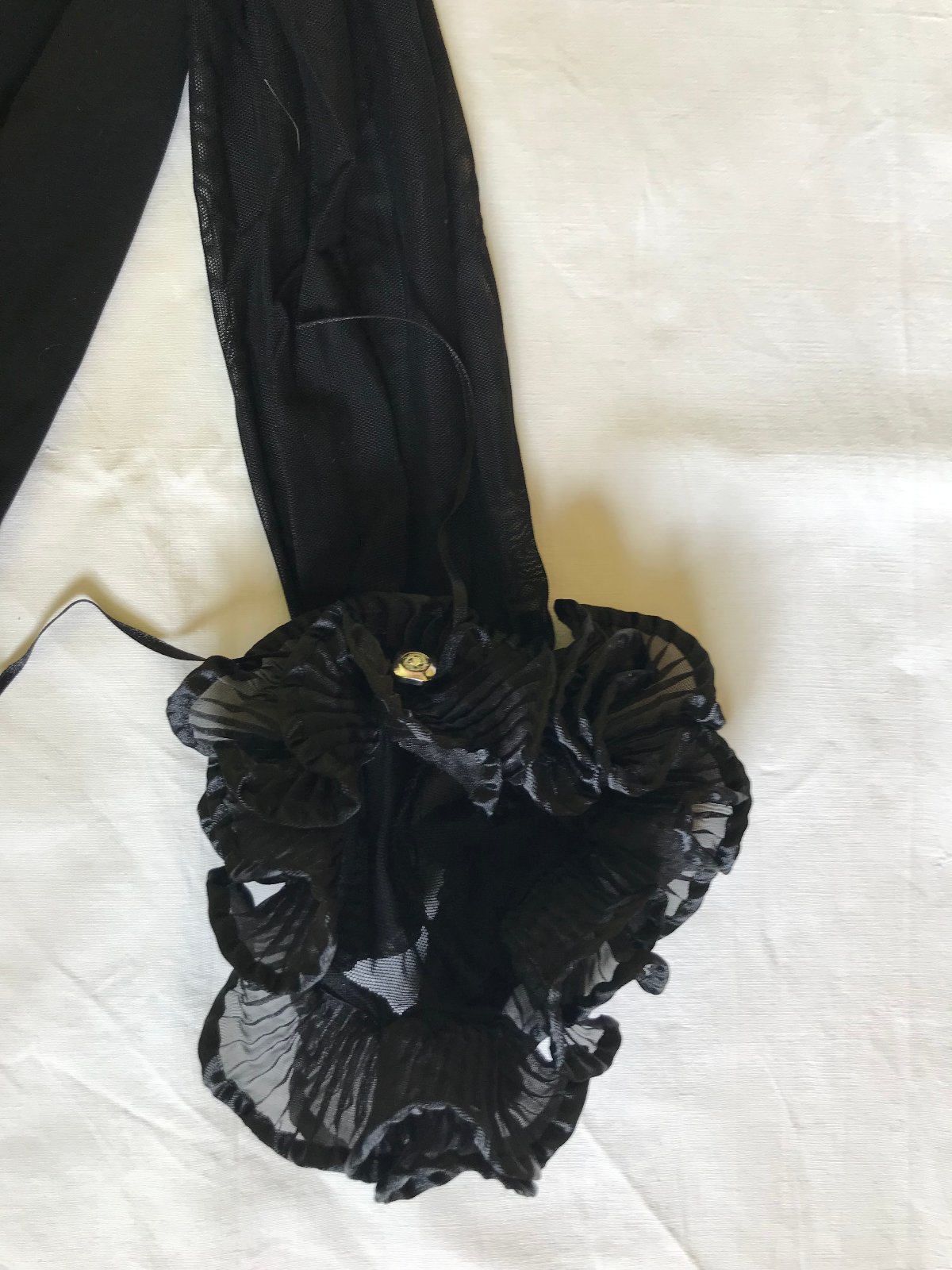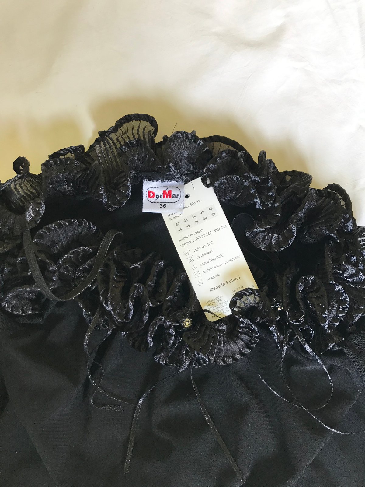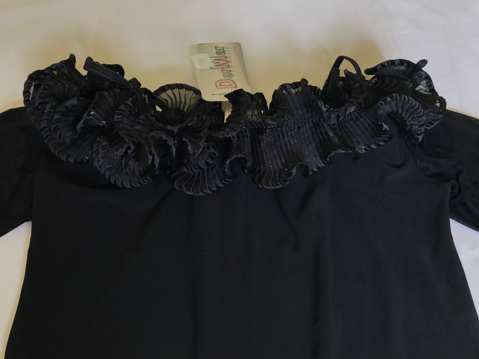 Predám čiernu elastickú blúzka na ramienka, veľ. "36". Nová s visačkou. Elastický materiál, polyester, viskóza. Okolo ramien a rukávov vejárovito nazberaný lem s dekoračnými kamienkami. Stredná časť nie je priesvitná, priesvitné sú len rukávy - viď foto. Rukávy majú naspodu asymetrický strih.