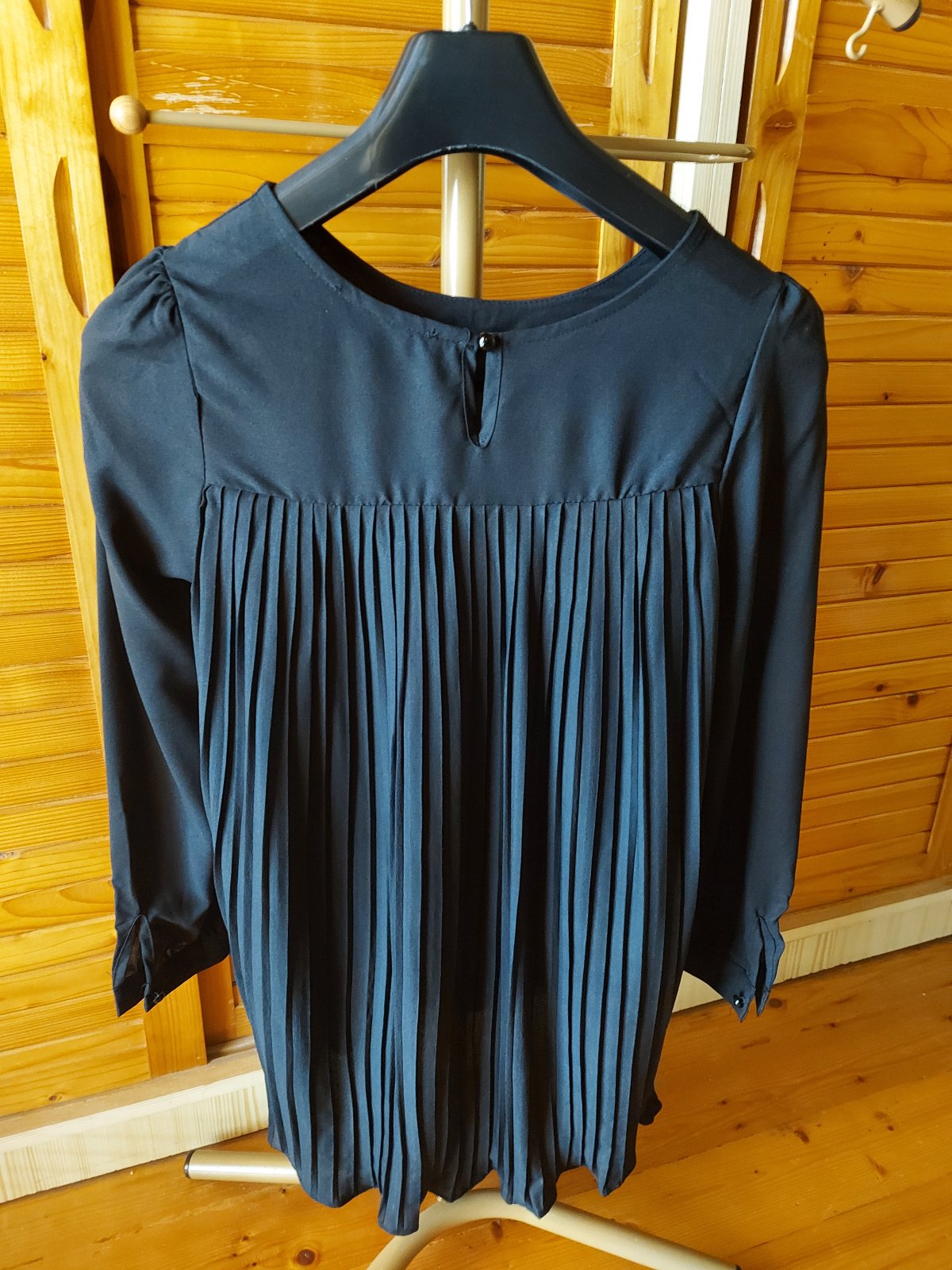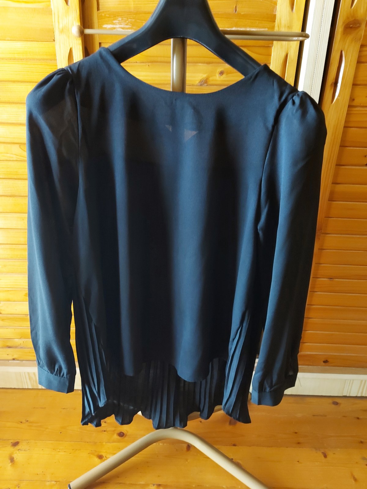 Blúzka s plisovaním na zadnom diele, ktorý je dlhší, zapínanie na zadnom diele na 1 gombík, predný diel hladký kratší, rukávy mierne nazberané ukončené zapínaním na gombík s užšou manžetou, š. pod pazuchami 44,5, d. zadného dielu 71, d. predného dielu 53, d. rukáva 58, materiál je máličko elastický. Blúzka nebola ani raz oblečená.
