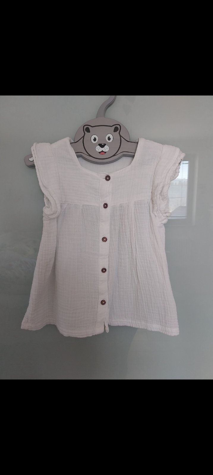 Ponúkam krásnu košeľu s volanom. U nás využitá len 2x, lebo napriek väčšiemu číslu malu otlacala gumicka na rukáve. Žiadne fľaky a diery, top stav. Dĺžka 36cm, šírka 32cm, rukav od goliera 39 cm.