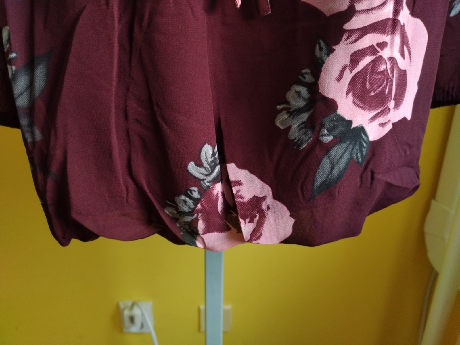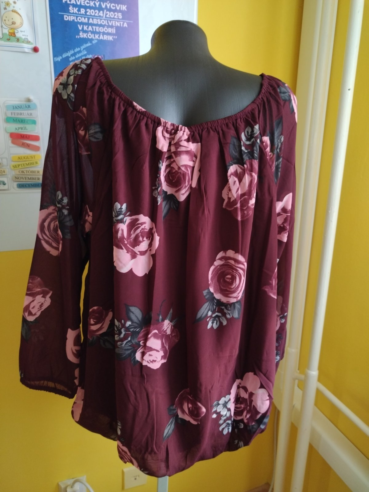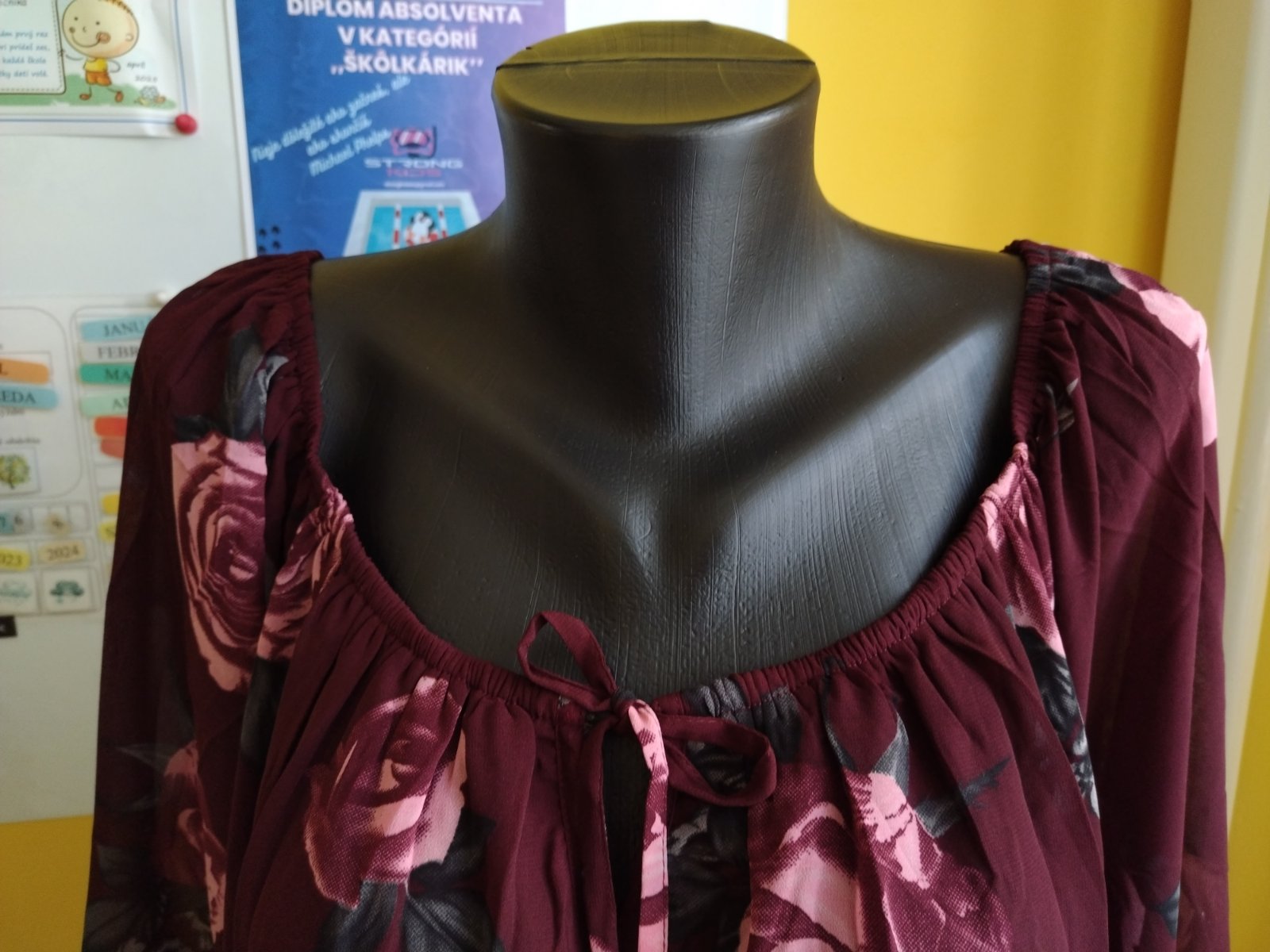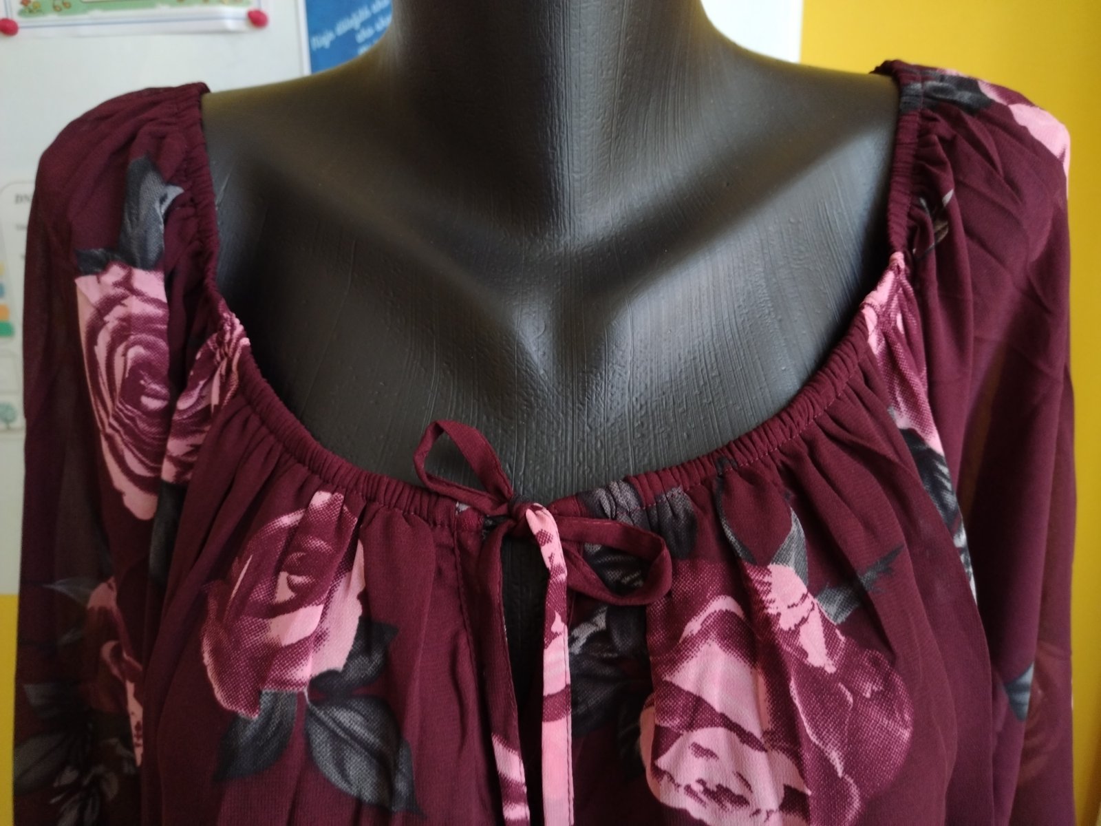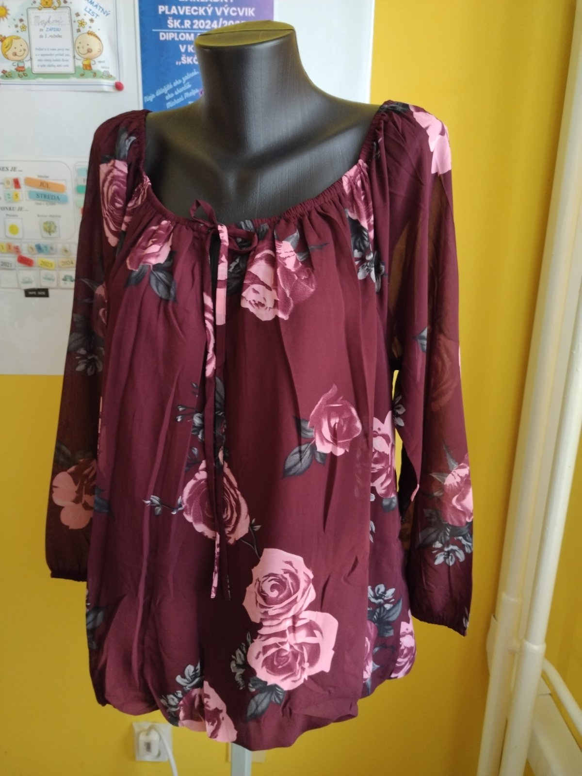 Bordová kvetovaná blúzka, veľkosť 48, značka Bodyflirt, blúzka je podšitá, vo výstrihu viazanie, v páse gumička.