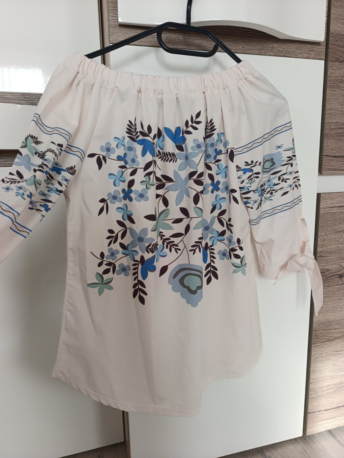 Blúzka jemnej ružovkastej farby s krásnym vrozom kvetov, na rukávoch je viazanie, guma okolo výstrihu- dá sa nosiť na štýl Carmen stiahnutá na ramená... Top stav. Pri výmene 7€