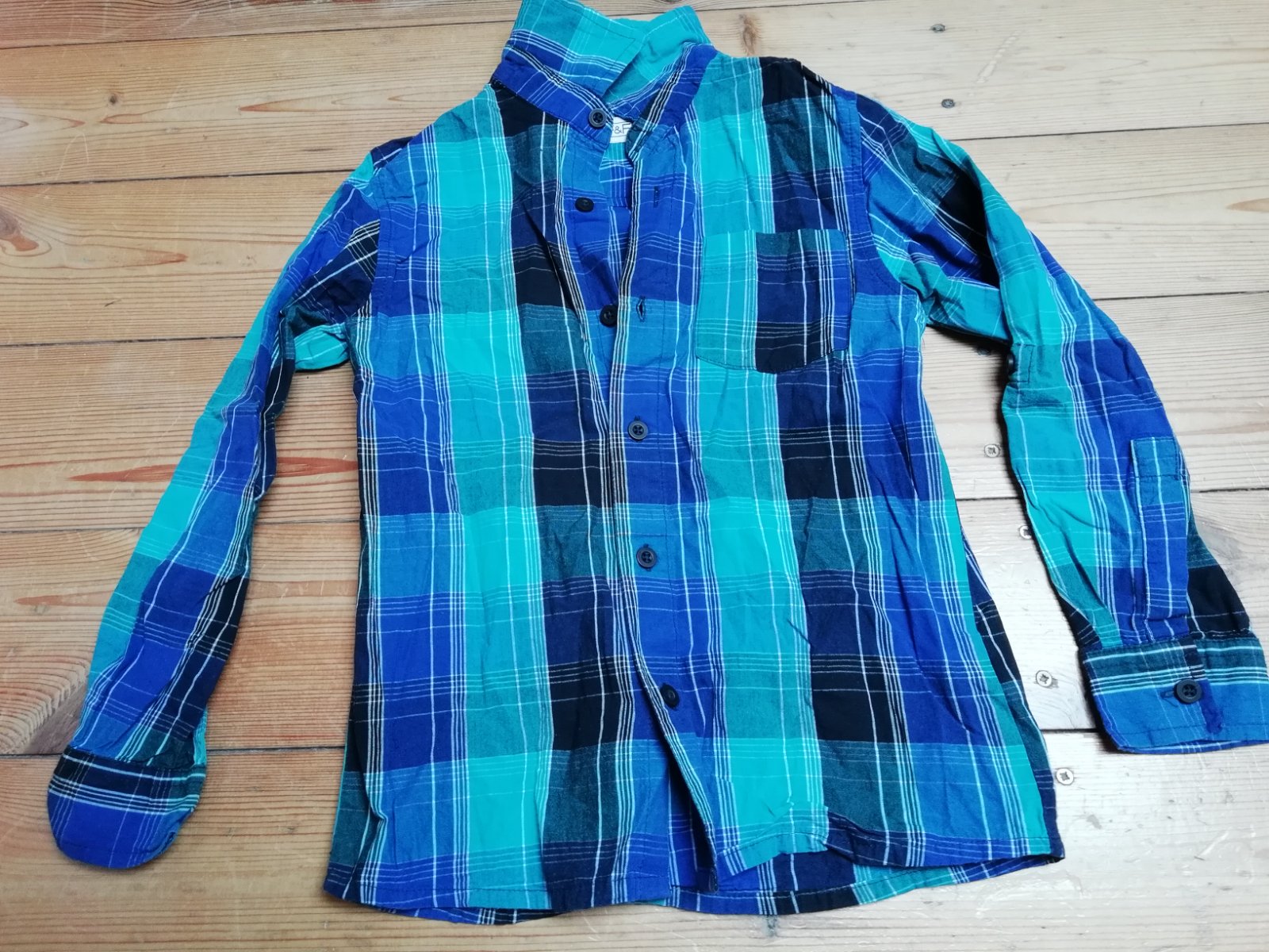 Chlapčenská bavlnená košeľa, jedno náprsné vrecko, rukávy na vyhrnutie. V perfektnom, bezchybnom stave. (bez trička, to je len na ilustračné účely) Rozmery: dĺžka 50-52 cm (mierne zaoblený spodný o...