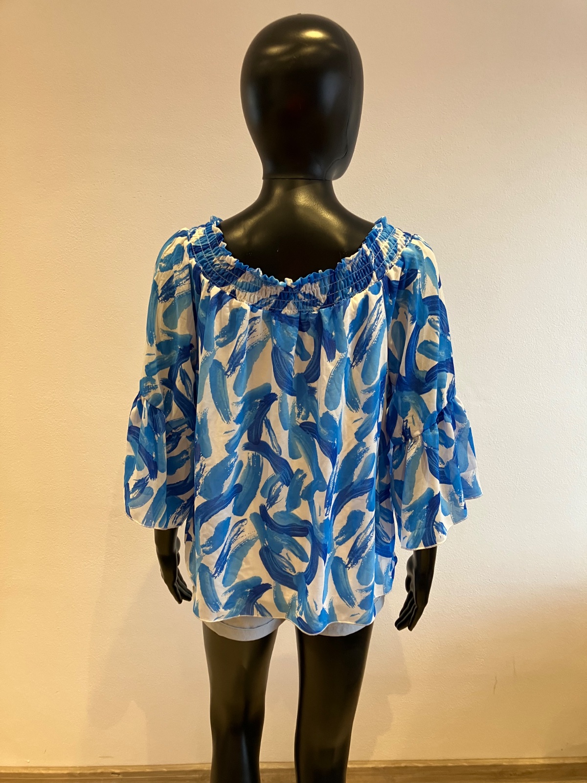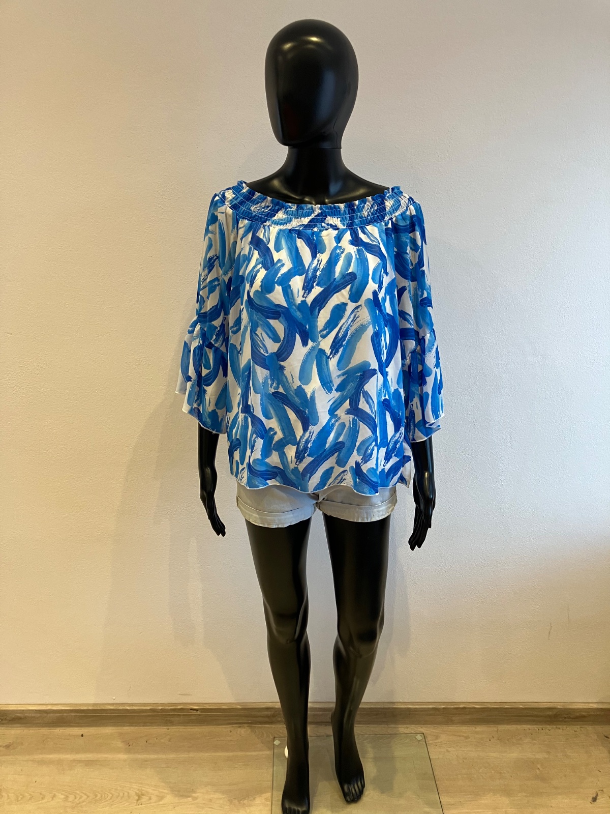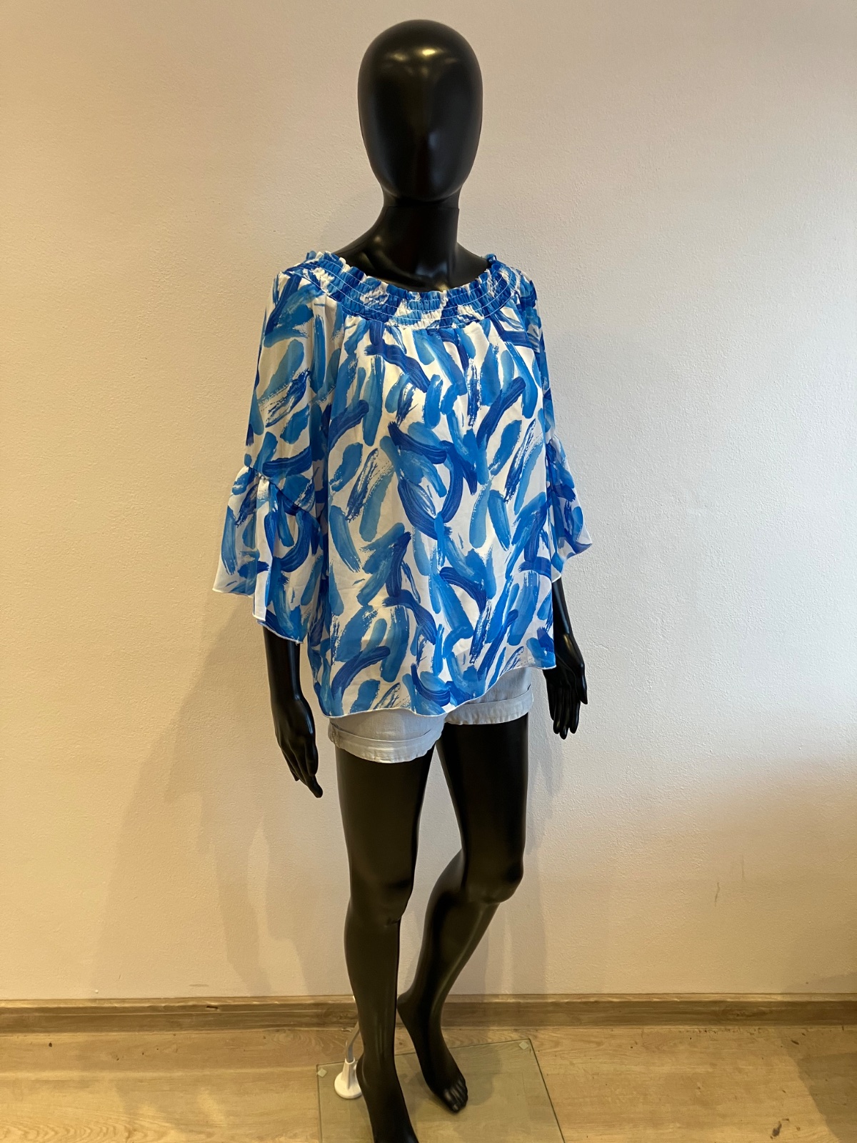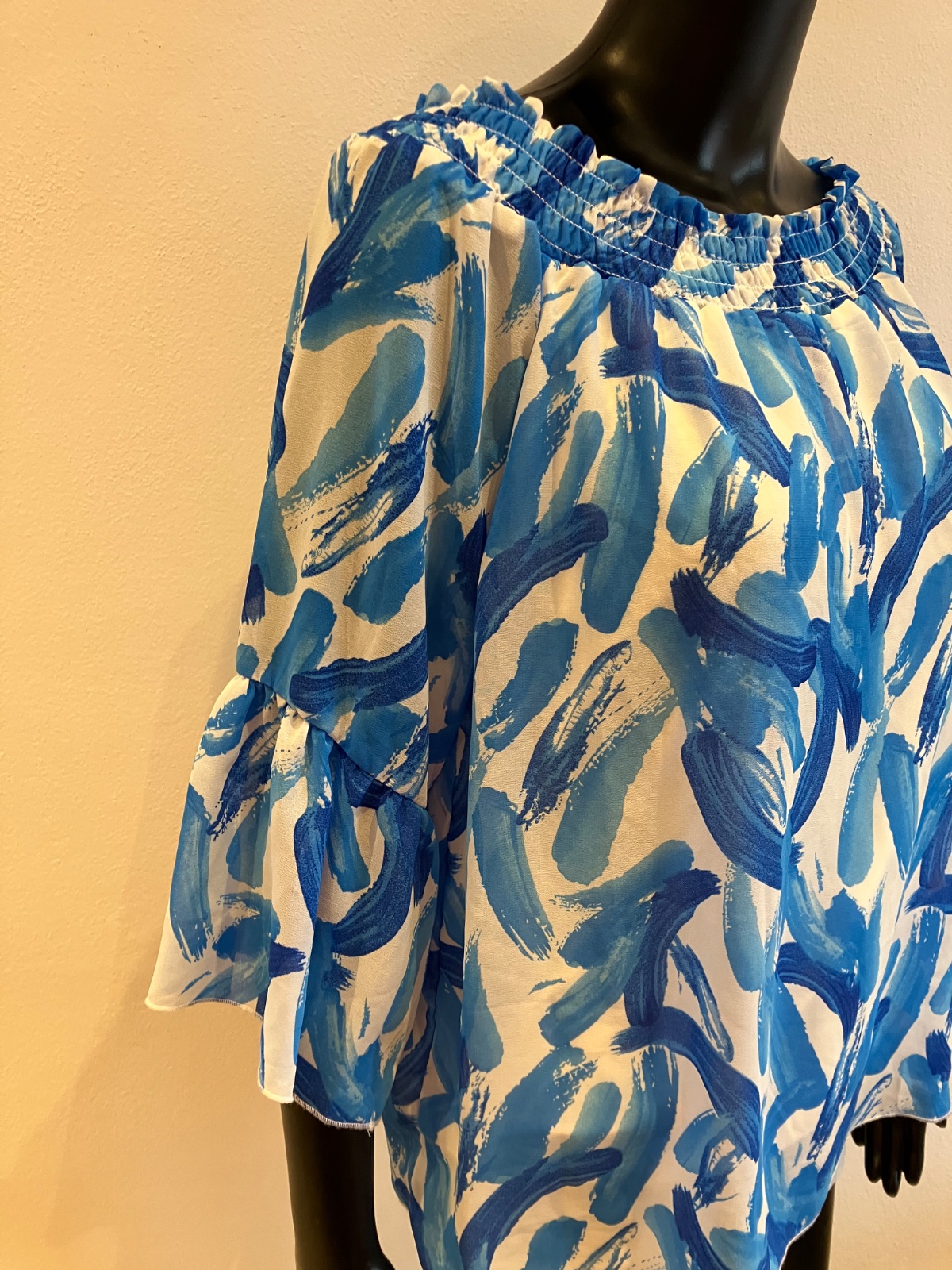 Dámska blúzka s trojštvrťovými zvonovými rukávmi, na ramene s elastickou gumou, jemne elastická, rukávy sú priesvitné, pod blúzkou tenké biele tričko, farba bielo modrá, materiál 96%viskóza 4%elastan.