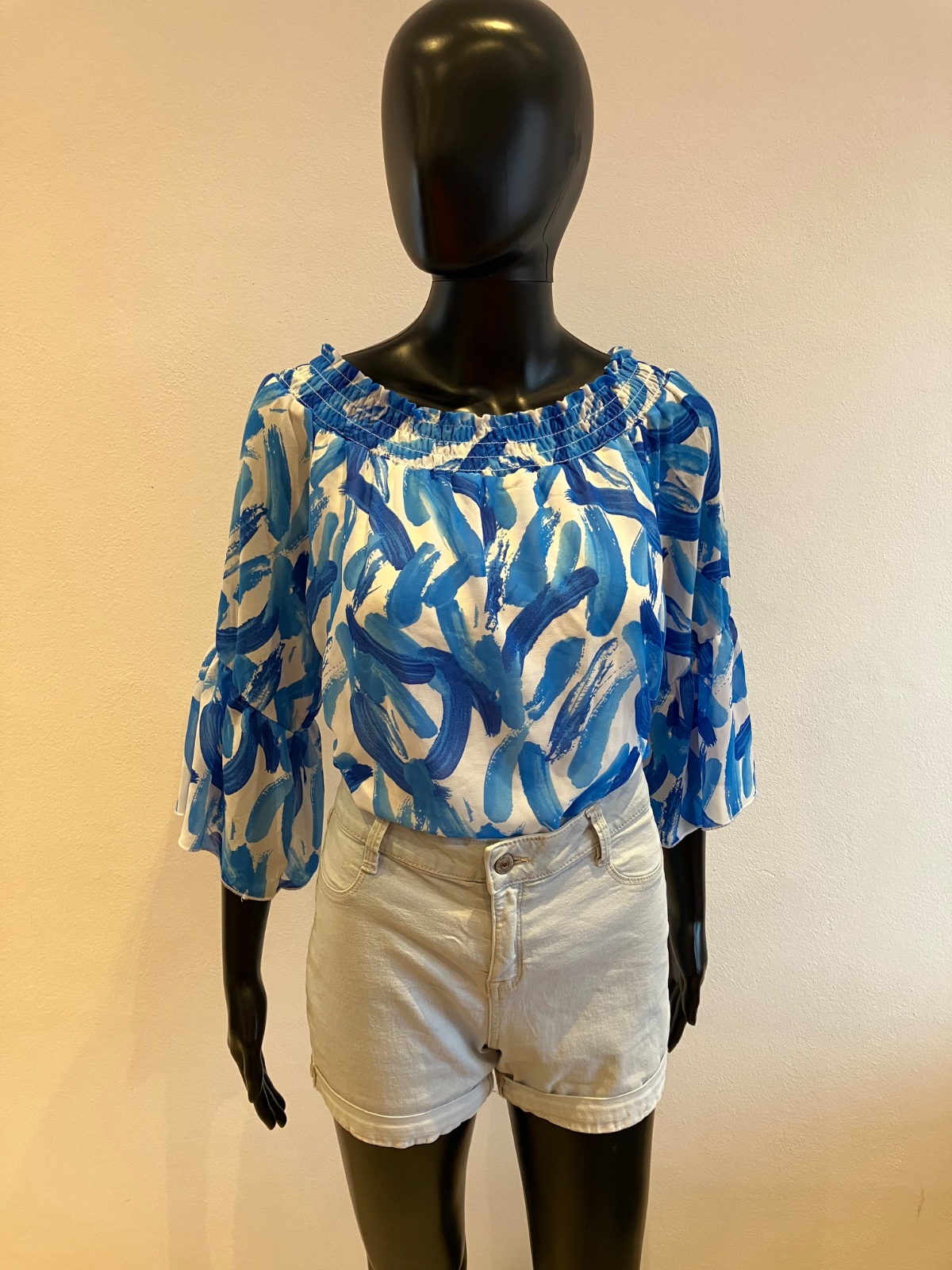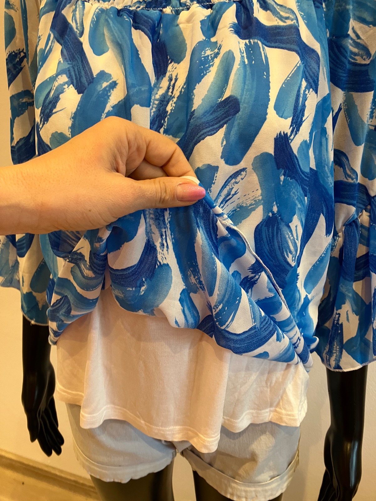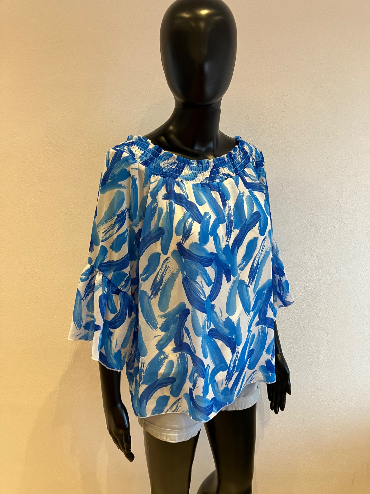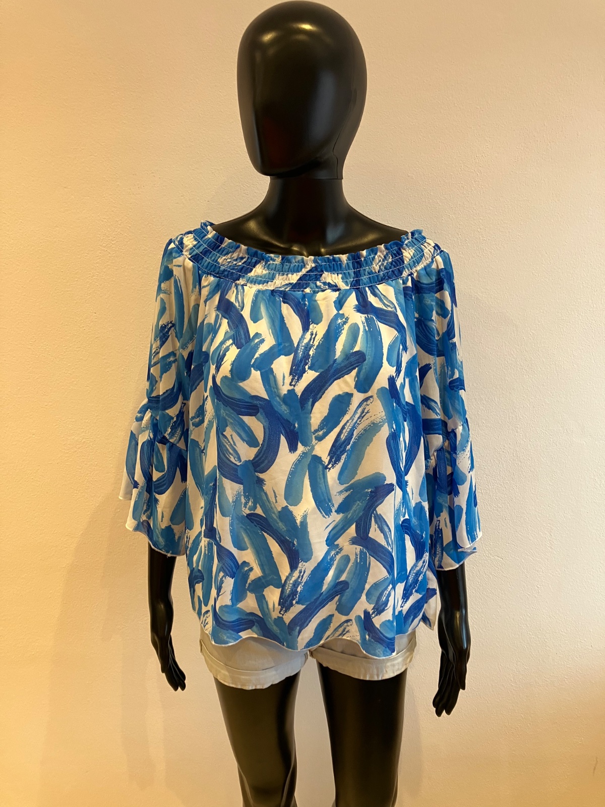 Dámska blúzka s trojštvrťovými zvonovými rukávmi, na ramene s elastickou gumou, jemne elastická, rukávy sú priesvitné, pod blúzkou tenké biele tričko, farba bielo modrá, materiál 96%viskóza 4%elastan.