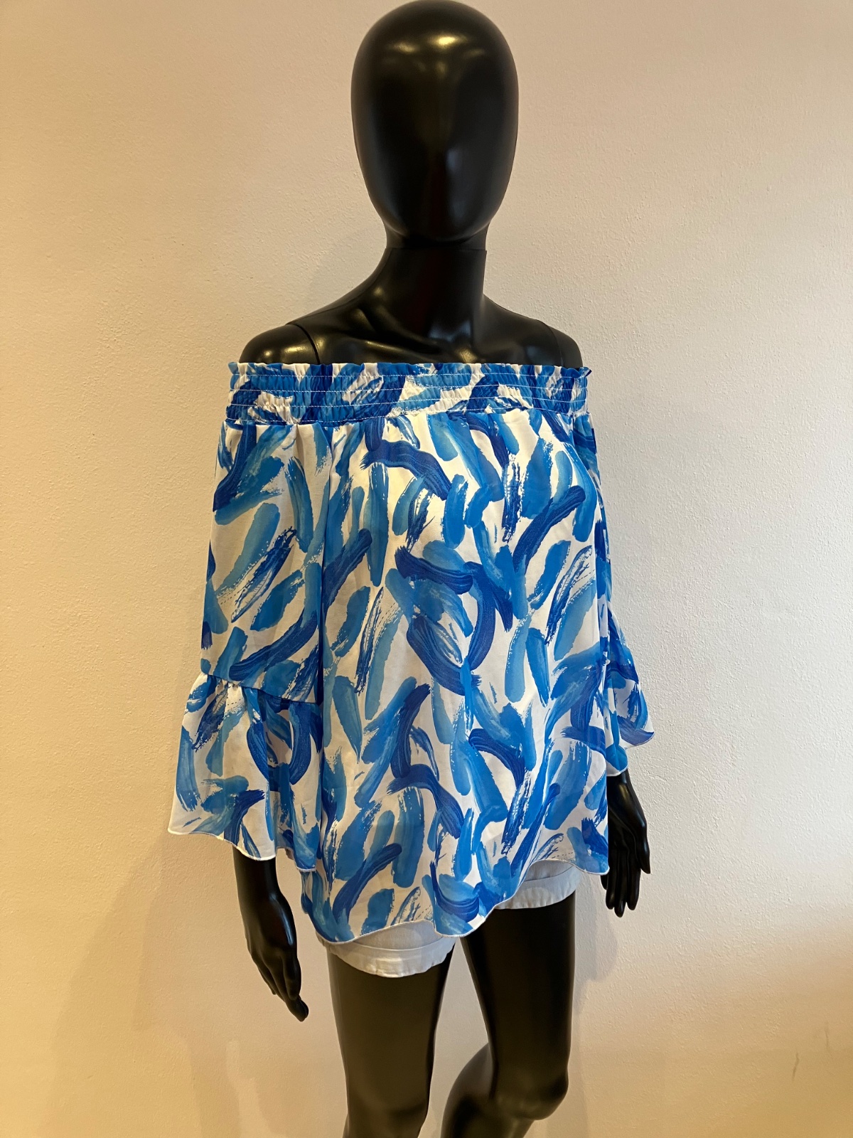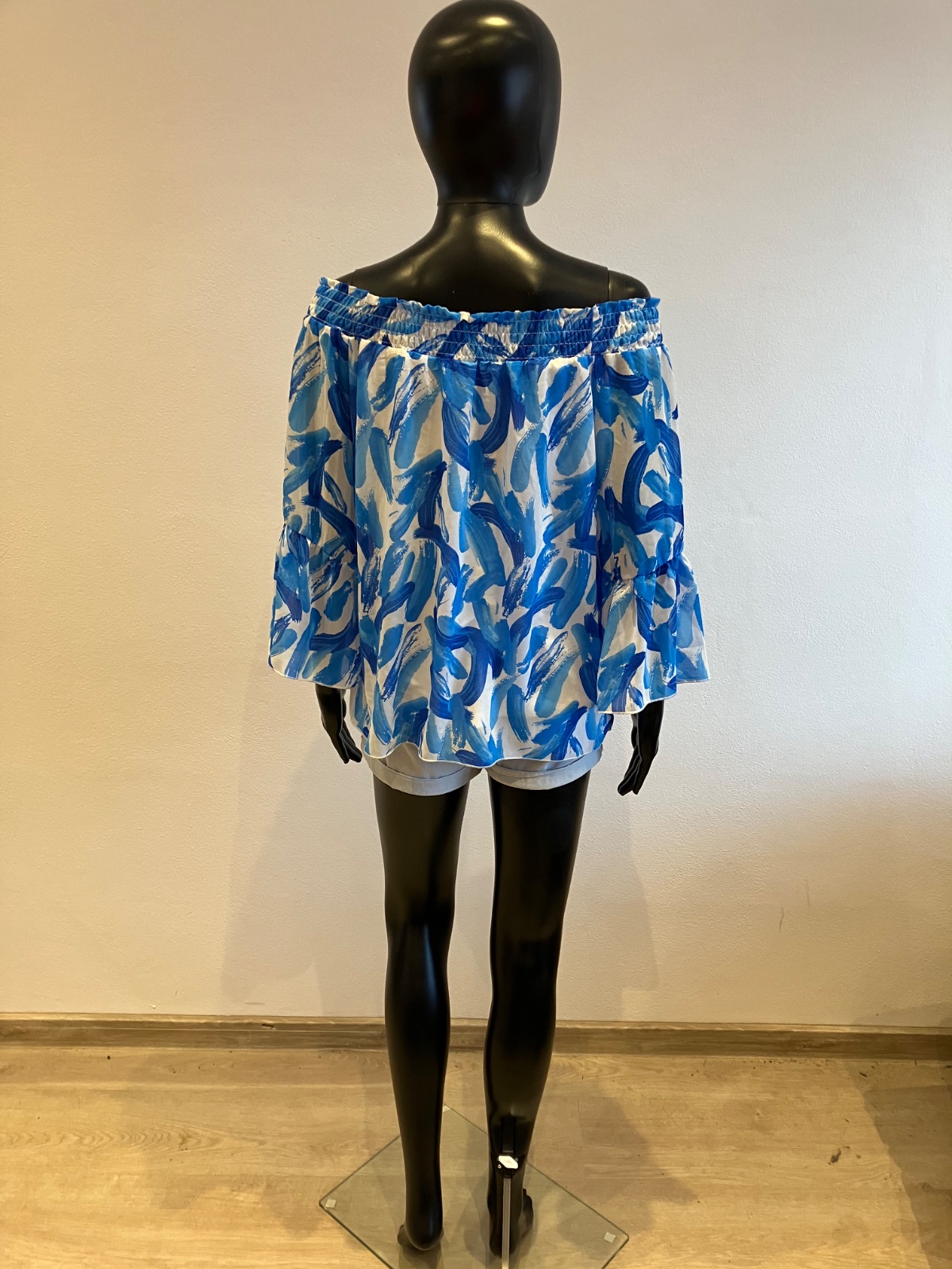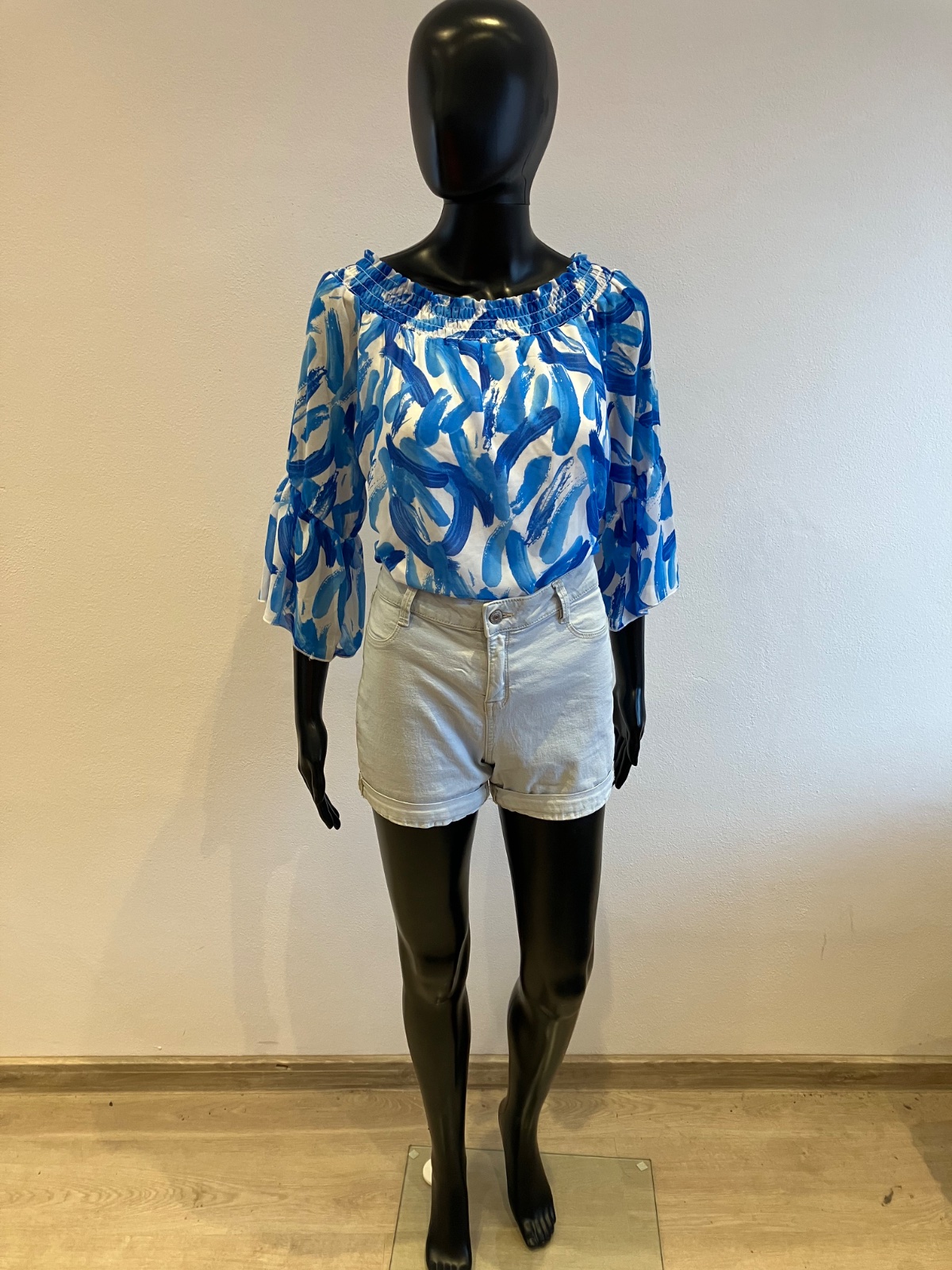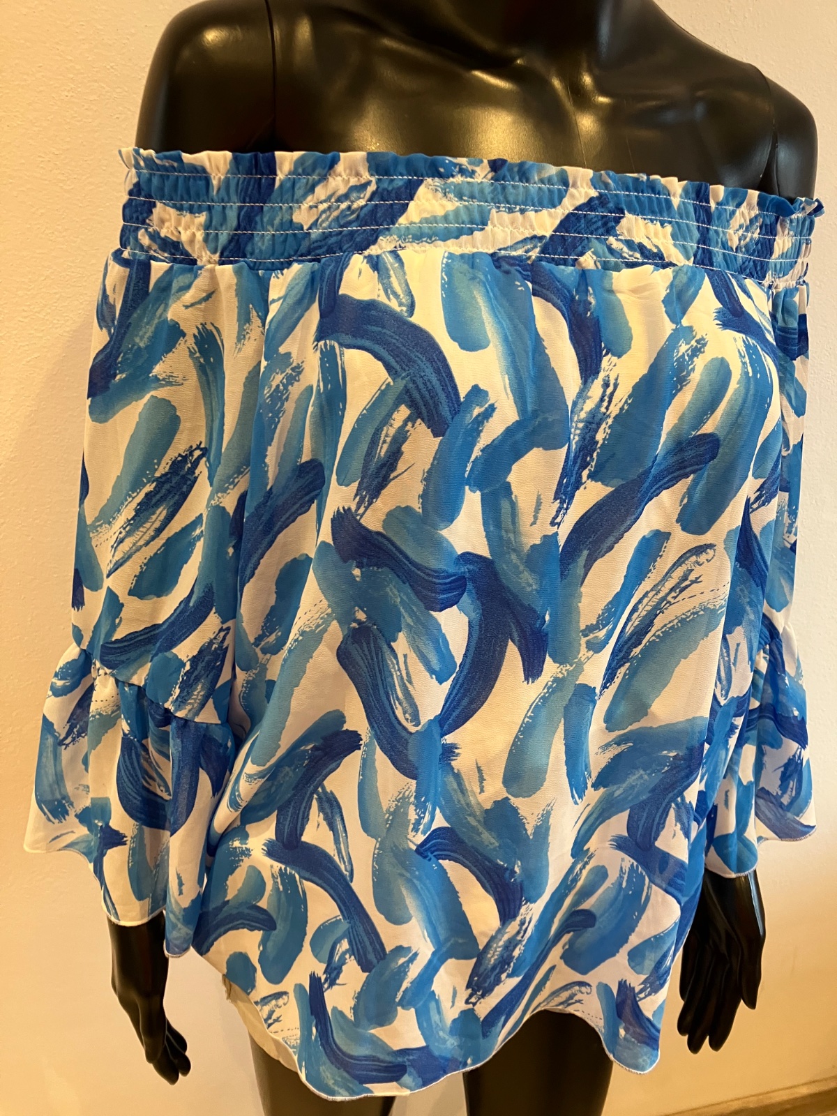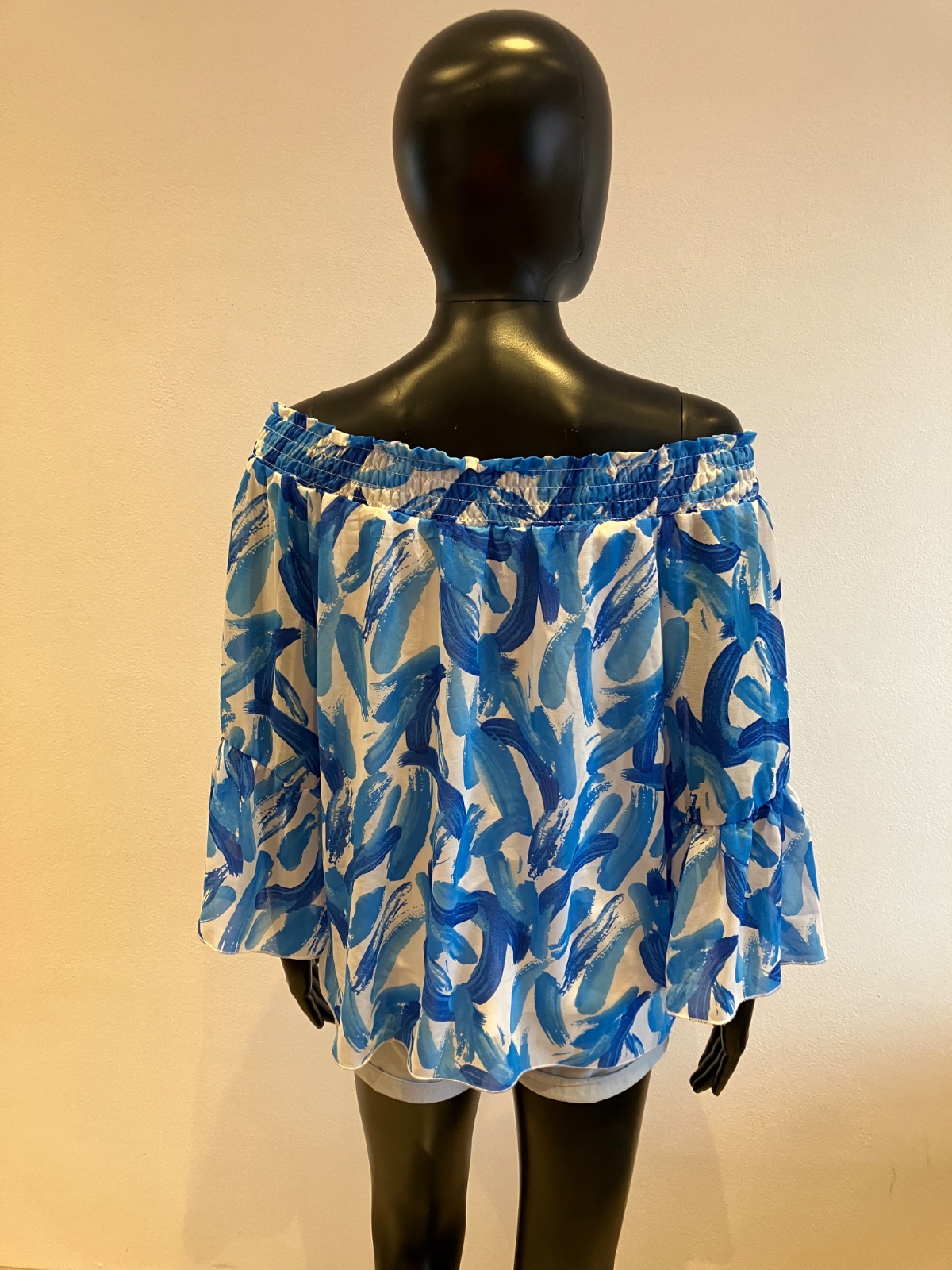 Dámska blúzka s trojštvrťovými zvonovými rukávmi, na ramene s elastickou gumou, jemne elastická, rukávy sú priesvitné, pod blúzkou tenké biele tričko, farba bielo modrá, materiál 96%viskóza 4%elastan.