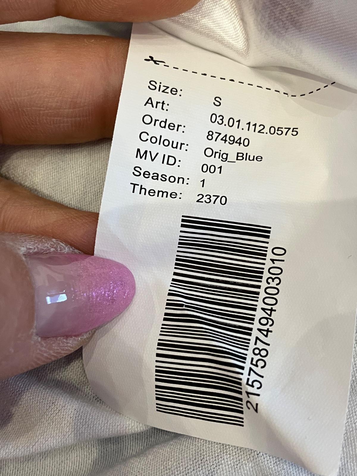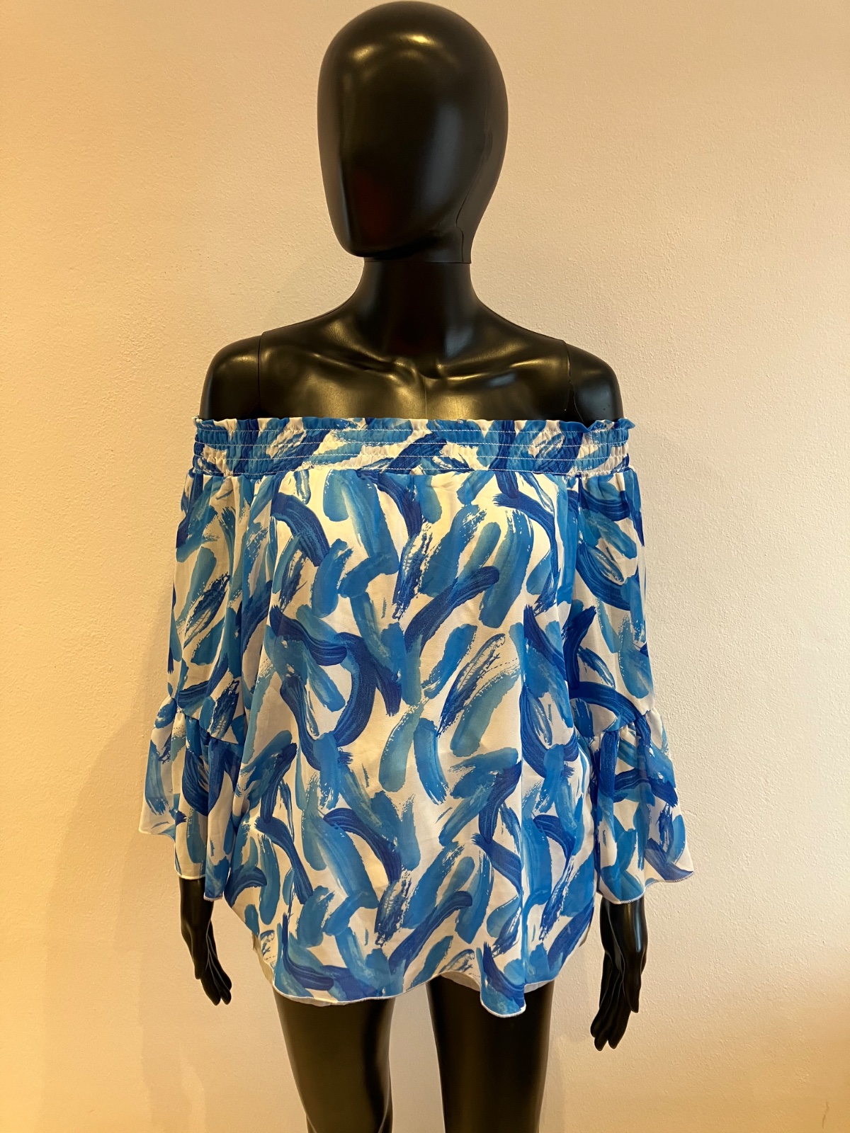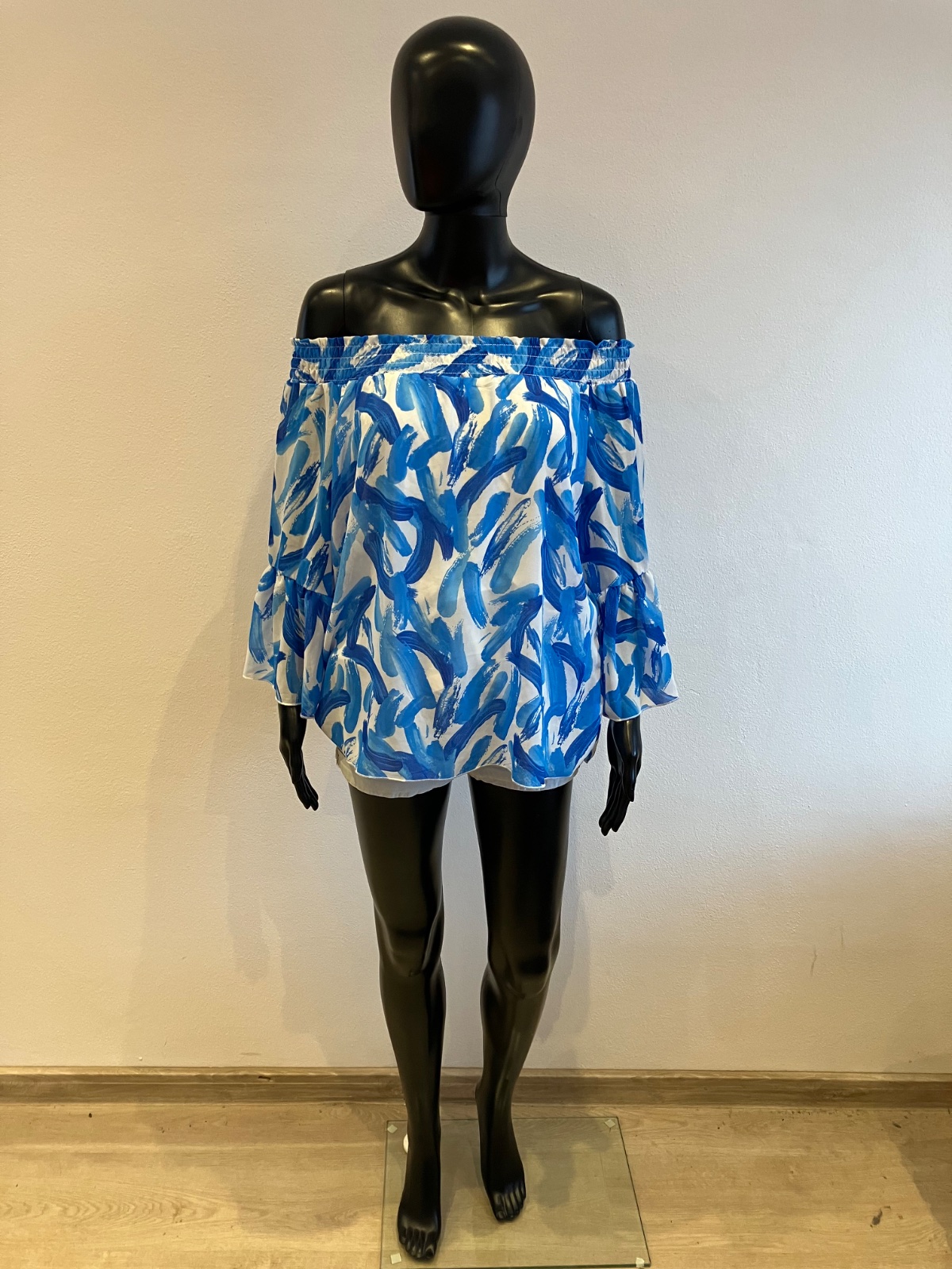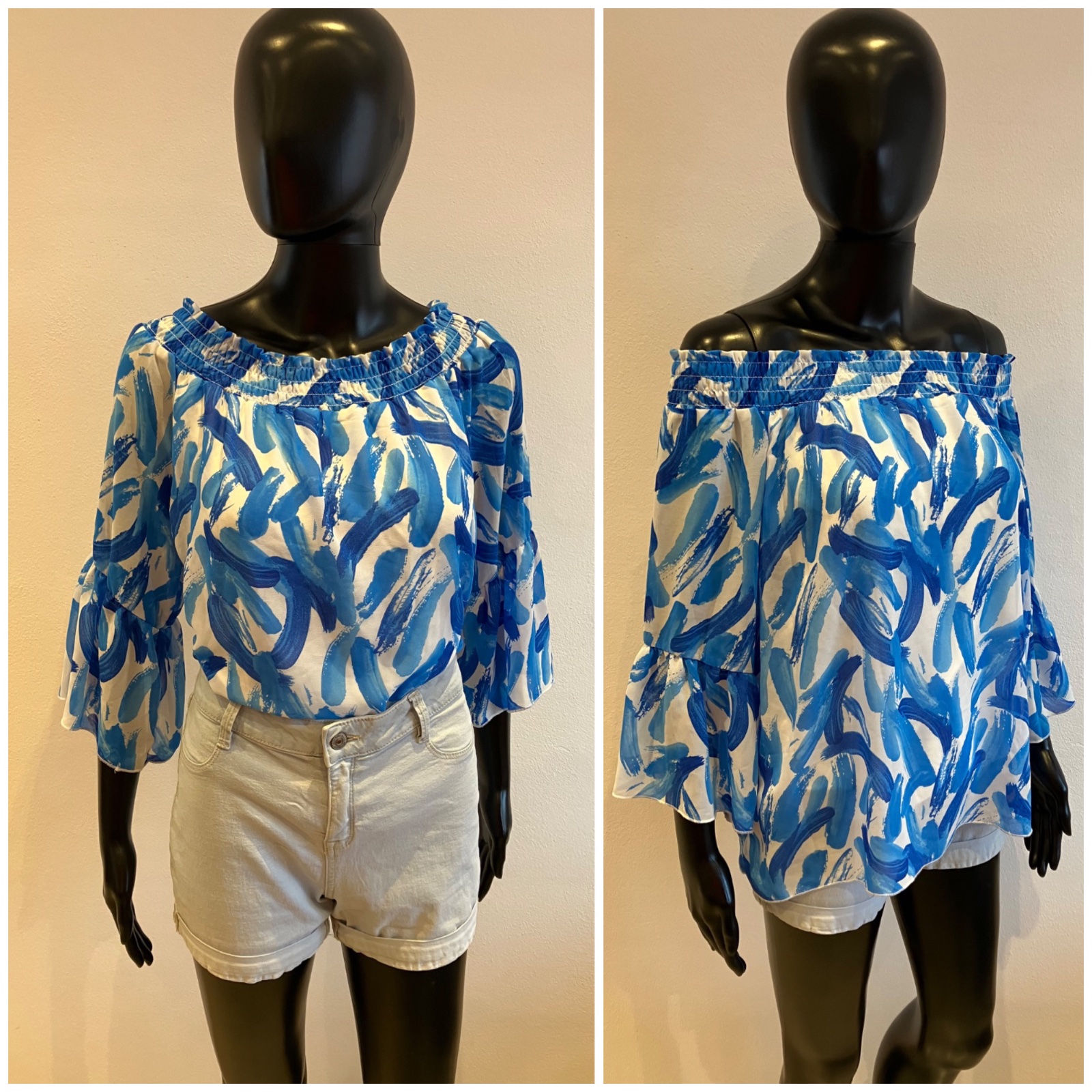Dámska blúzka s trojštvrťovými zvonovými rukávmi, na ramene s elastickou gumou, jemne elastická, rukávy sú priesvitné, pod blúzkou tenké biele tričko, farba bielo modrá, materiál 96%viskóza 4%elastan.