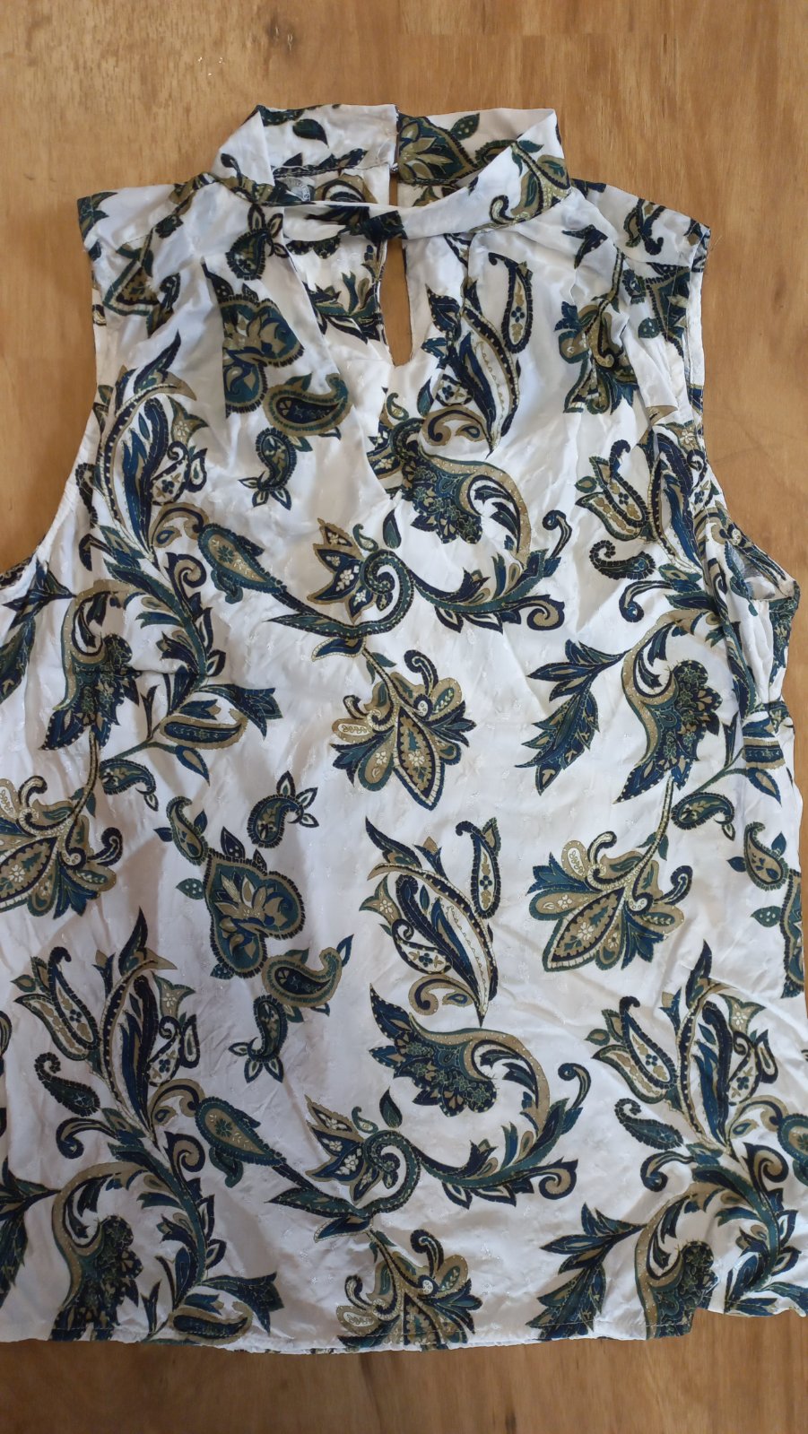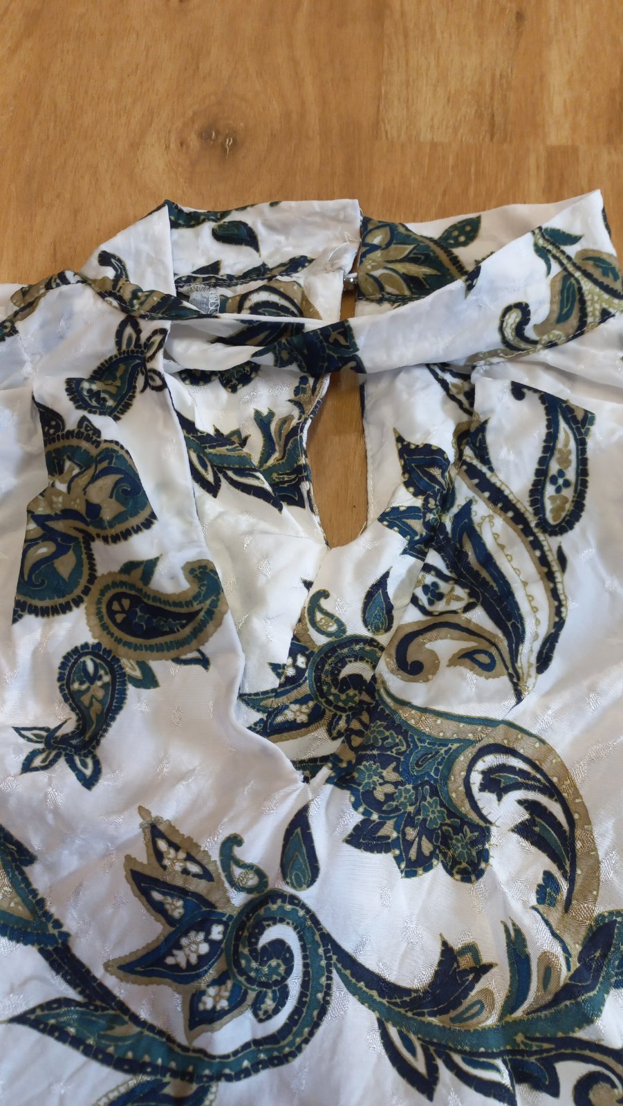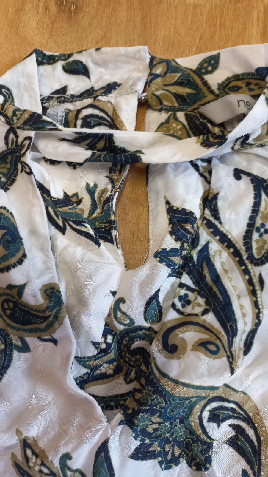 Zaujímavá, netradičná blúzka. Vpredu výstrih do V, cez ktorý ide pretočený pásik . Zapínanie vzadu. Pekný vzor. Na štítku je veľkosť 10. No kto ako chce. Kľudne premeriam