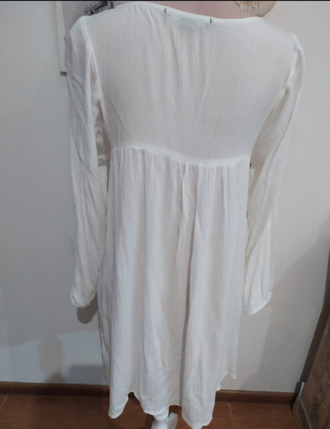 Pár krát oblečená a nepoškodená. Ľahučká a nekrčivá. Na gombíky ktoré sú schované pod lemom v predu. Mám aj veľkosť L.